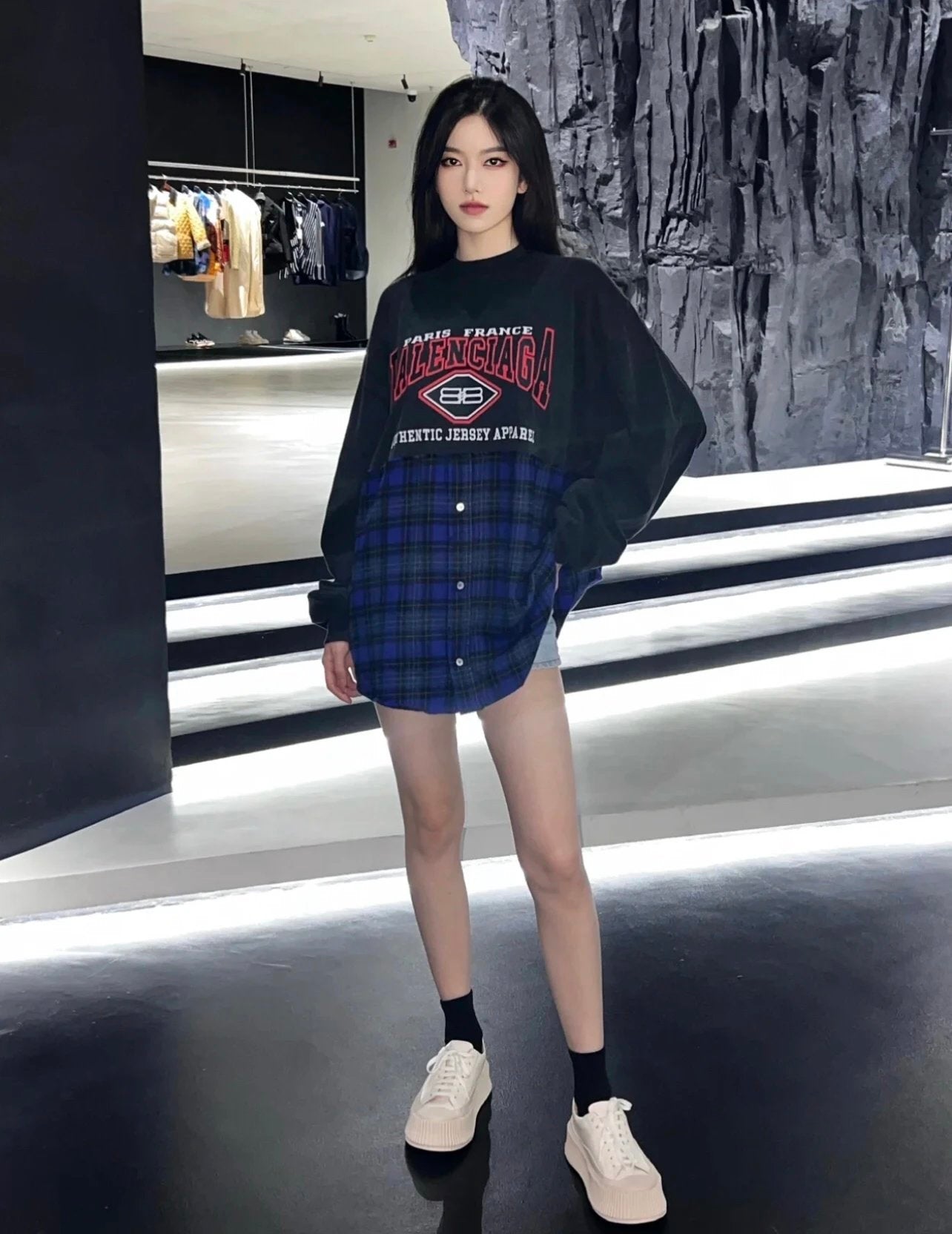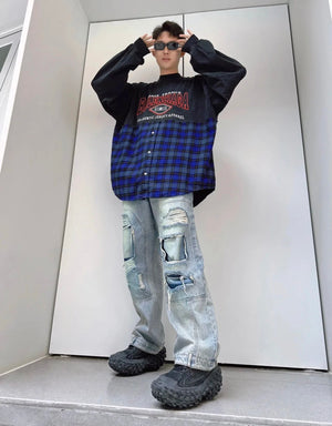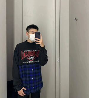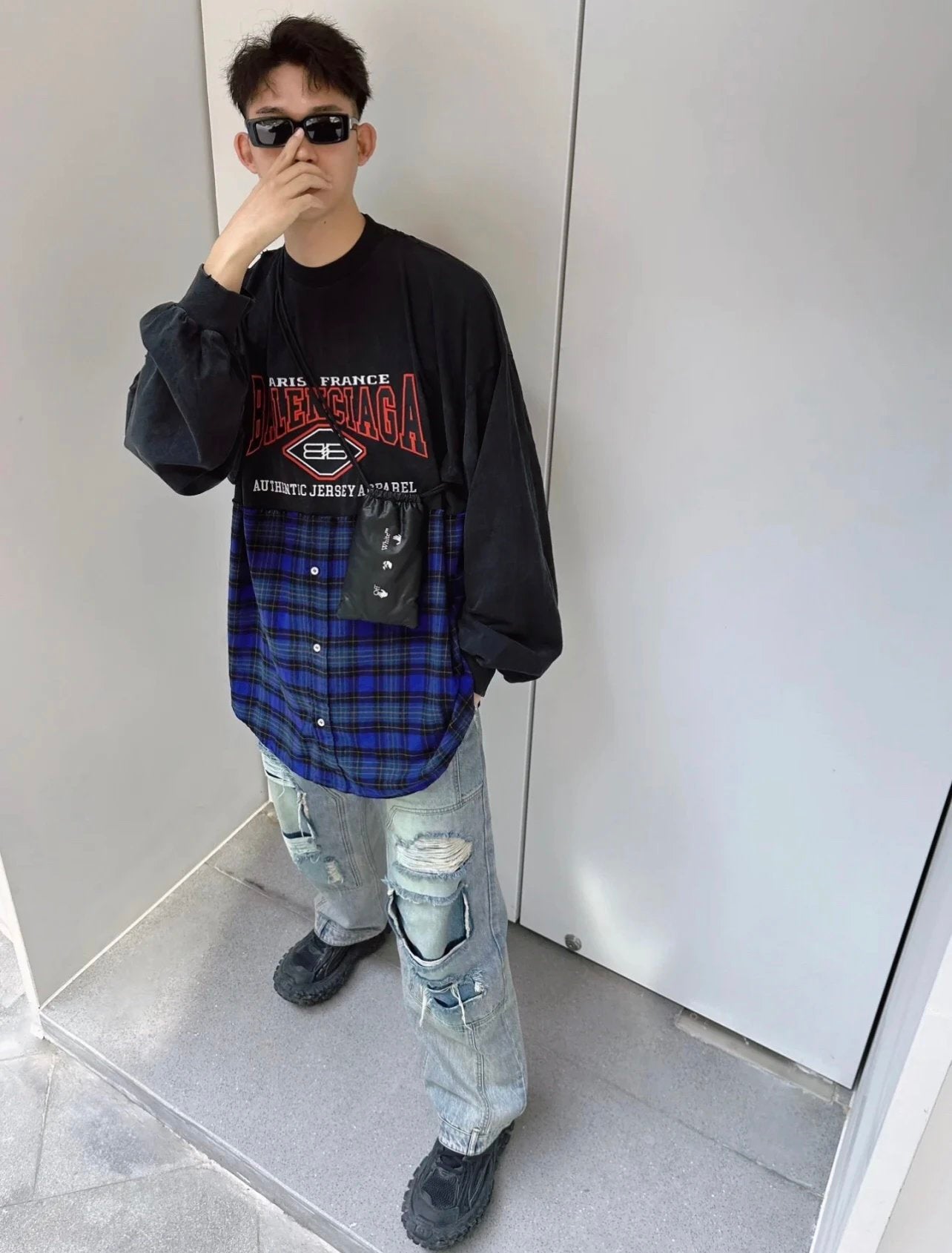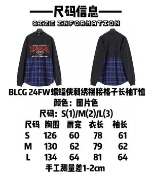 Balenciaga BLCG 24FW Batman Embroidered Patchwork Plaid Fake Two-Piece Long Sleeve T-Shirt B House Jacket Unisex