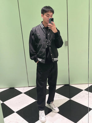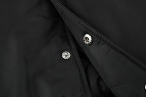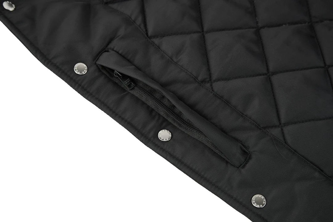 The main body fabric is made of 50-count double-sided nylon. This fabric uses a custom-woven version of double-sided nylon material.Applying glue to fabric can effectively increase thickness and achieve a three-dimensional effect.The lining is made of rayon fabric combined with Matching2600 quilted cotton material; the warmth effect of Matching2600 quilted cotton is comparable to down jackets.The thread is made from mercerized pure cotton fabric custom-woven, with dimensions and spacing exactly like the original version.The chest is adorned with an enamel-coated metal triangle logo, the leather base uses top-layer soft cowhide with double-layer composite, and the face features stainless steel electroplated letters, highlighting the brand's style.The buttons are made with original spray paint in a dark effect, with dimensions and colors restored to 1:1 accuracy. The bottom holes and clasps are electroplated with engraved text.The zipper uses the original No. 3 nylon teeth zipper with electroplated engraving.This vest is meticulously crafted from double-sided nylon, highlighting an elegant silhouette with exquisite details.The delicate padding and filling create a comfortable fit experience, while the middle button closure and stand-up collar design add sophistication.