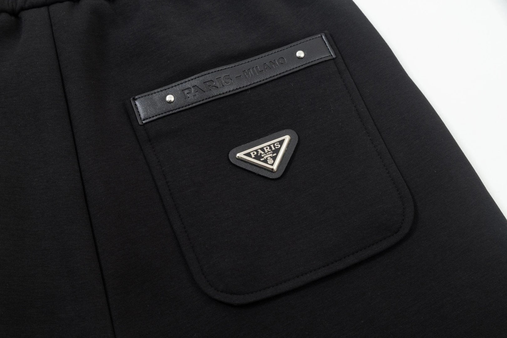 Custom Woven and Dyed Pure Cotton Material Comfortable and Soft Side Black and White Patchwork Webbing, English Letter Logo Triangle Mark, Side Pocket Loose Fit Unisex Simple Versatile Style Perfectly Managed.
