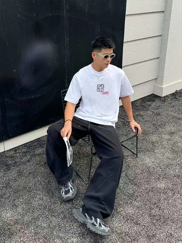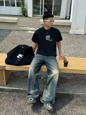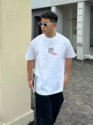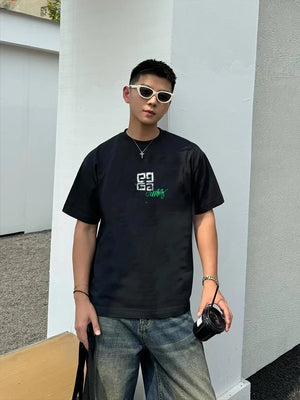 Ji Fan * Xi 2025 Spring and Summer New Classic Splash-Ink Letter Totem Printing Custom Double Yarn Plain Cotton Fabric Short Sleeve T-shirt for Men and Women