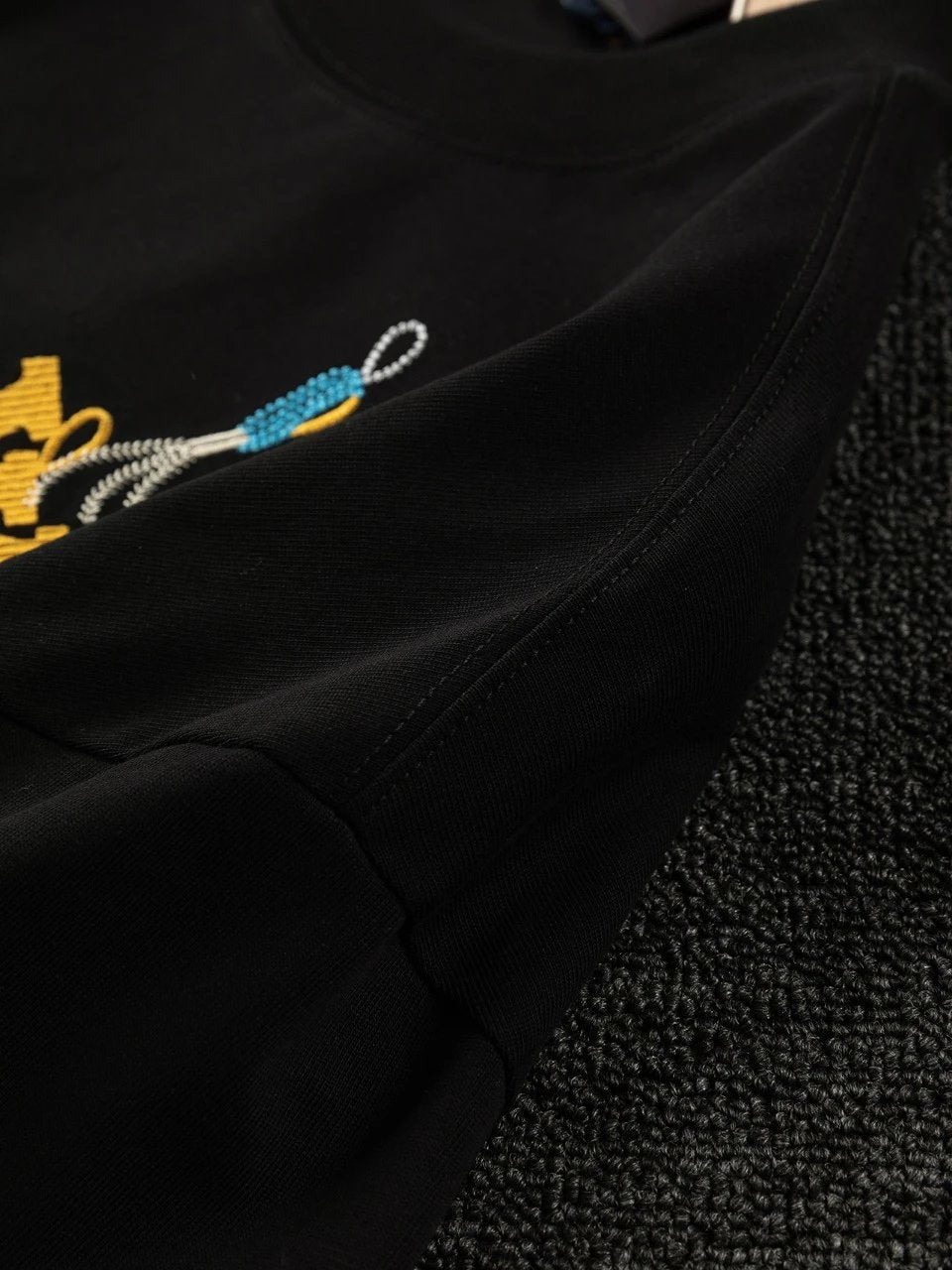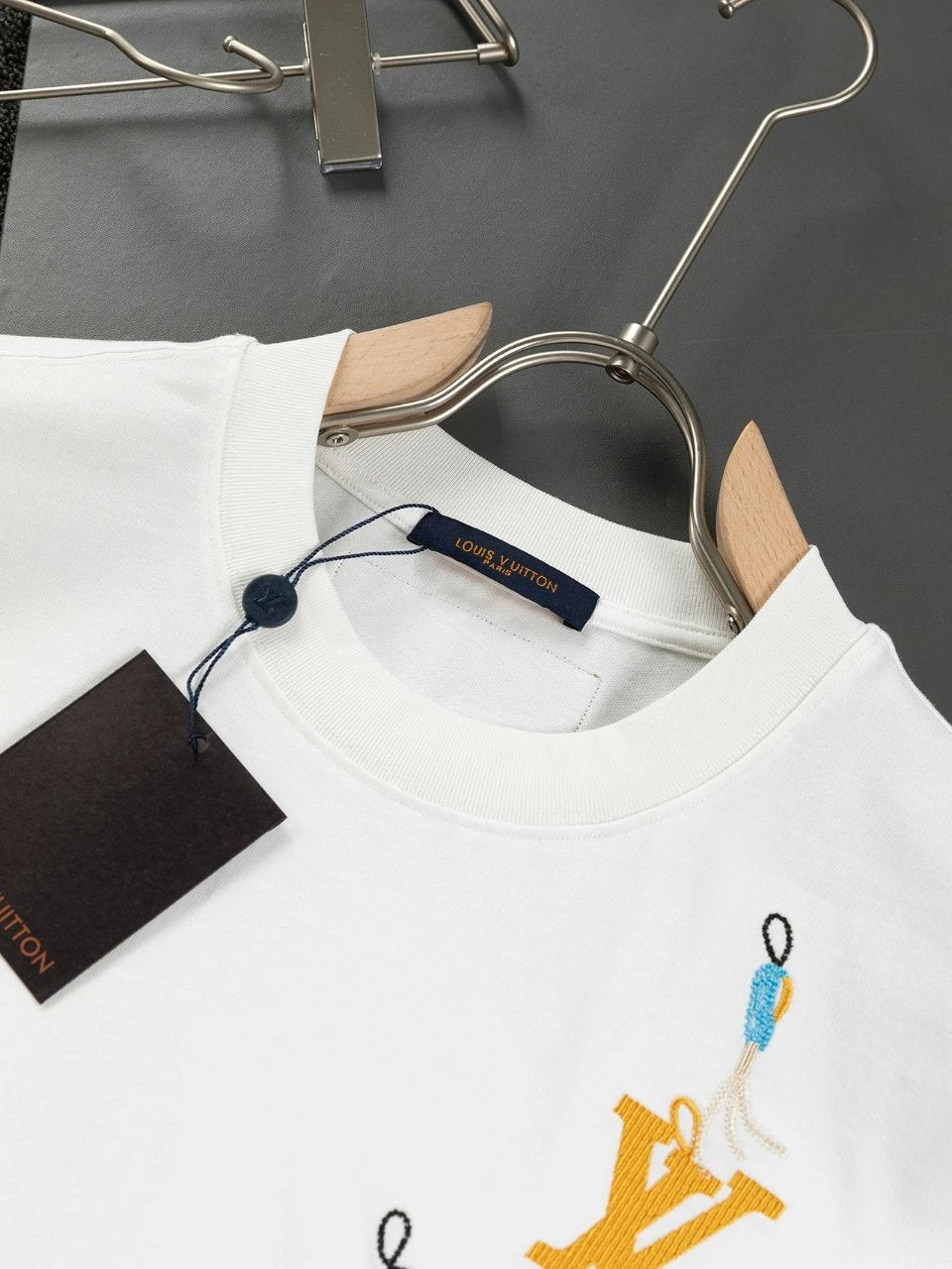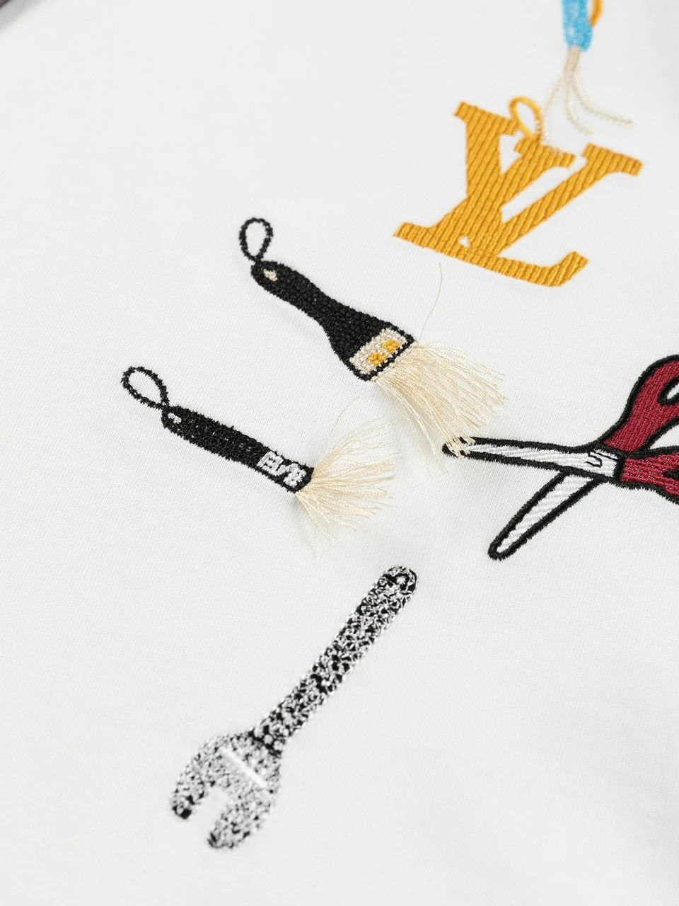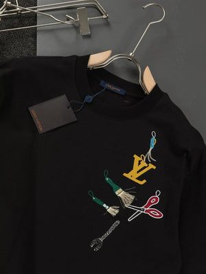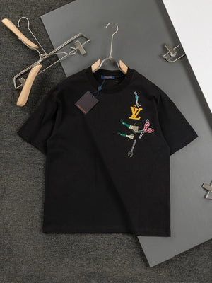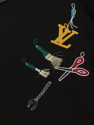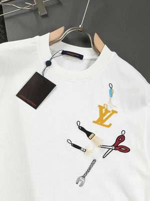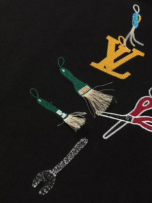 This round-neck short-sleeve shirt showcases the humorous meaning of the LV Multi Tools theme from the 2025 Spring/Summer runway. It's meticulously crafted with exquisite embroidery and beaded tools shaped like tools and decorated with the LV logo.