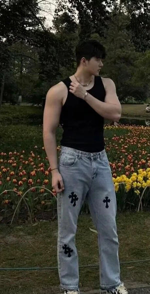 Cross Heart Cross Patchwork Leather Jeans, Street Fashion Must-Have Pants.