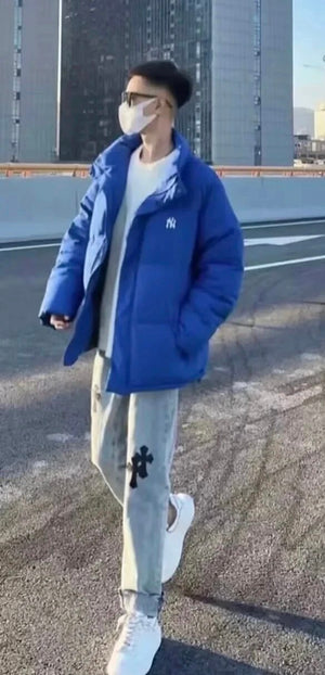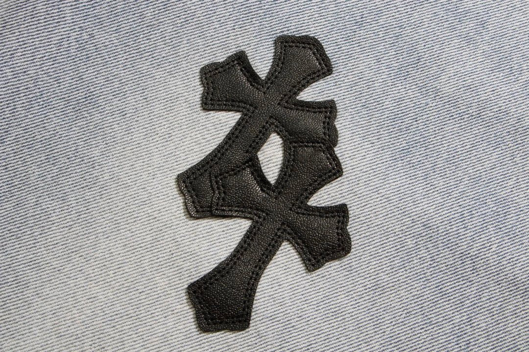 **Heavy-duty washing process, every fade and wrinkle is naturally casual, full of vintage charm.The calfskin is laser-cut into a cross shape and spliced onto denim fabric, instantly giving off an advanced texture.Vintage silver hardware with full details, fully showcasing personality and luxury.
