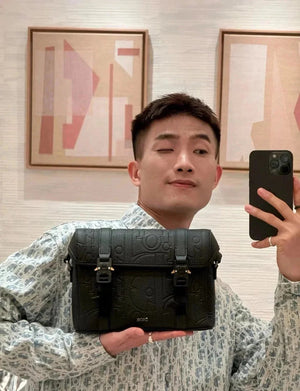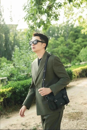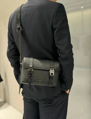 Upper Body Picture This Messenger Bag Is a New Product from 2024 Fall Men's Clothing Series, with Flip, Hit the Road Series. Gravity Printing Effect Leather Uses Embossing Technology to Exquisitely Present the Classic Pattern on the Black Cow Leather with Flip Strap and Two Nylon Jacquard Streamers. the Spacious Compartment Can Store All Kinds of Daily Necessities and Also Has Adjustable Shoulder Straps. The Style Is Practical and Can Be Matched with Casual Clothes to Create Exquisite Shapes.