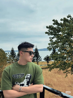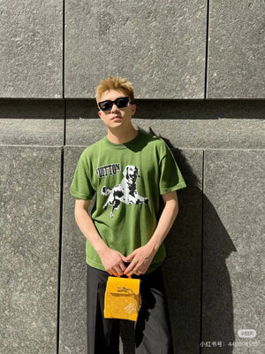 This short-sleeved crew neck shirt is made of high-quality cotton material, featuring a contrasting color inlay depicting a lively hound pattern. Brand logo decorations front and back inject vitality into the daily outfits of dog lovers