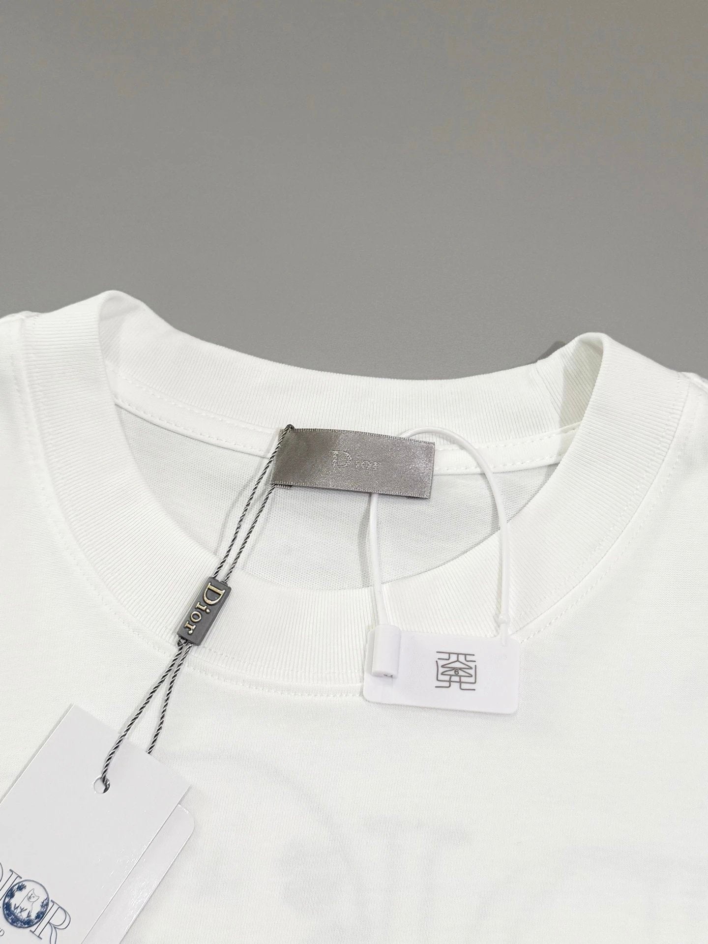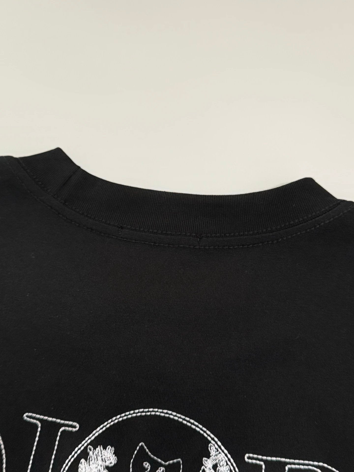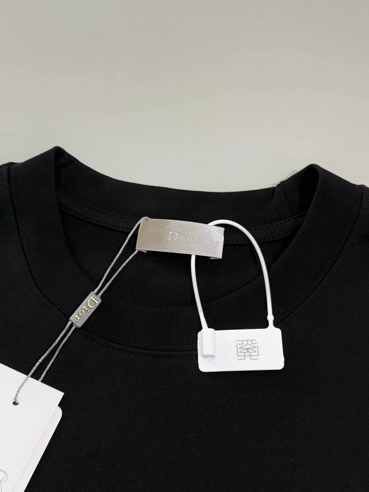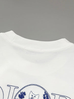 Dior collaboration cat embroidery short-sleeve T-shirt made of custom washed cotton fabric, weight 280g, 32s double yarn combed pure cotton fabric.The front and back panels are made with high-density embroidery craftsmanship, layered with three-dimensional plush cat outlines, featuring four-thread dense edges and double-needle chain stitching at the seams that can withstand washing machine drum beating. The neckline uses double-thread edging techniques with custom accessories and complete three-label certification, suitable for both men and women!