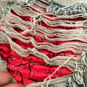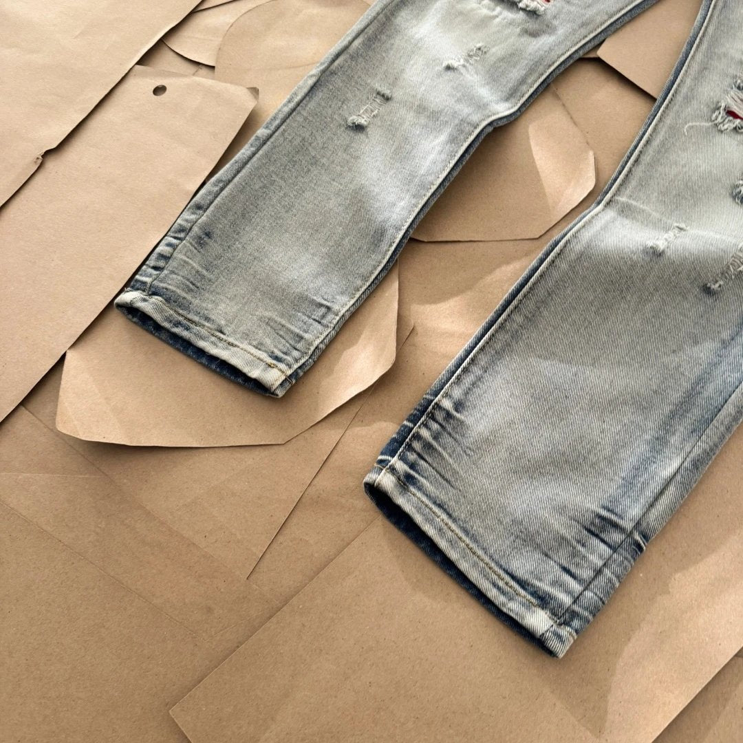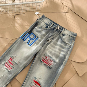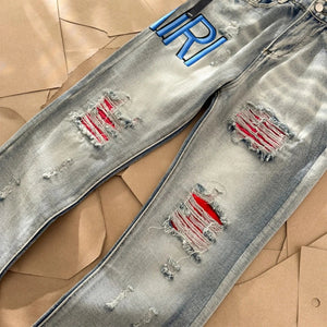 Classic Blue Letter Embroidery Red Patch Distressed Slim Fit Gradient Blue Jeans M28