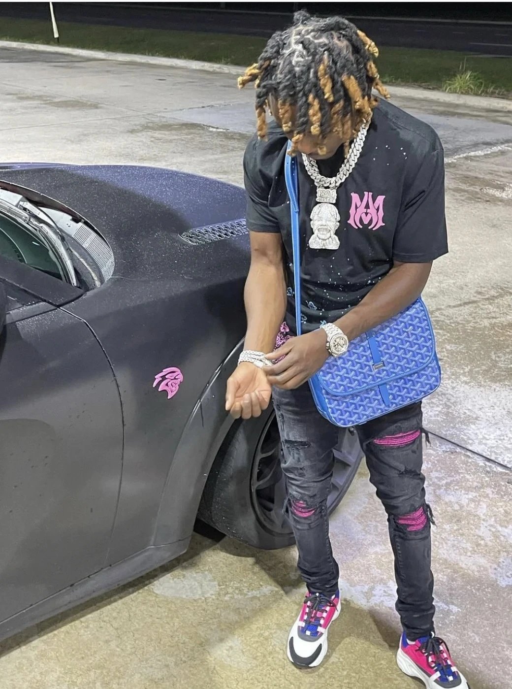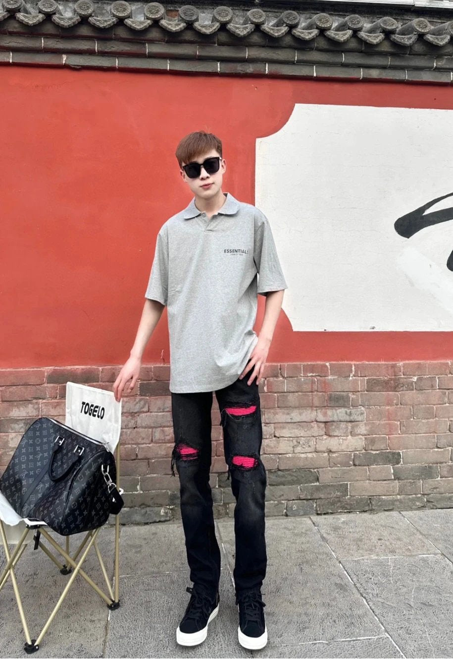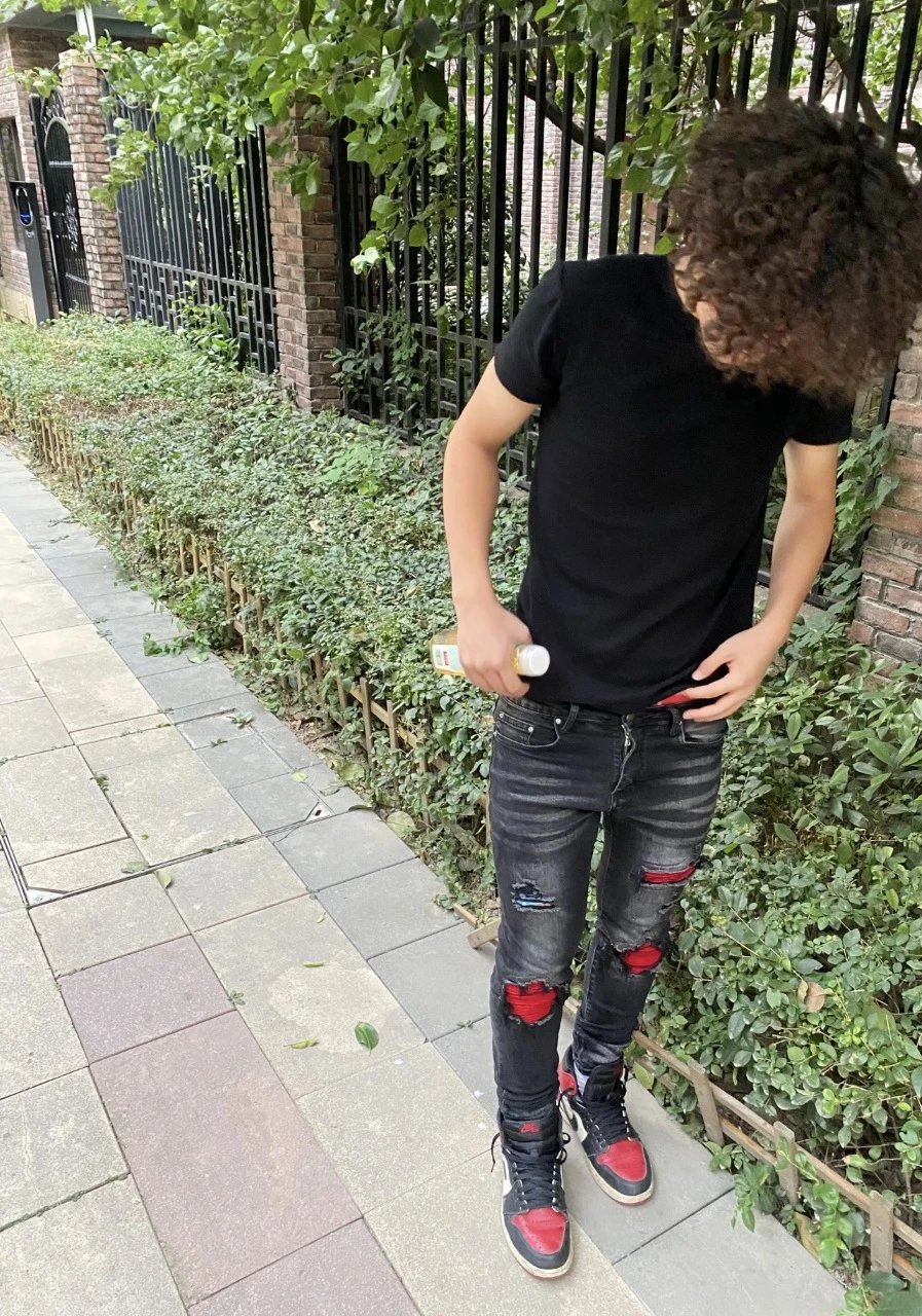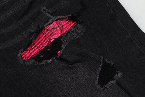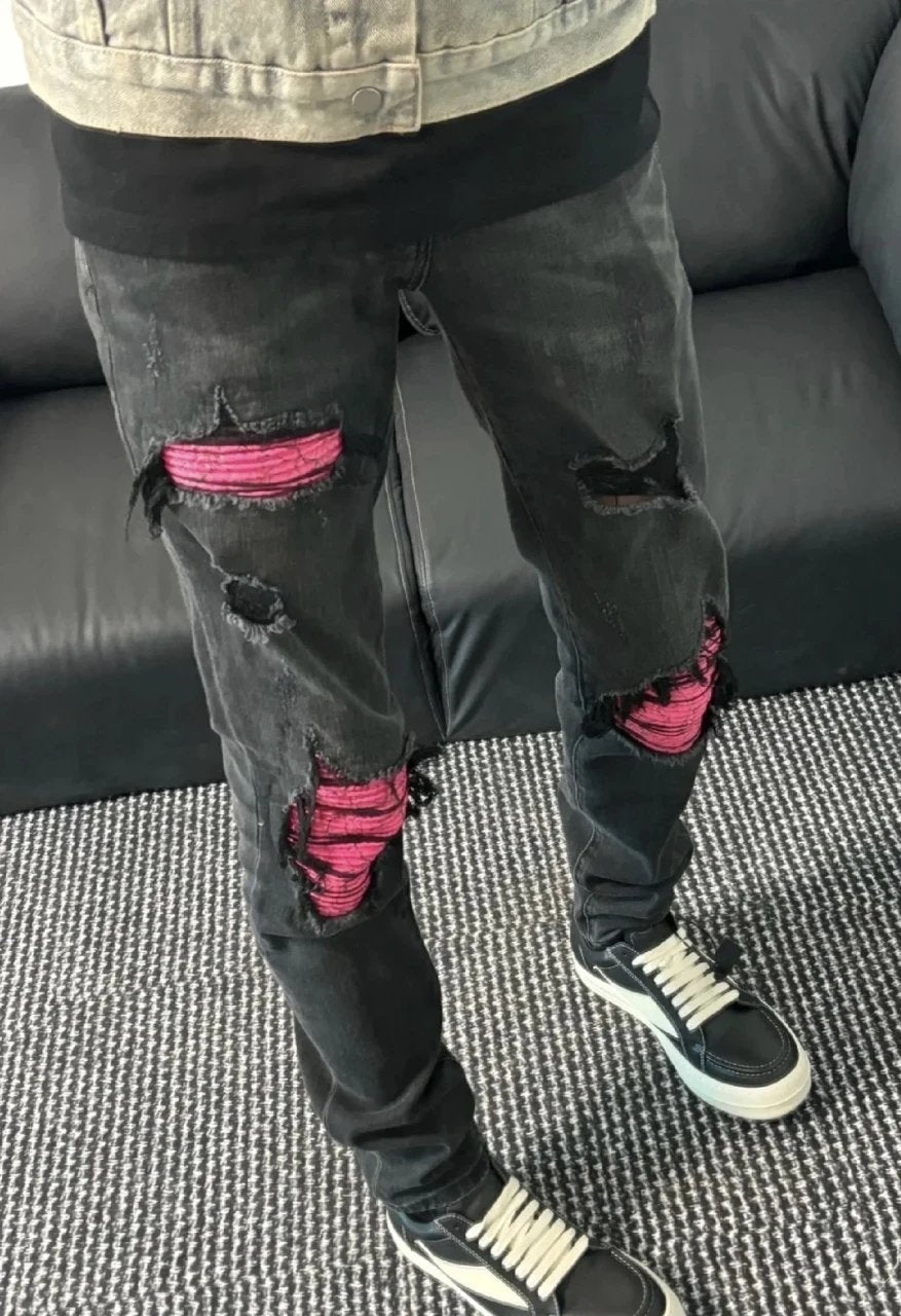Pink Leather Printed Ripped Slim-Fit Leather Patchwork Jeans, the Craftsmanship Is Amazing. Genuine Leather Printing with Smocking Design, Holes Leather Patchwork Stitching Full of Personality, Hand-Damaged Repair Yarn, Details Can Withstand Careful Reading. Button Bottom Nail and Cap Nail Have Steel Seal Letters, High-End Hardware Highlights the Quality, the Main Wheat Uses the First Layer of Cowhide Leather Disc.