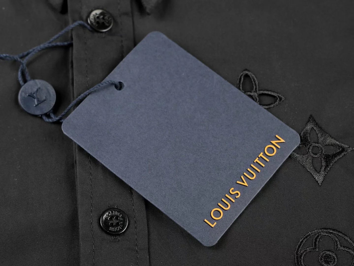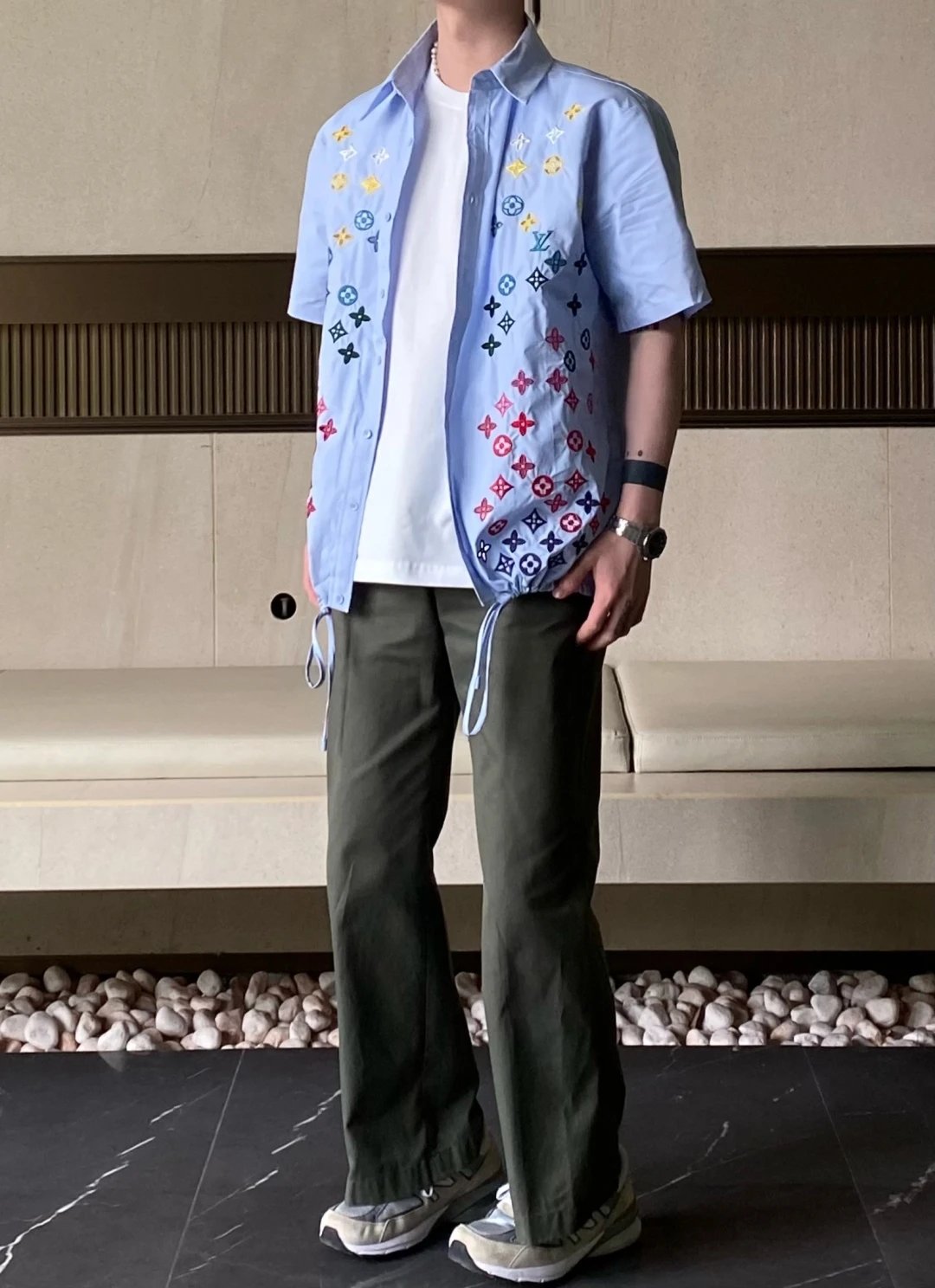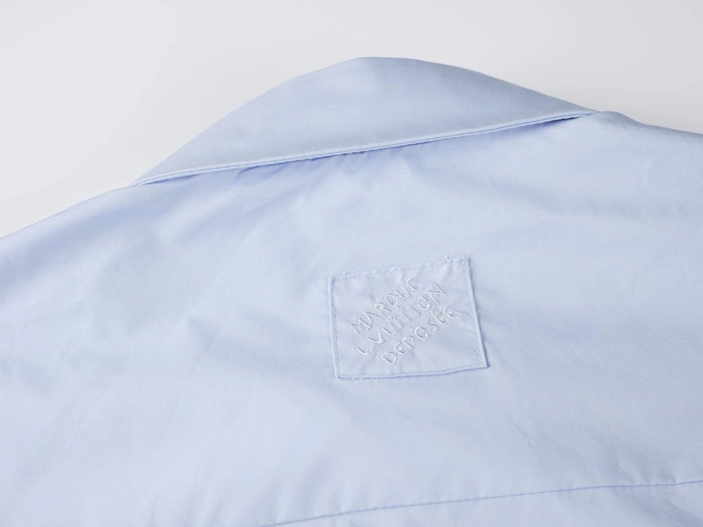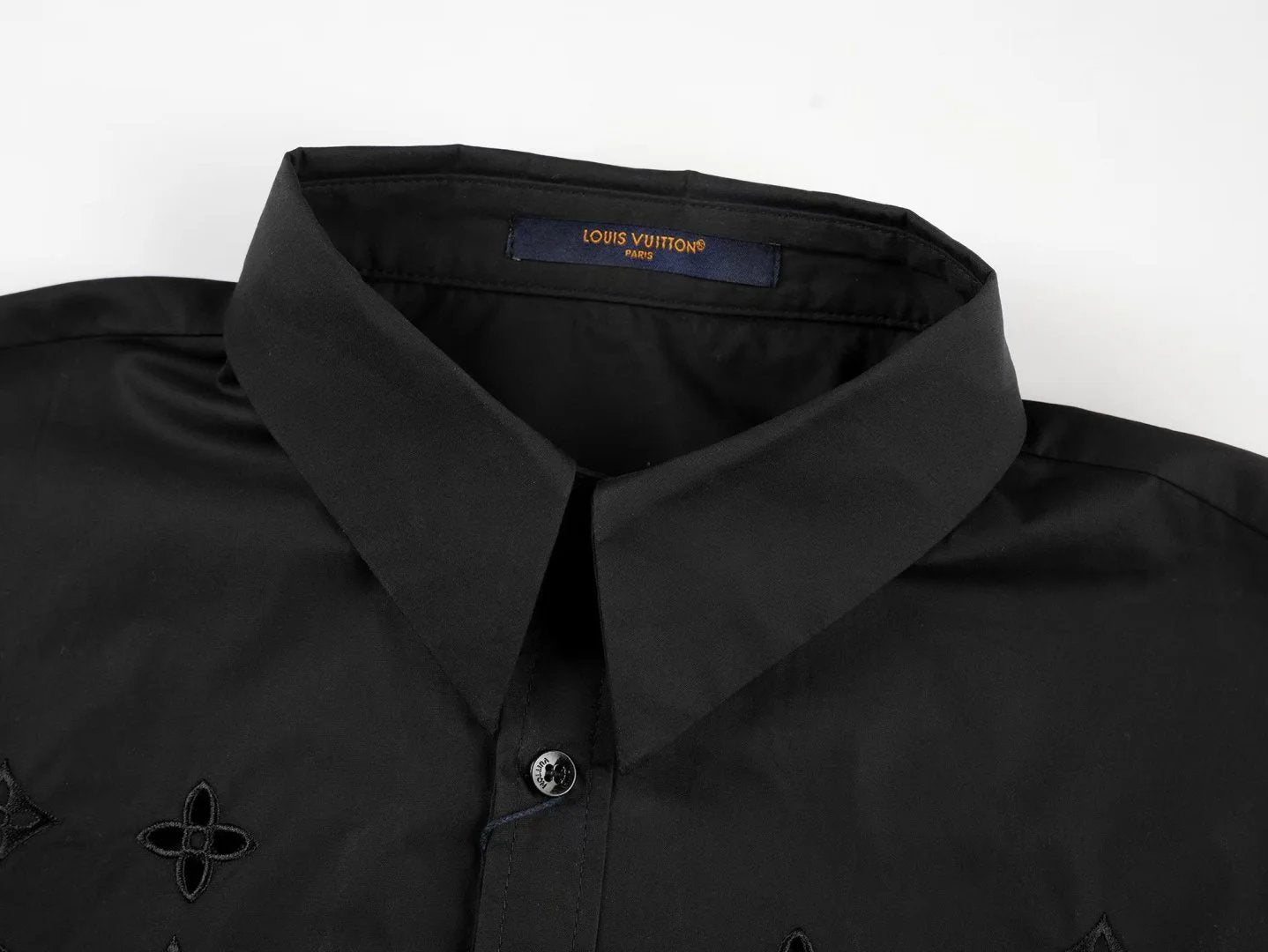 Embroidery➕Cut Out's short-sleeved shirt is reinterpreted with a drawstring waistband and decorative Embroider.The smooth black shirt features an English-style monogram embroidery in the same color scheme, presenting an elegant gradient effect and cleverly incorporating the LV logo. The back is adorned with a Marque L.Vuitton Déposée patch.This versatile piece adds a fashionable and avant-garde touch to the series' academic style appearance.