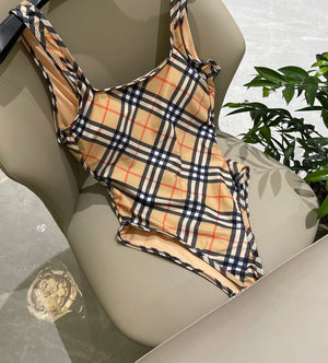 Burberry Swimsuit Full Body Plaid Bikini One-Piece Swimsuit Sexy Backless White Small Chest Gathered Beach Pool Women's Swimwear Vacation Hot Spring