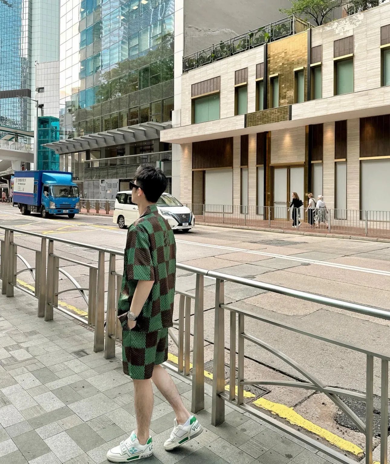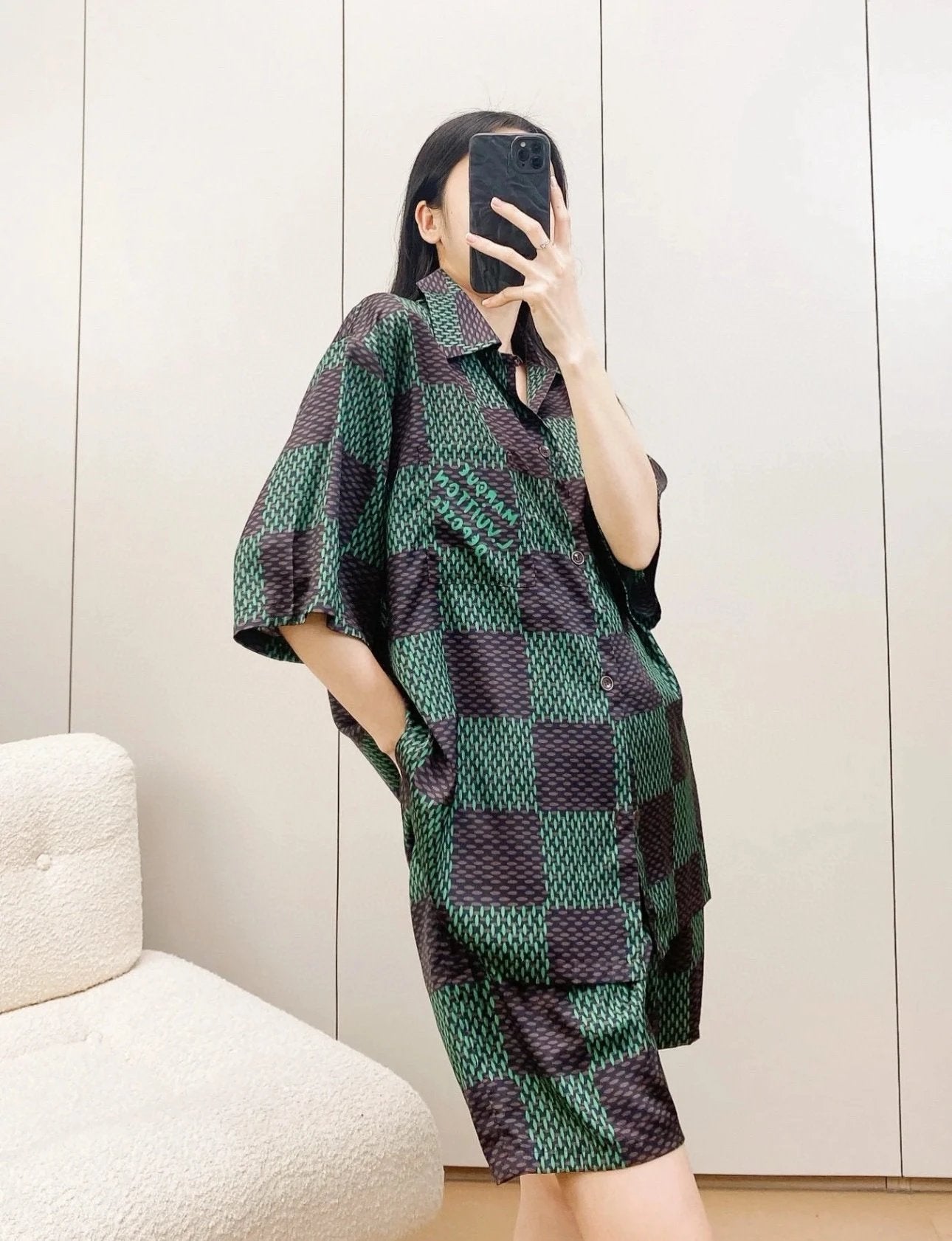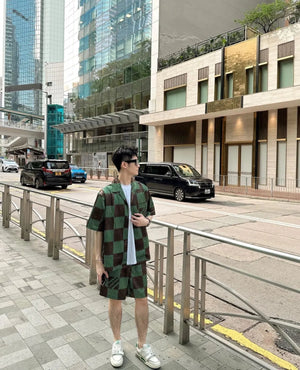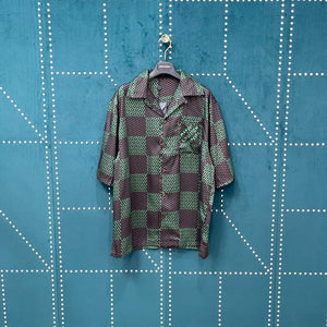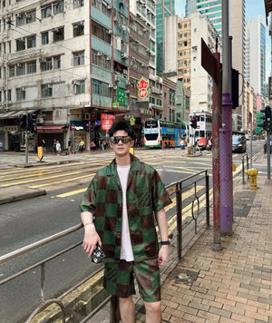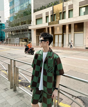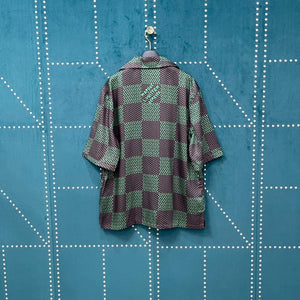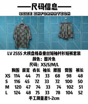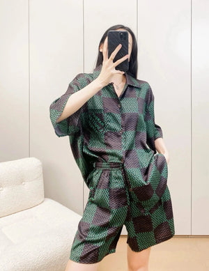 25SS Large Checkerboard Silk Short Sleeve Shirt and Shorts Set