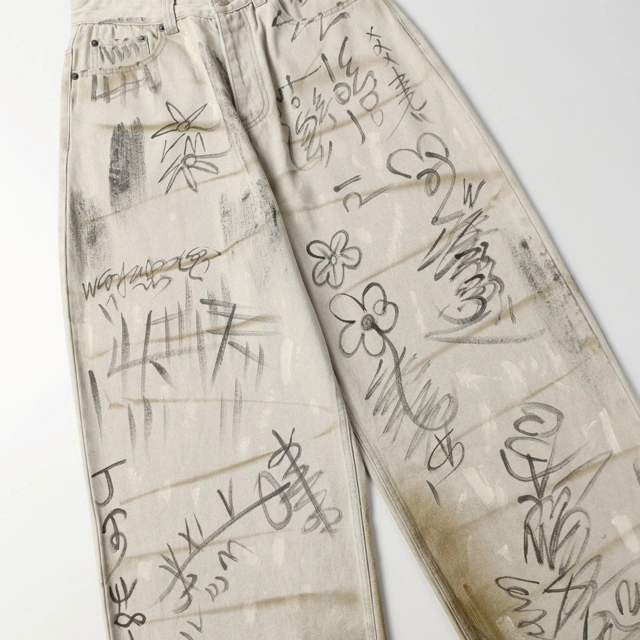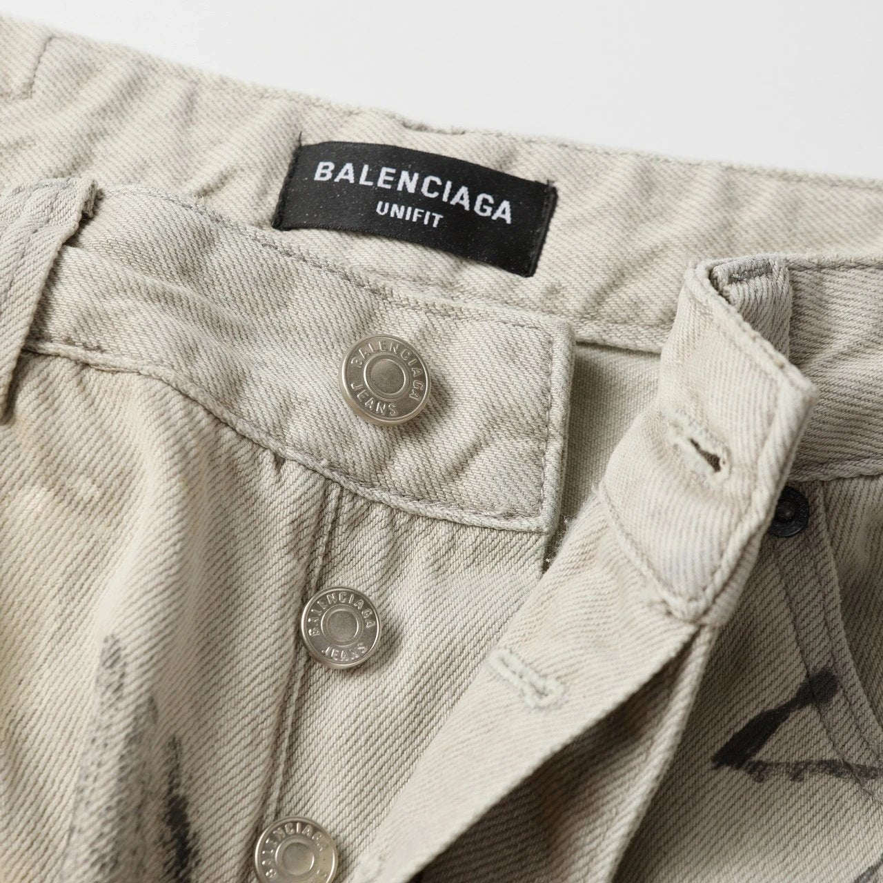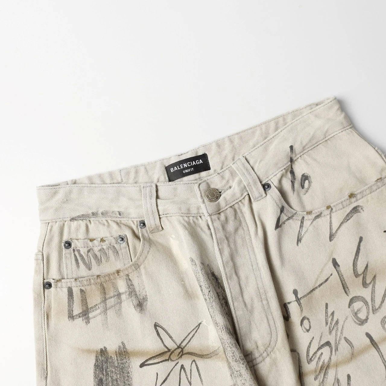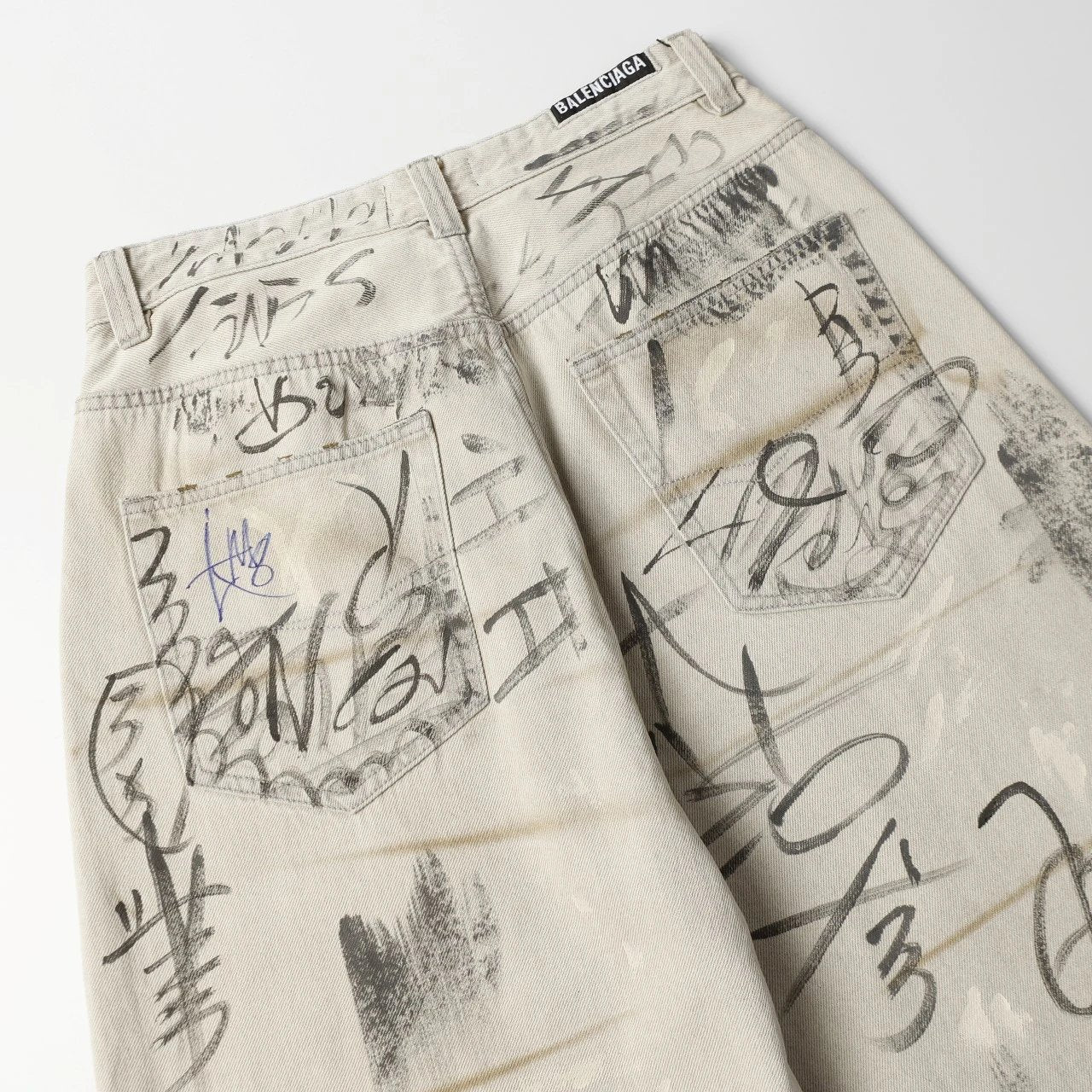 Balenciaga 24SS Spring/Summer New Jeans. Heavy Washed. Ultra-High Craftsmanship Pure Handmade One Pair One Hand-Painted Graffiti Paint Dirty Jeans. Versatile and Never Out of Style. Cool Feeling When Worn, Breathable. Loose Fit Version. Unisex