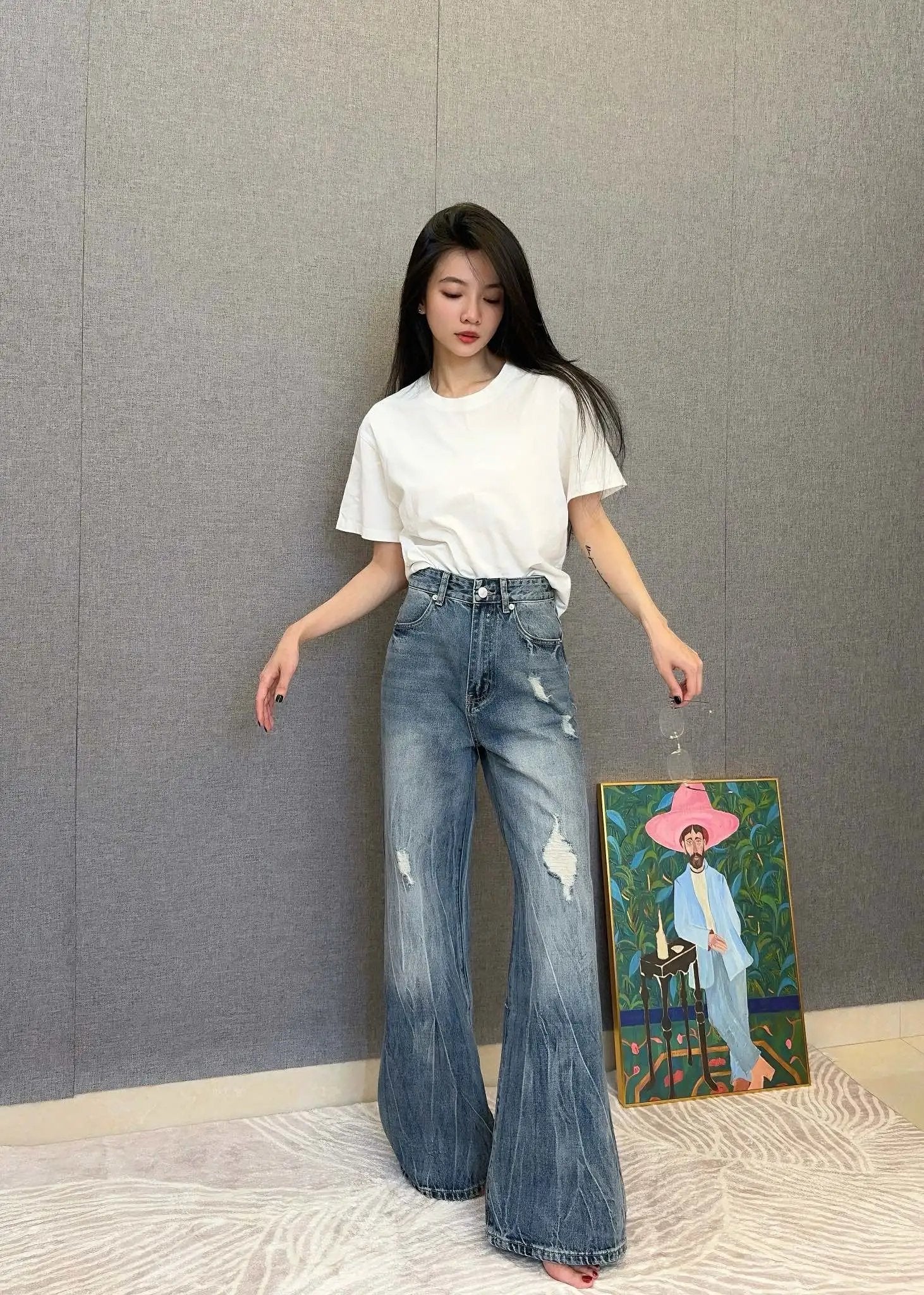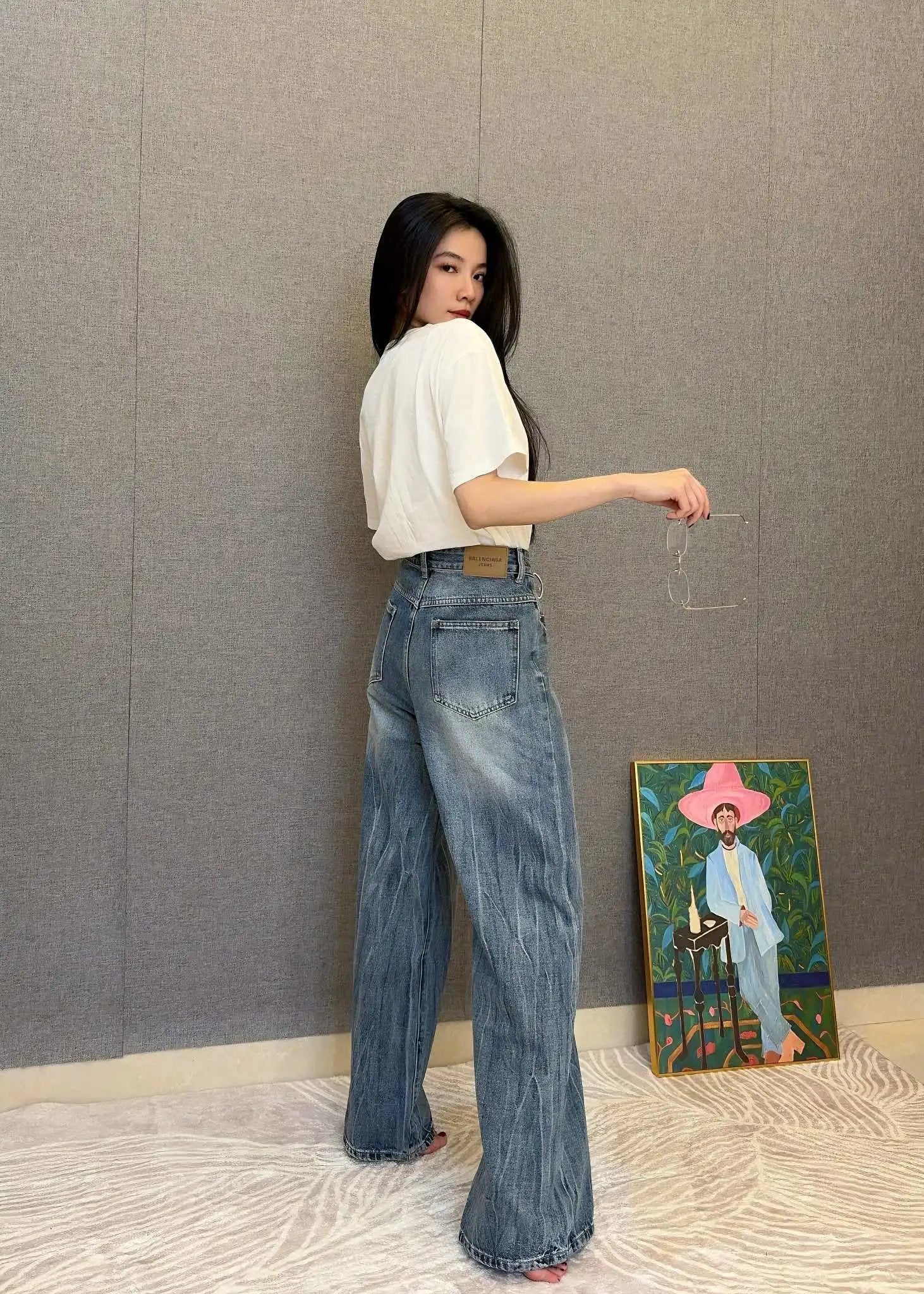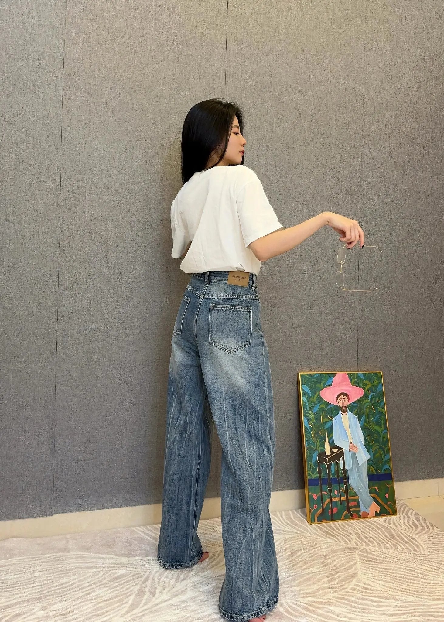 Top Version Balenciaga** Floor-Length Distressed Jeans for Women Versatile Casual Loose Fit B-Parent Pants Pre-Purchase Instructions