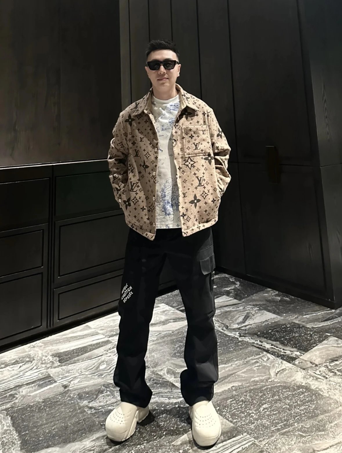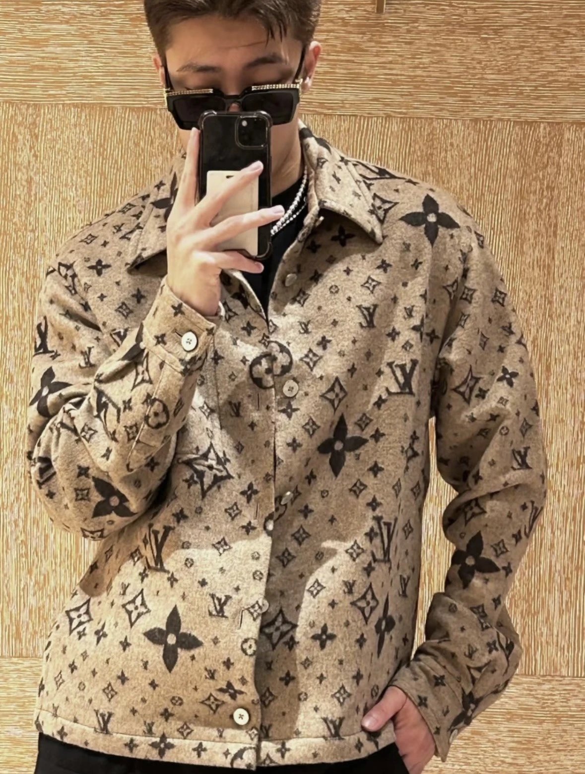 Made of custom wool blend fabric with full-width Monogram Pointillism pattern design, button placket closure allows for pairing with seasonal bottoms to create a fashionable look suitable for various occasions. Custom accessories complete with all three labels, unisex style!