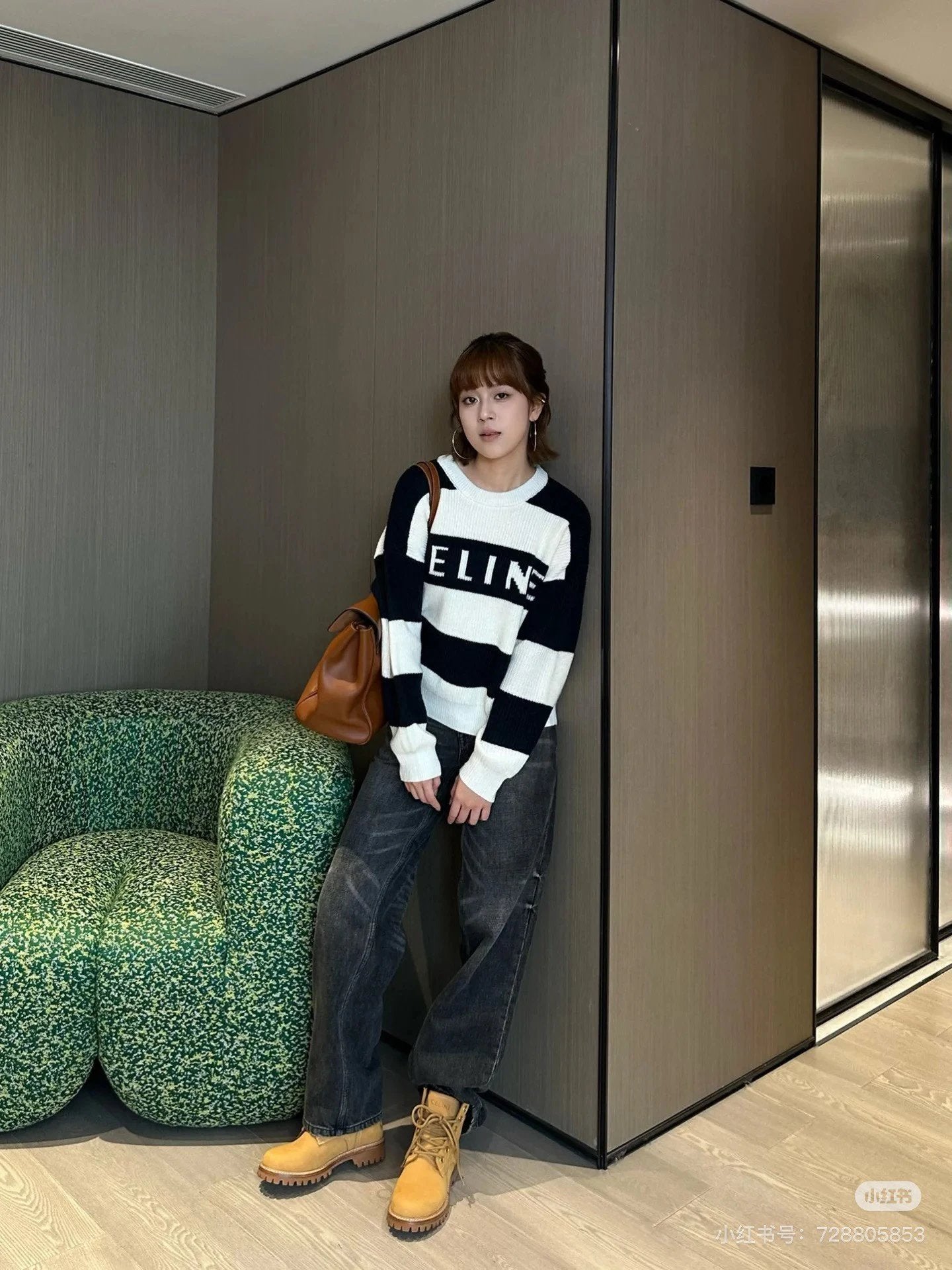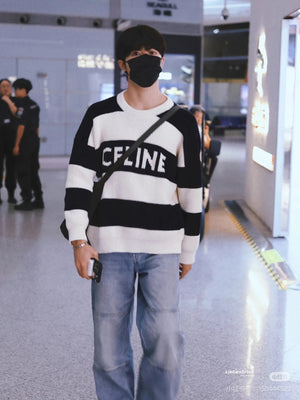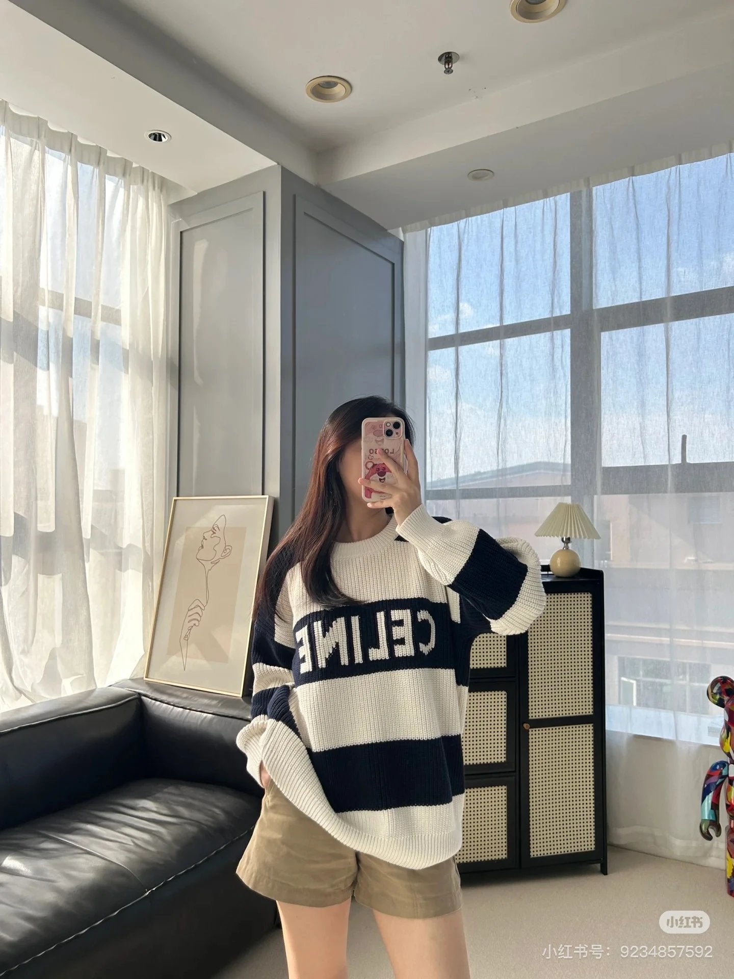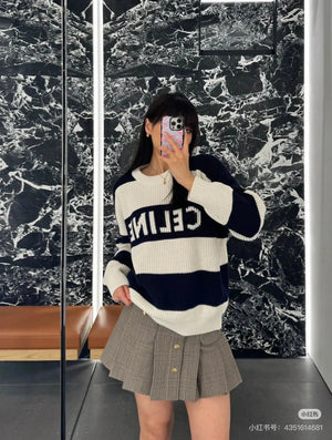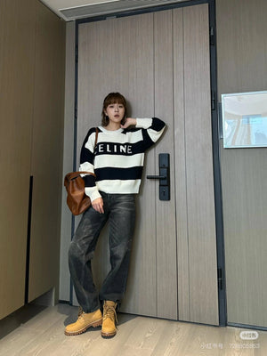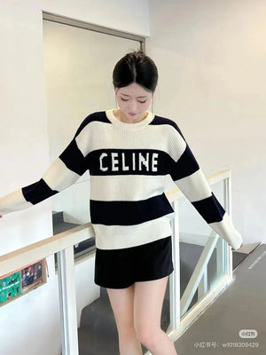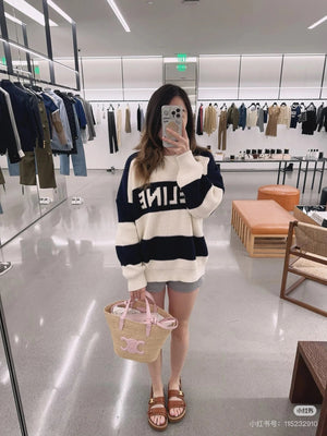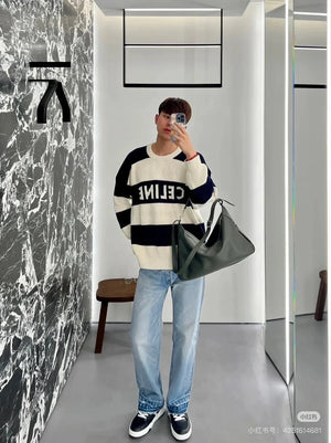 Celine Sweater Knitted Jacquard Striped Crew Neck Sweater Long Sleeve Pullover Thickened Lazy Style OS Loose Fit Unisex Knit Top Jacket Versatile Casual Wearable Inside and Outside