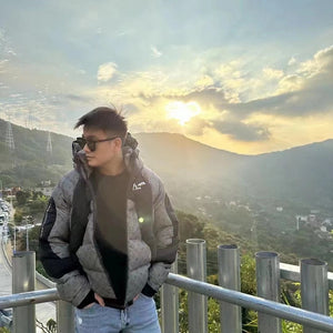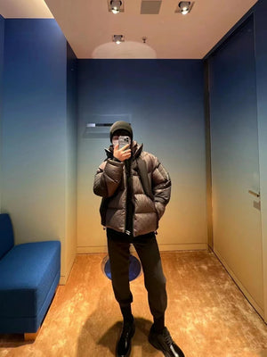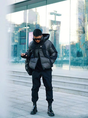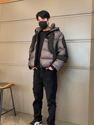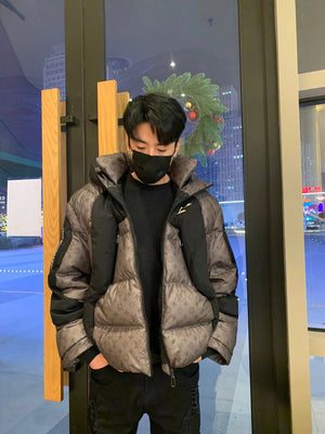 This down Jacket Uses Heat-Sensitive and Water-Sensitive Technology Fabrics to Cover the Classic Presbyopic Elements, Placing 1v3d Logo and 1v2054 Logo on the Chest and Right Sleeve