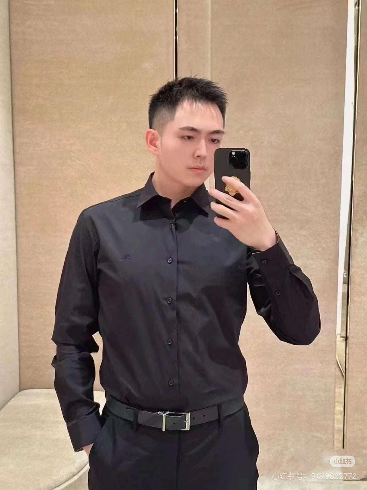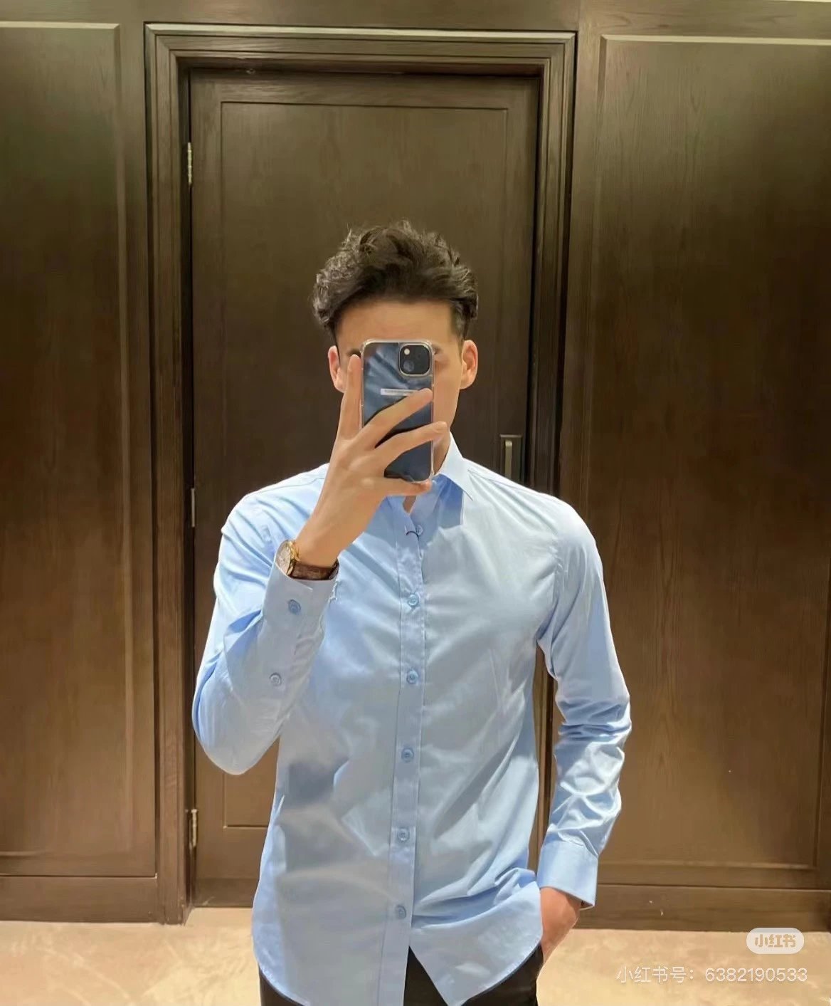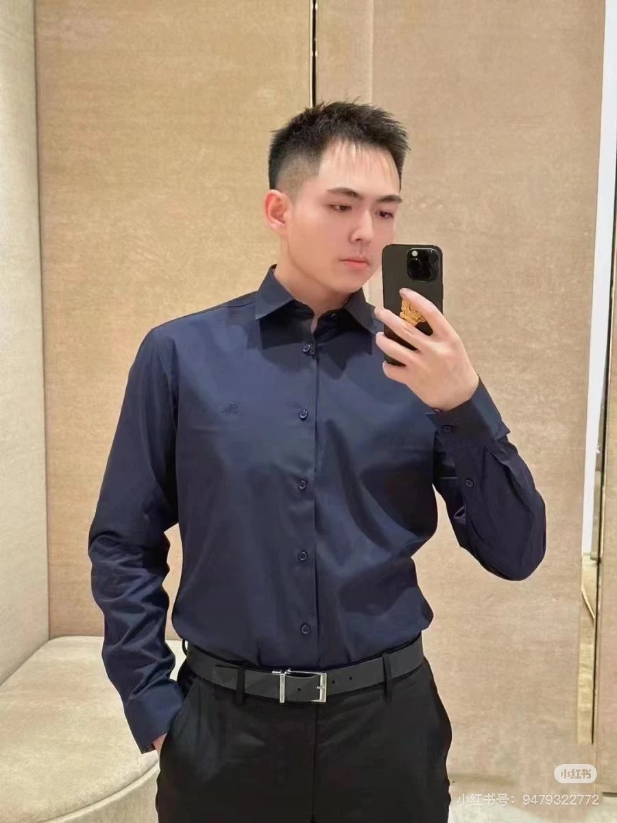 Solid color design with equestrian knight logo embroidery that adds a sense of design to a simple shirt. It uses original buttons where the letter logo engraving is clearly visible! Exquisite details!