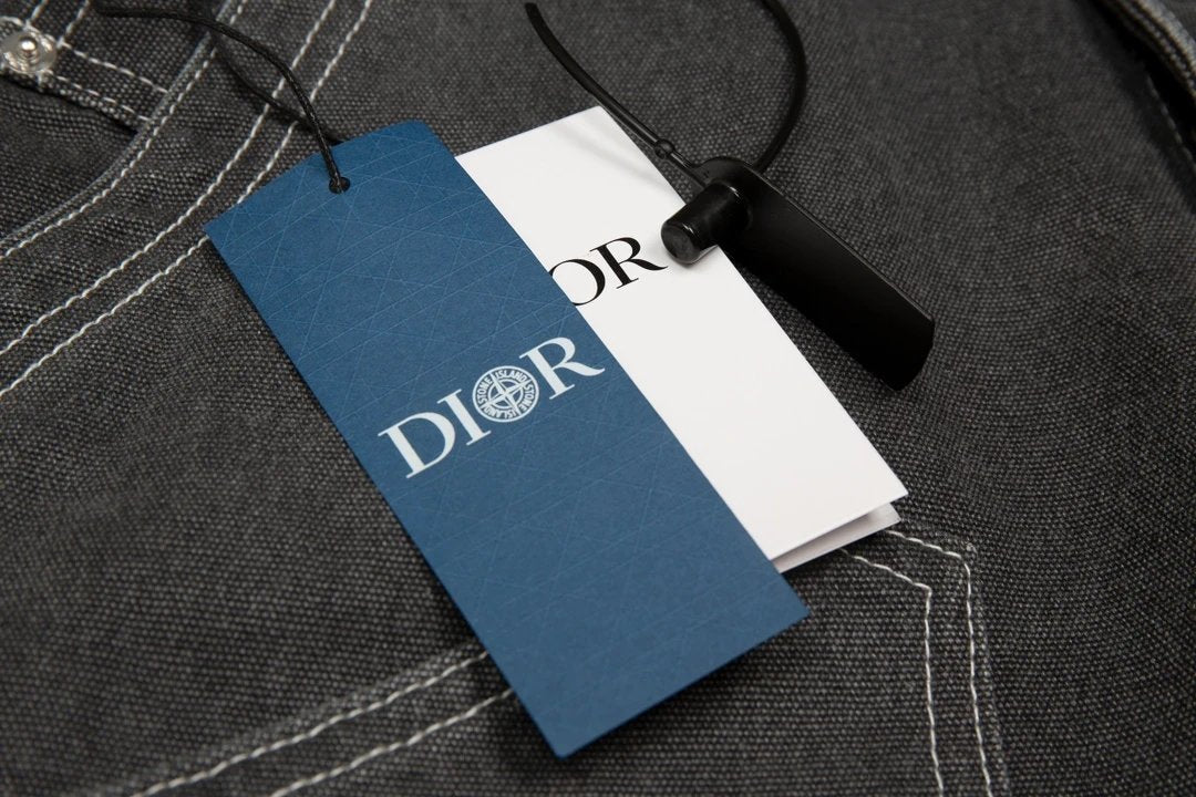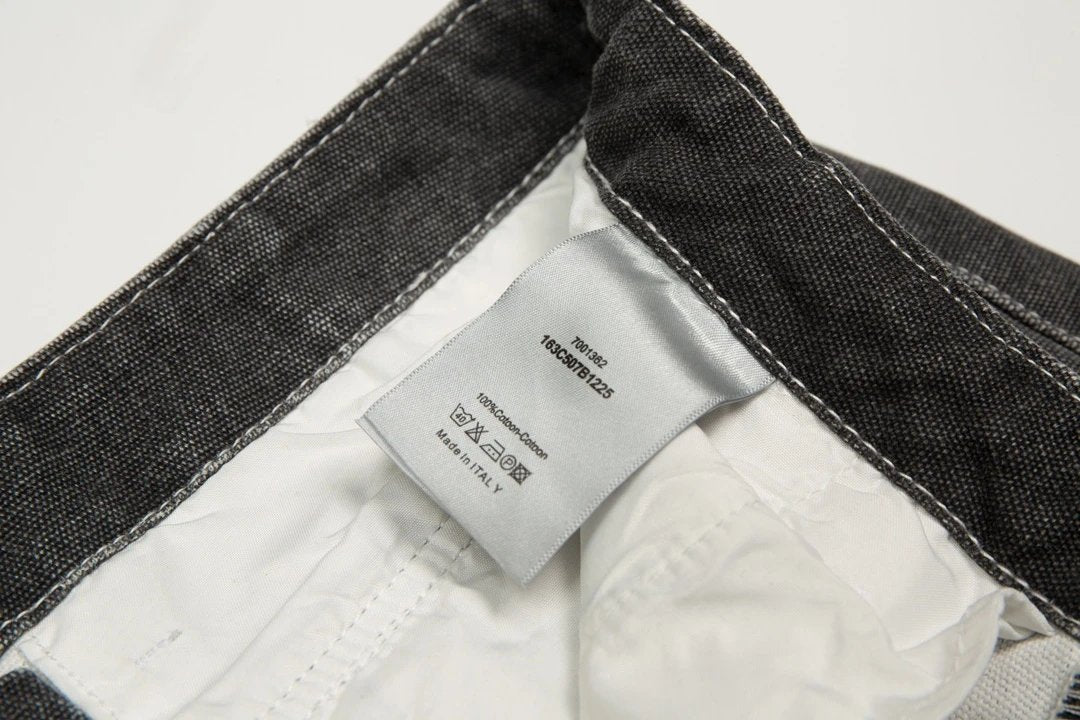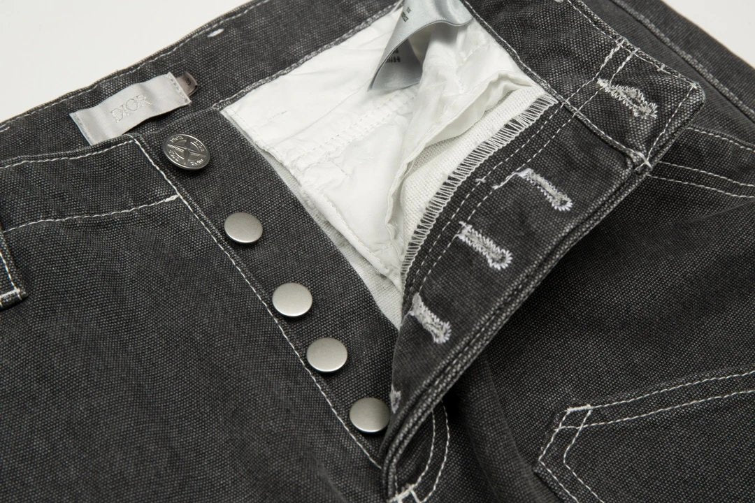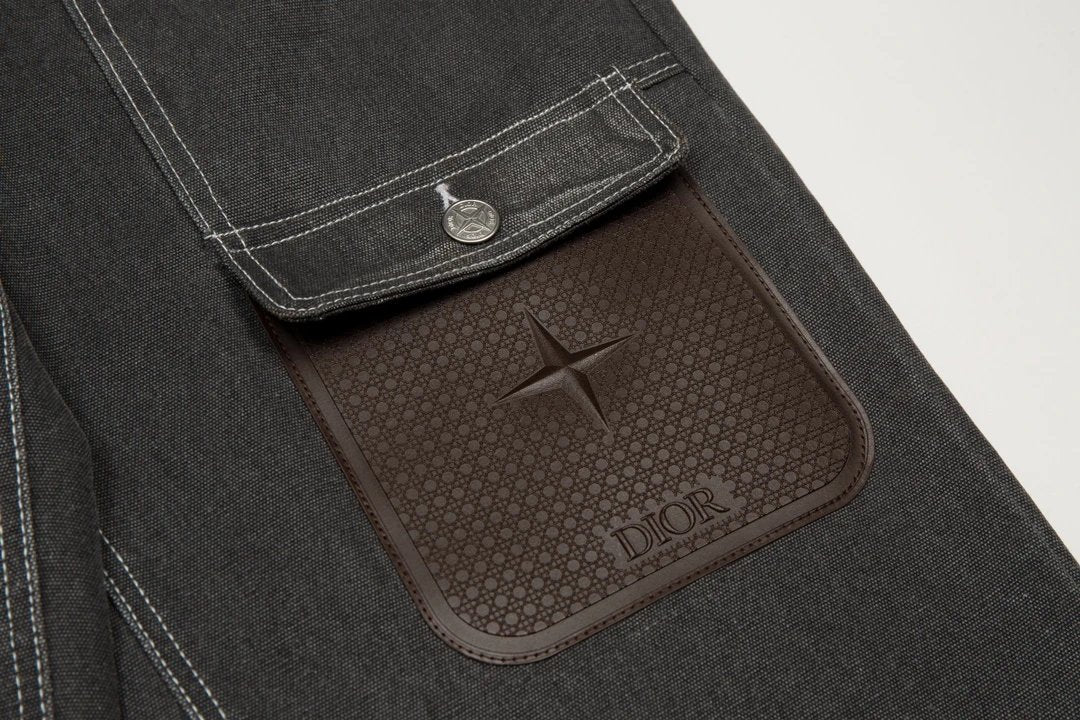 DIOR/Dior CD X Stone Multi-Pocket Leather Patch Jeans Stone Island Collaboration Series. The fabric is made from China's denim base fabric origin, steamed for color fixation, washed, and then shaped into finished fabric. Through washing and sanding, it acquires an aged texture with a natural color transition. Finally, boiling and bleaching solidify the color to achieve an effect consistent with the original version. Stone Island Cross Star Conceptual Embellished Laminated Leather Pocket, Made with Imported Special Machine Infrared Positioning Sewing, Firm and Sturdy. Custom Co-branded Engraved Pattern Buttons, Complete Set of Co-branded Three-label Accessories Included. The multi-pocket cargo jeans design adds more dimensionality and layering while increasing practicality.