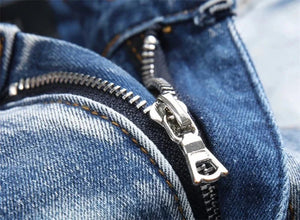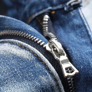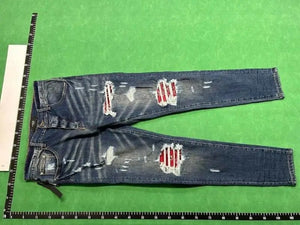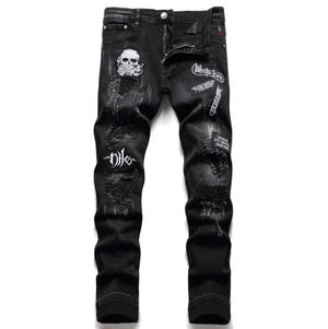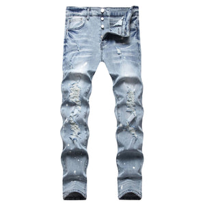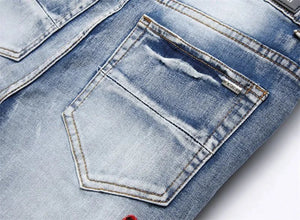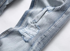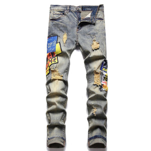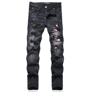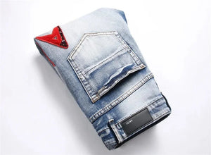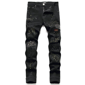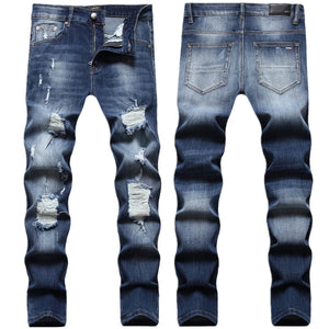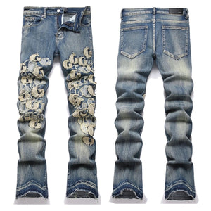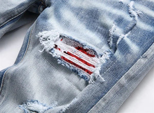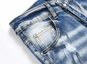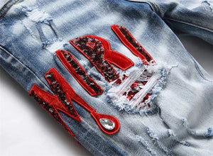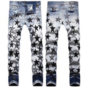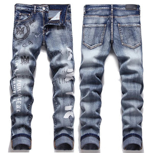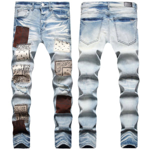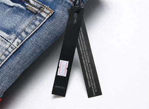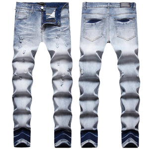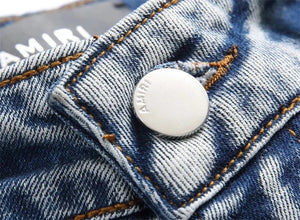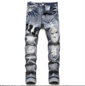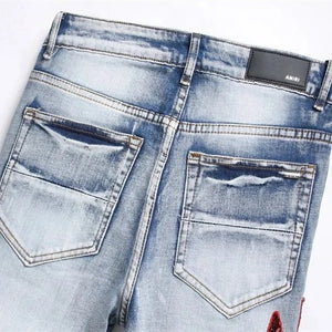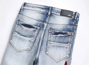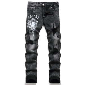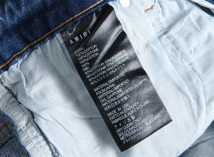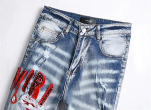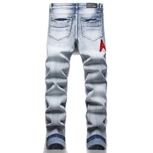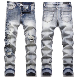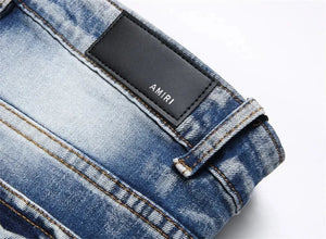 Amiri Jeans New Foreign Trade Style Fashion Blue with Holes Paste Cloth Embroidery Elastic Mid-Waist Feet Men's Jeans
