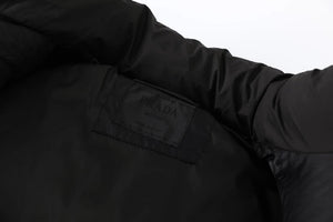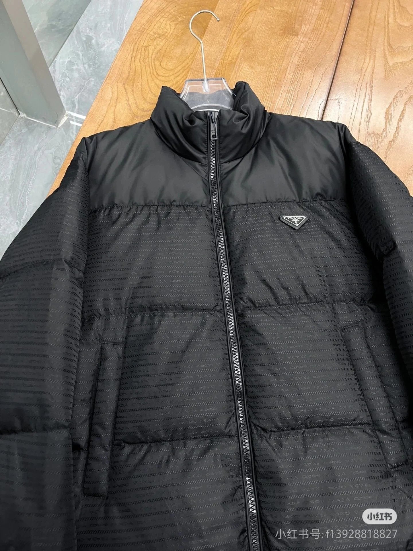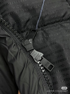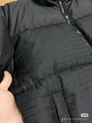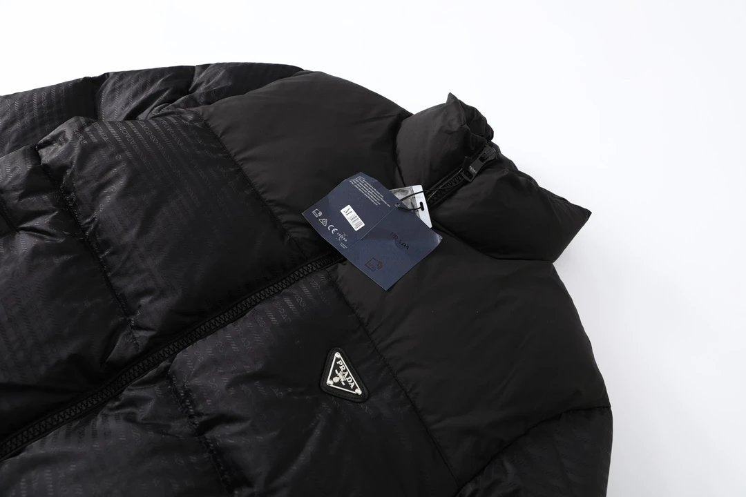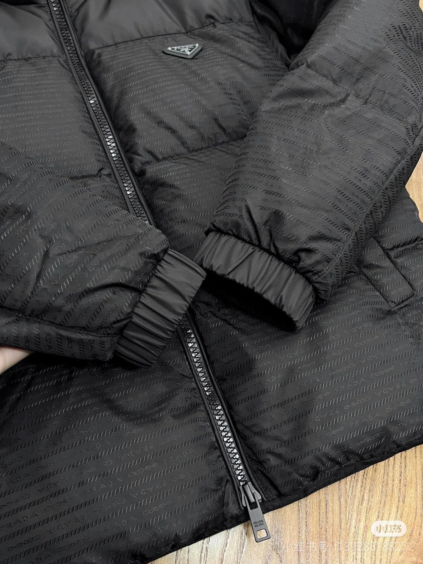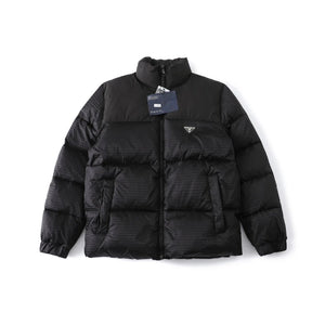 Prada down jacket New Metal Triangle Badge logo Stand Collar Full Print Patchwork Down Jacket Coat Unisex