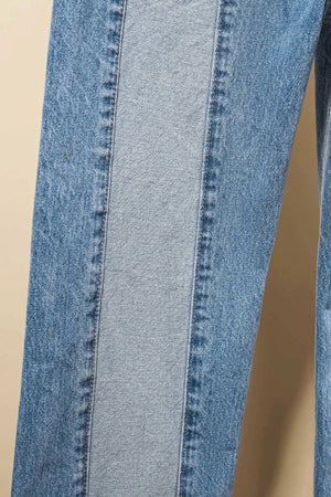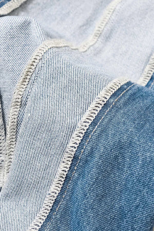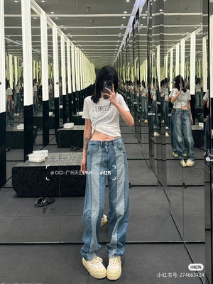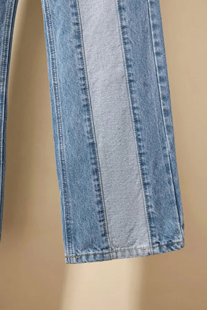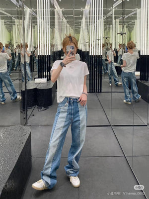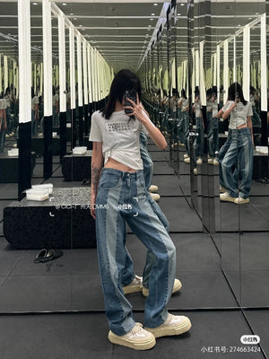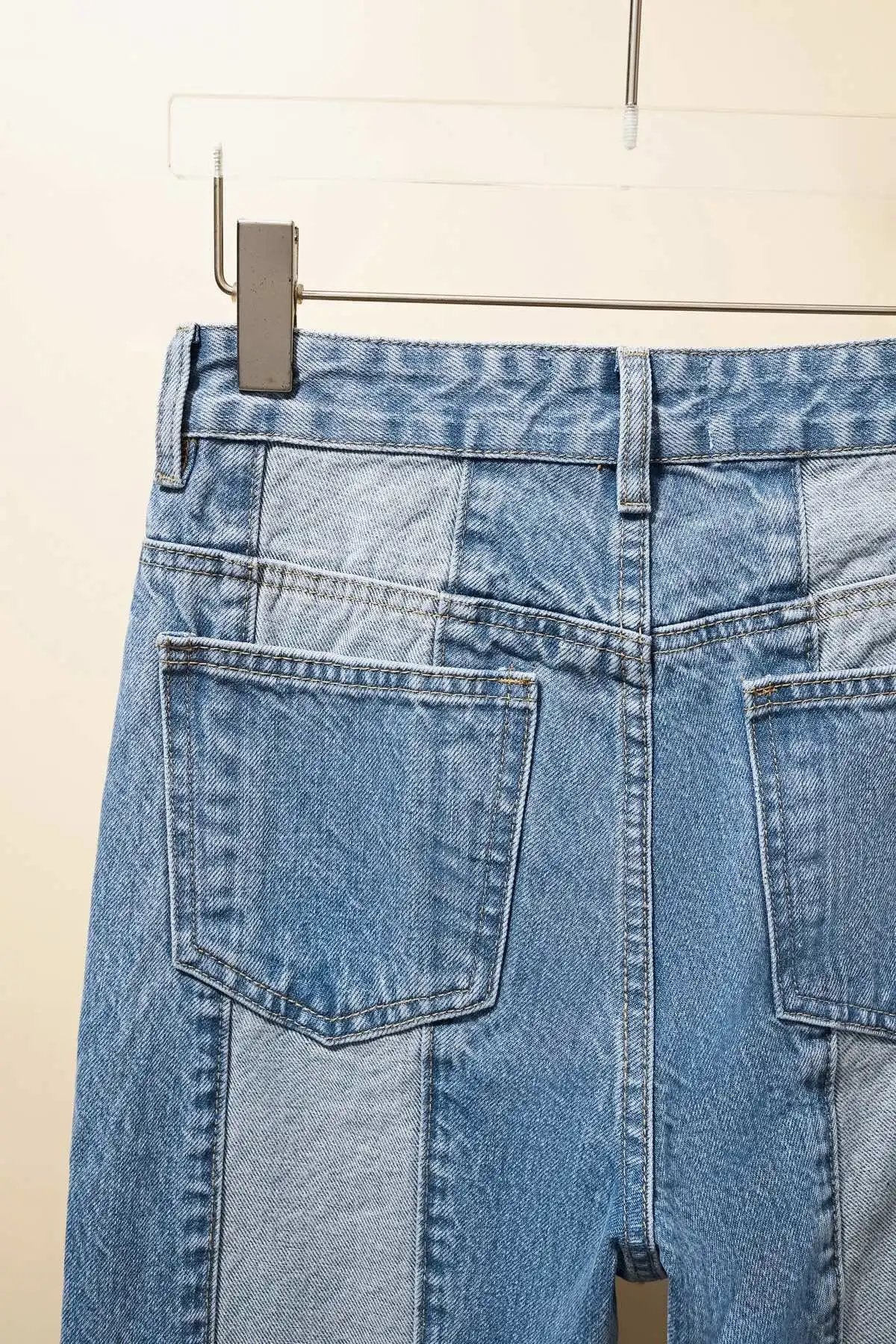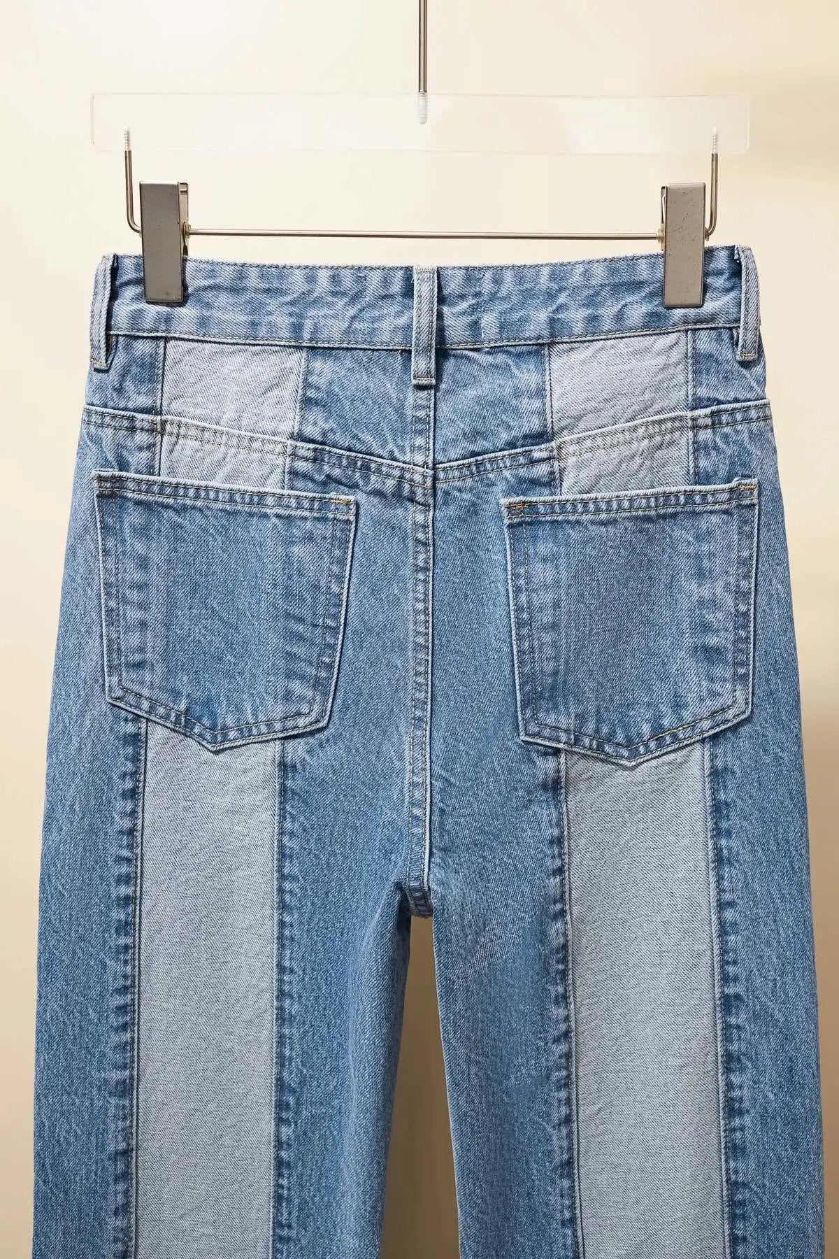 Front and back panel splicing in mismatched colors, enzyme stone washing, custom hardware, dark and light color splicing ➕ Straight-cut tailoring with a great sense of design, effortlessly creating a fashionable look with a relaxed fit that gives the effect of long legs