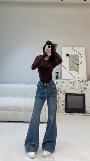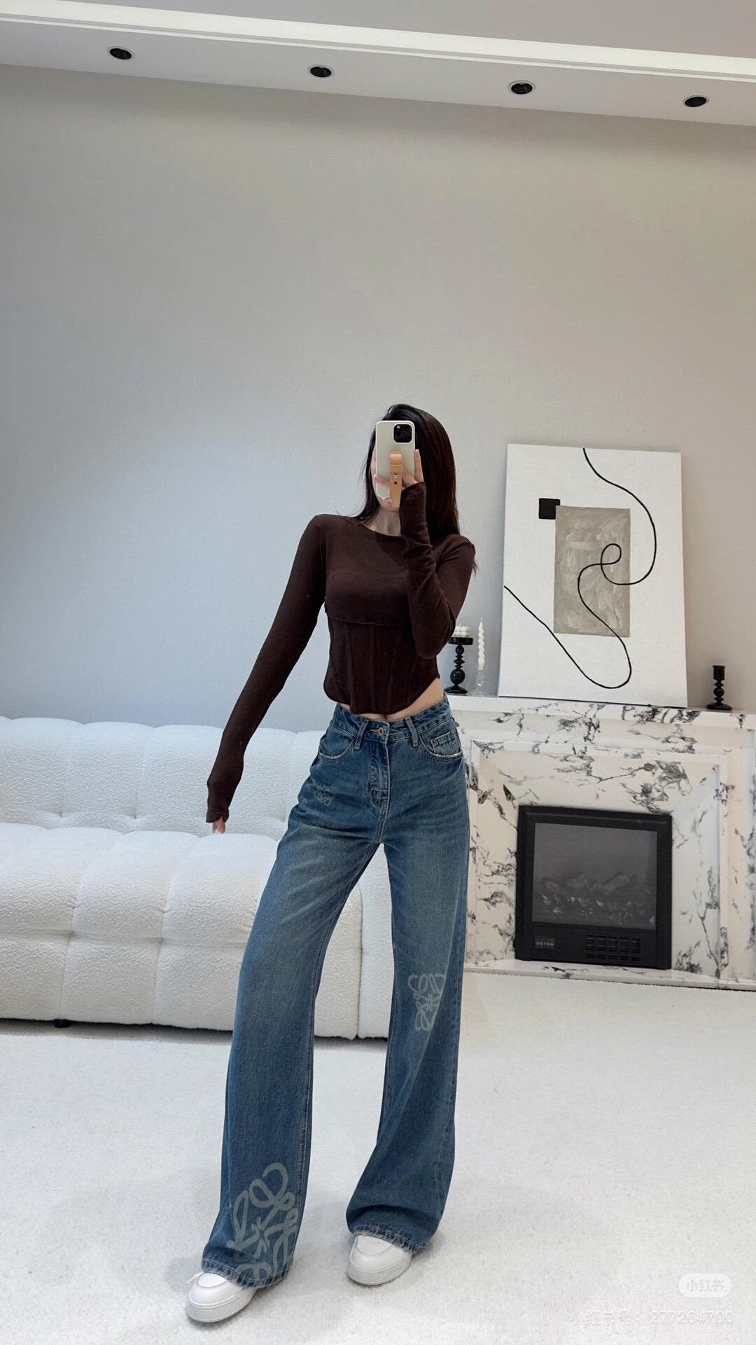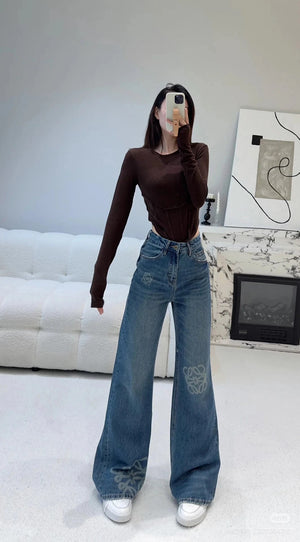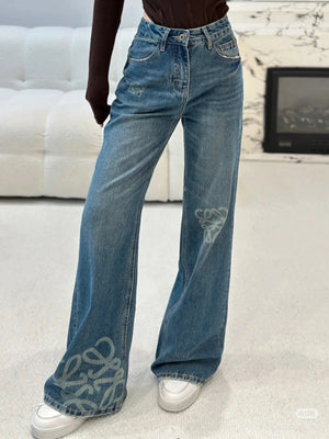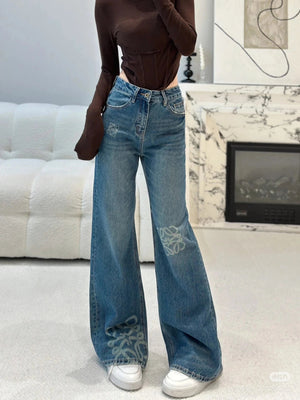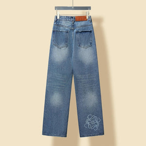 Top Version LO*WE Loewe Printed Denim Long Pants Women Versatile Casual