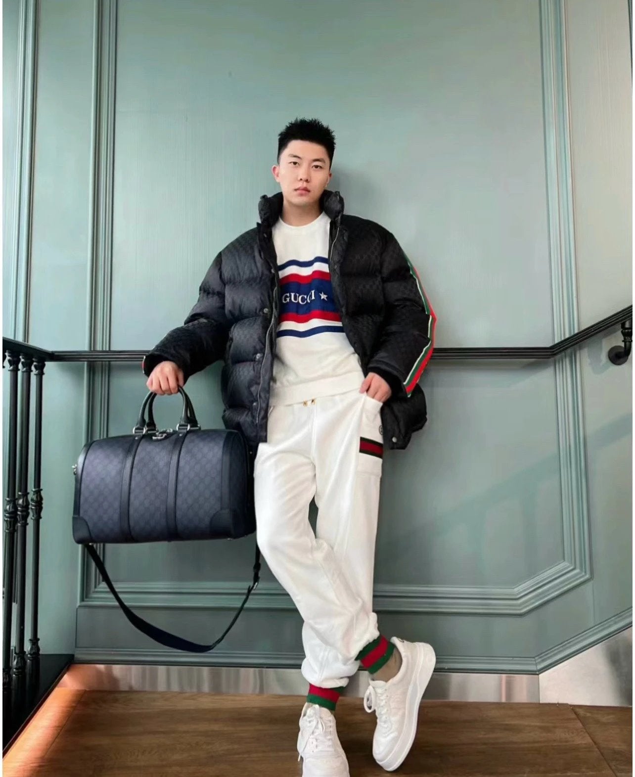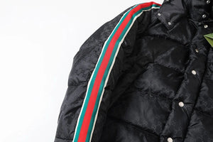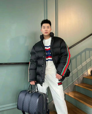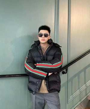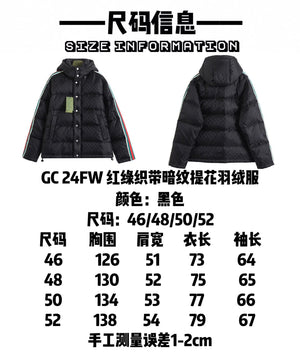 Gucci?????GC 24FW Red and Green Webbing Mid-Length Dark Pattern Jacquard Element Down Jacket