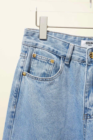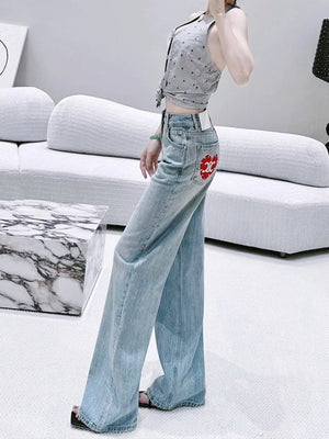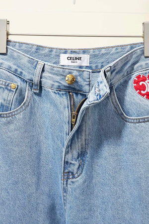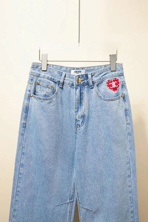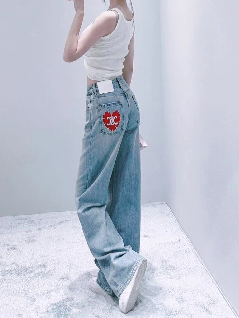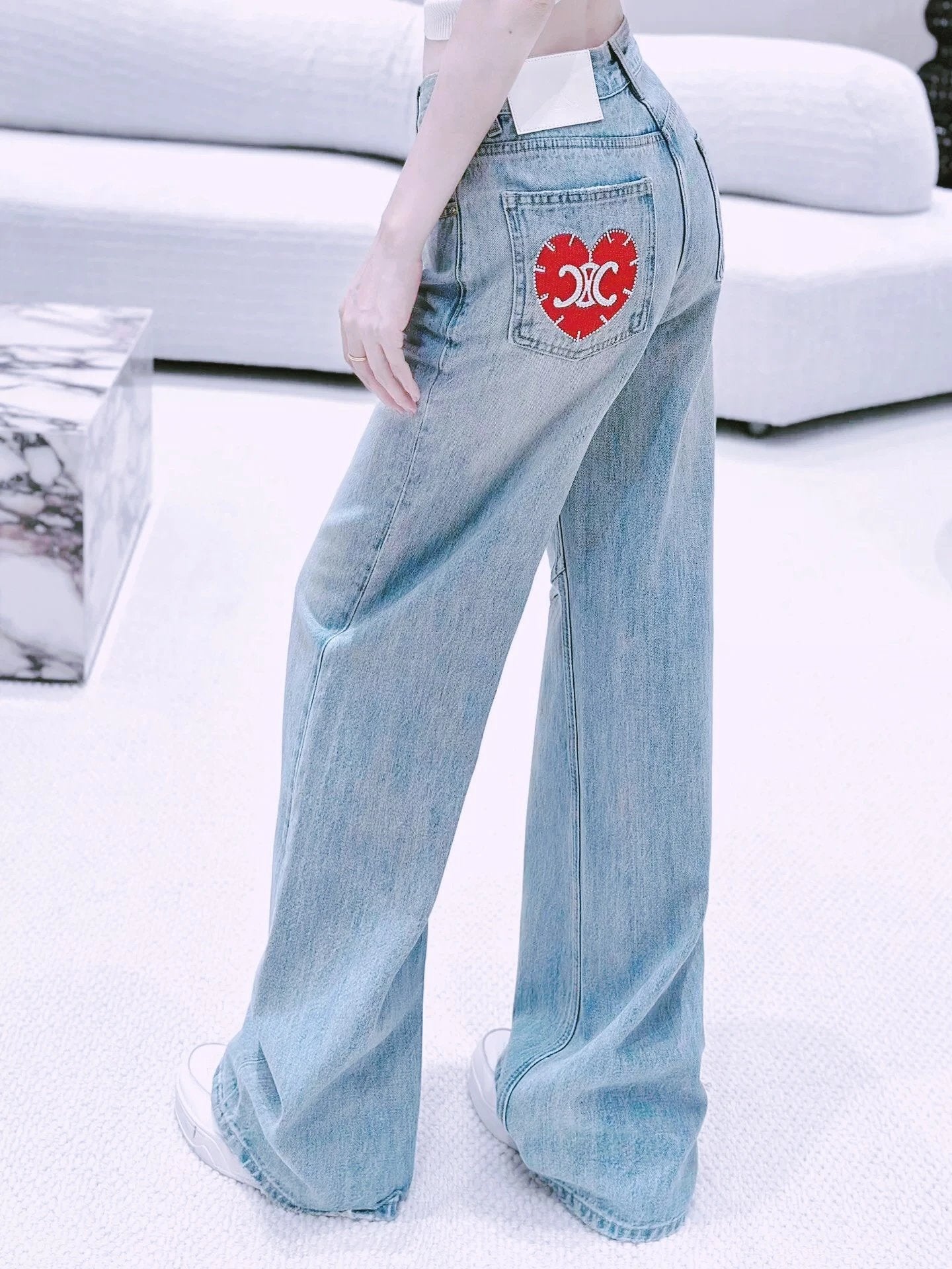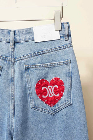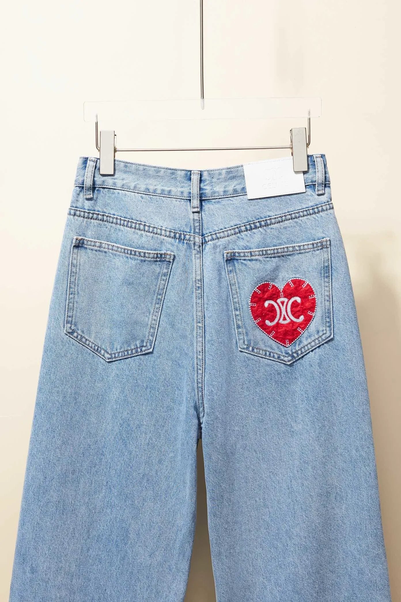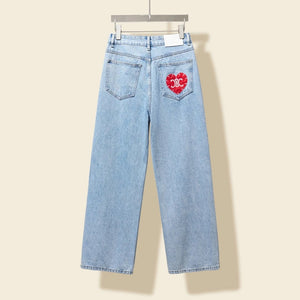 Celine Jeans Red Heart Embroidered Denim Pants for Women Versatile Casual