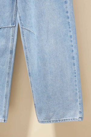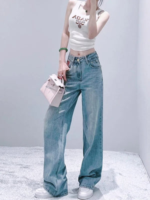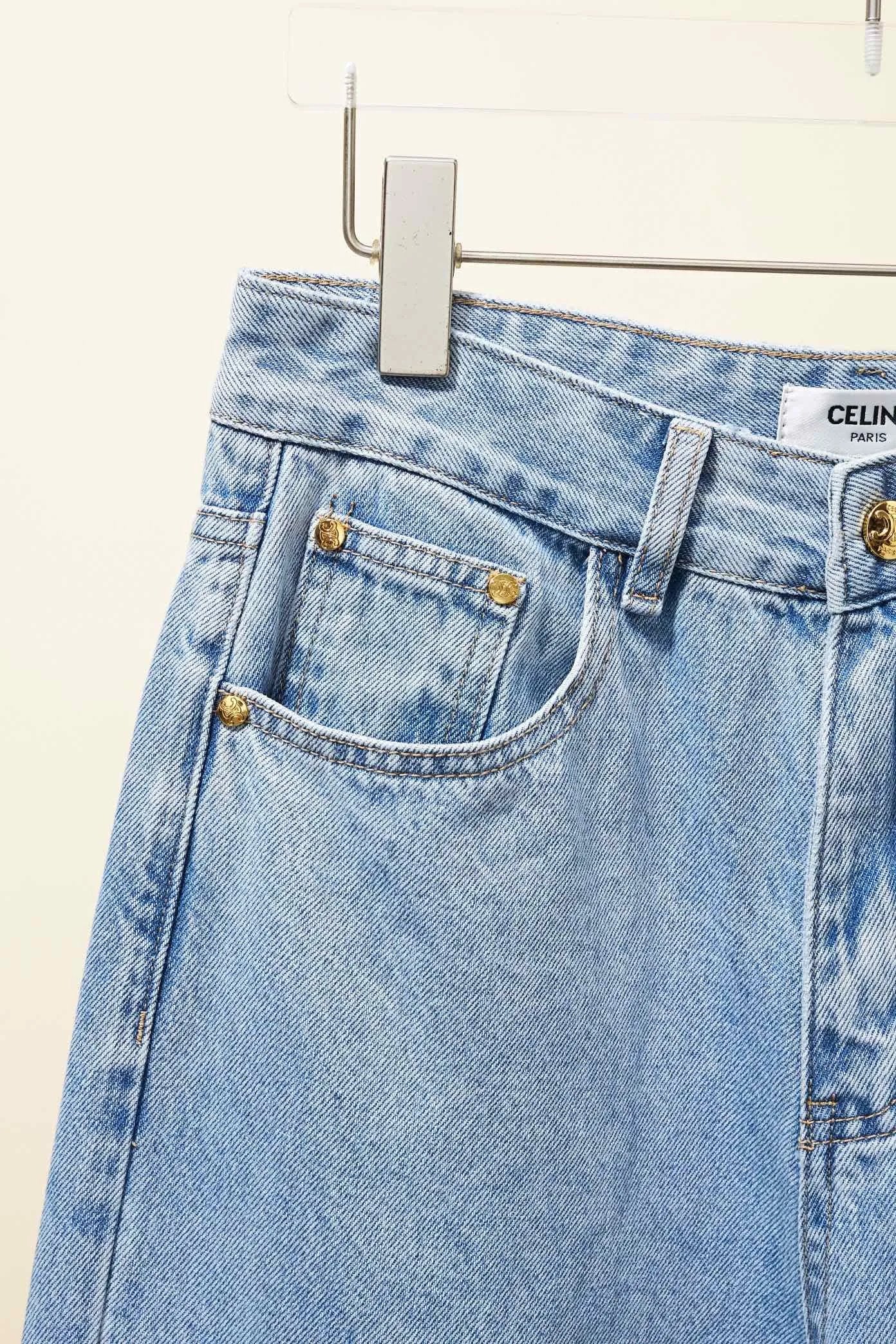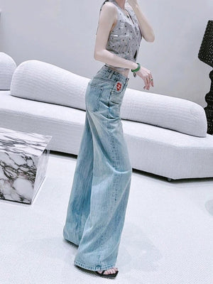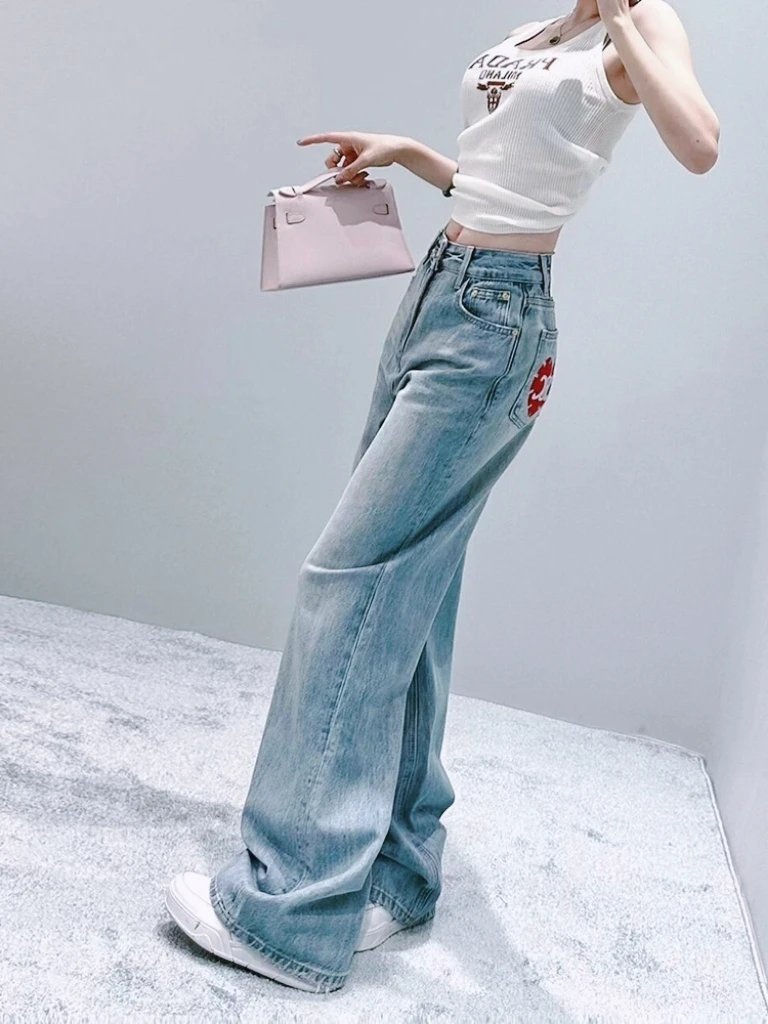 Siro fabric, red logo embroidery on the cut piece, enzyme stone wash, custom hardware, high-waisted straight-leg design, knee design makes the pants no longer monotonous, and the red embroidery embellishment is very eye-catching. Matches perfectly with any top!