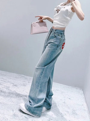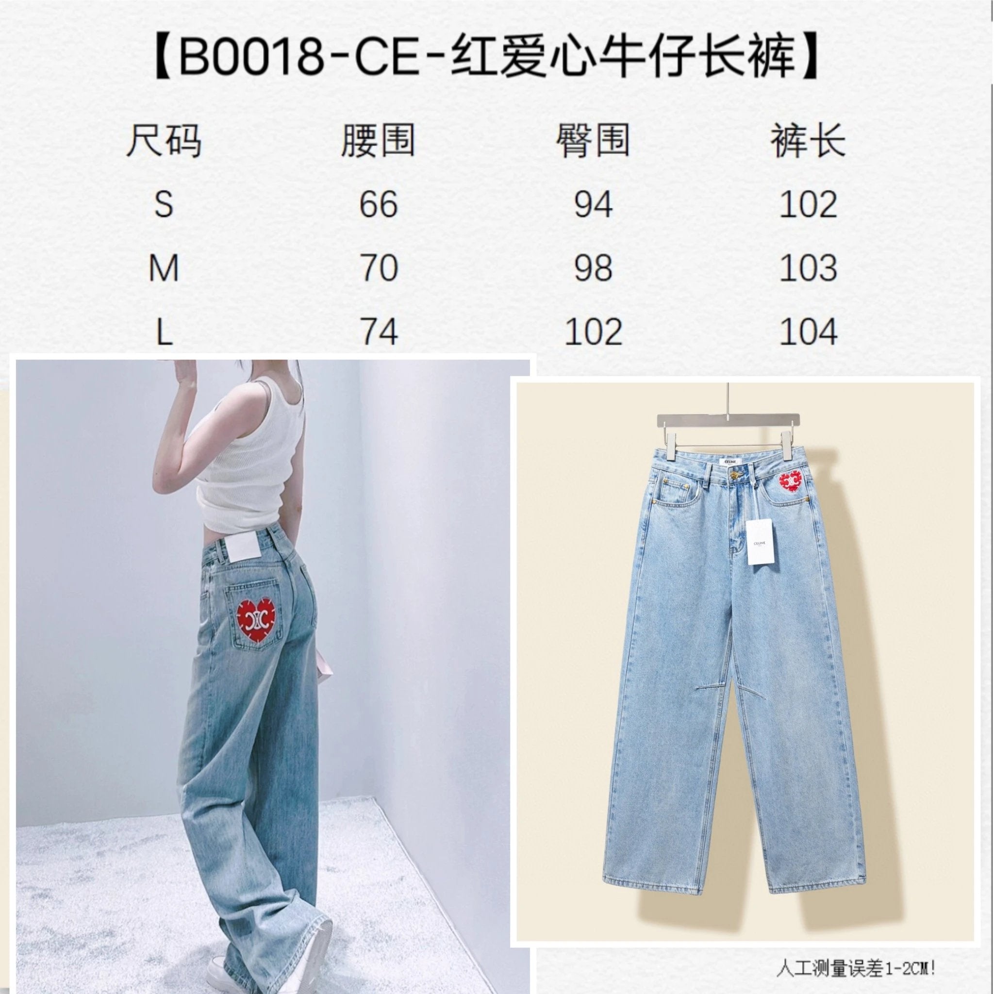 Top Version Ce*ine Sailin Red Heart Embroidered Denim Long Pants Women Versatile Casual