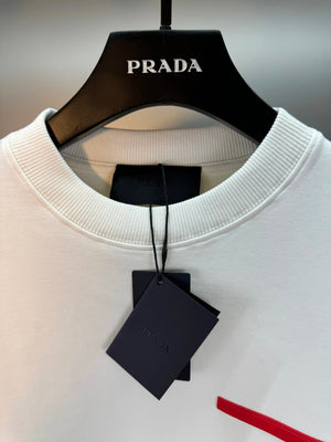 The body is made of recycled technical fabric with a structured silhouette, featuring a round neck and heat-sealed trim. Prada Linea Rossa features latex logo decoration, highlighting the brand's style.