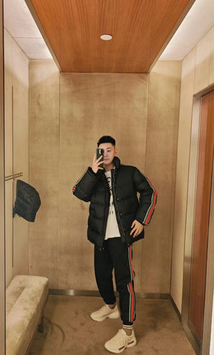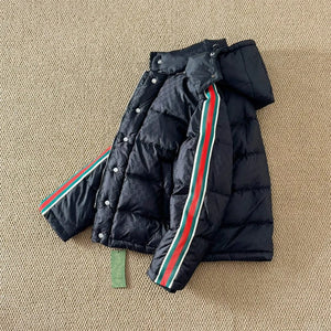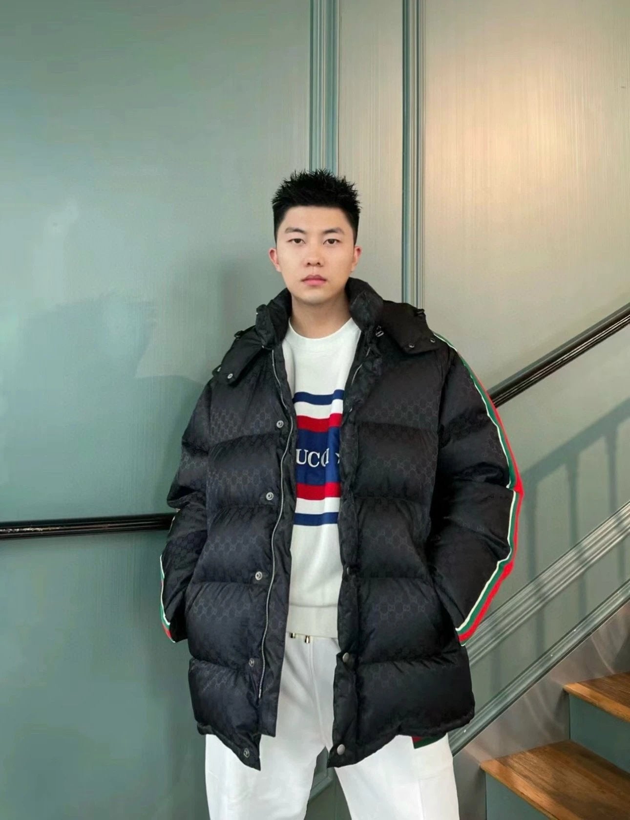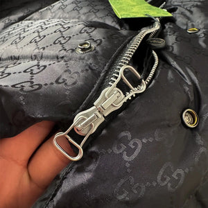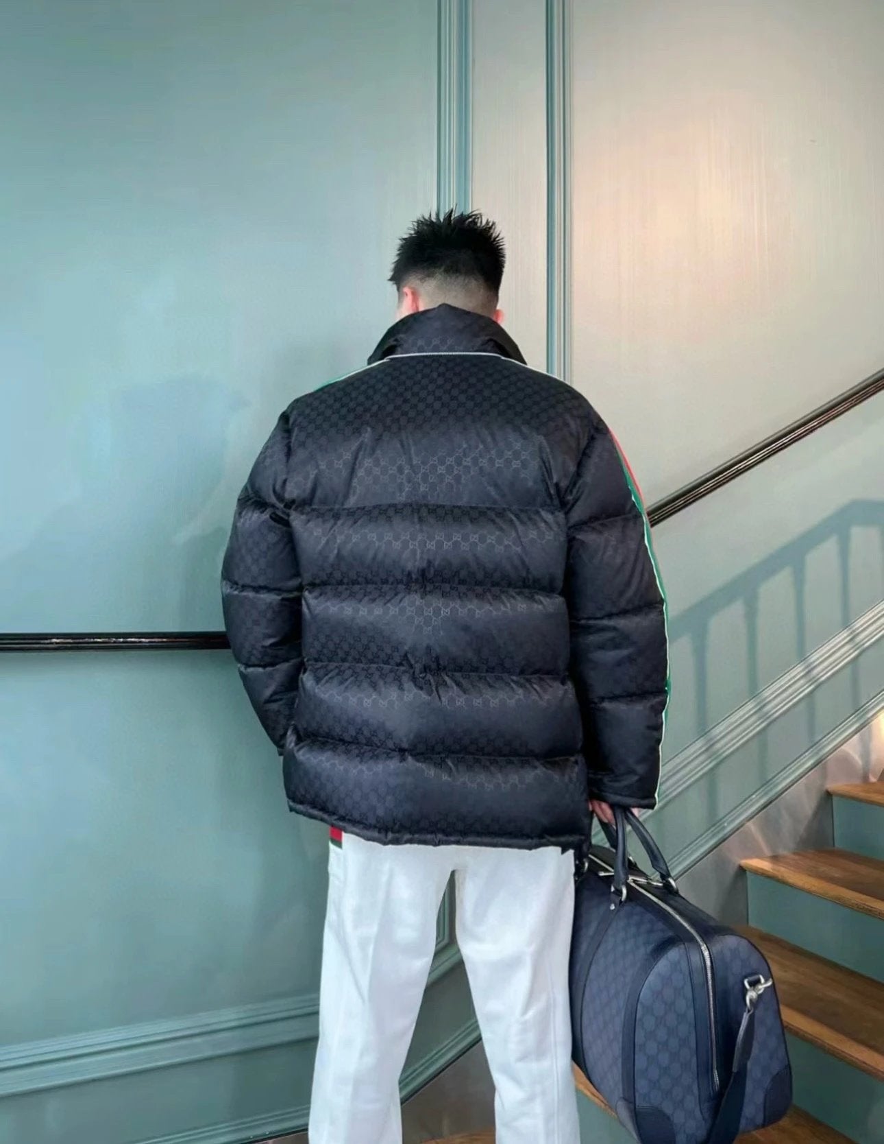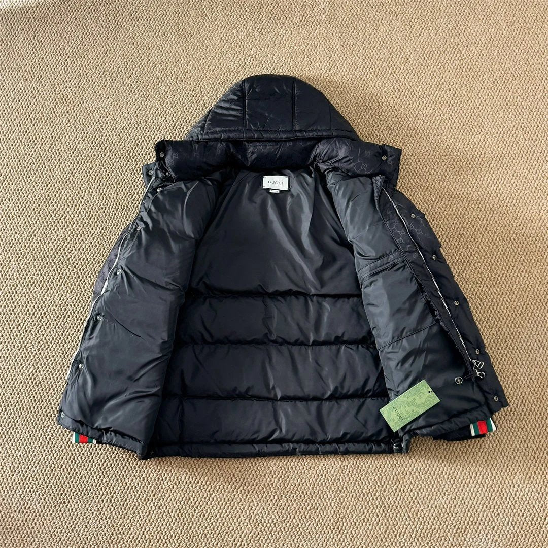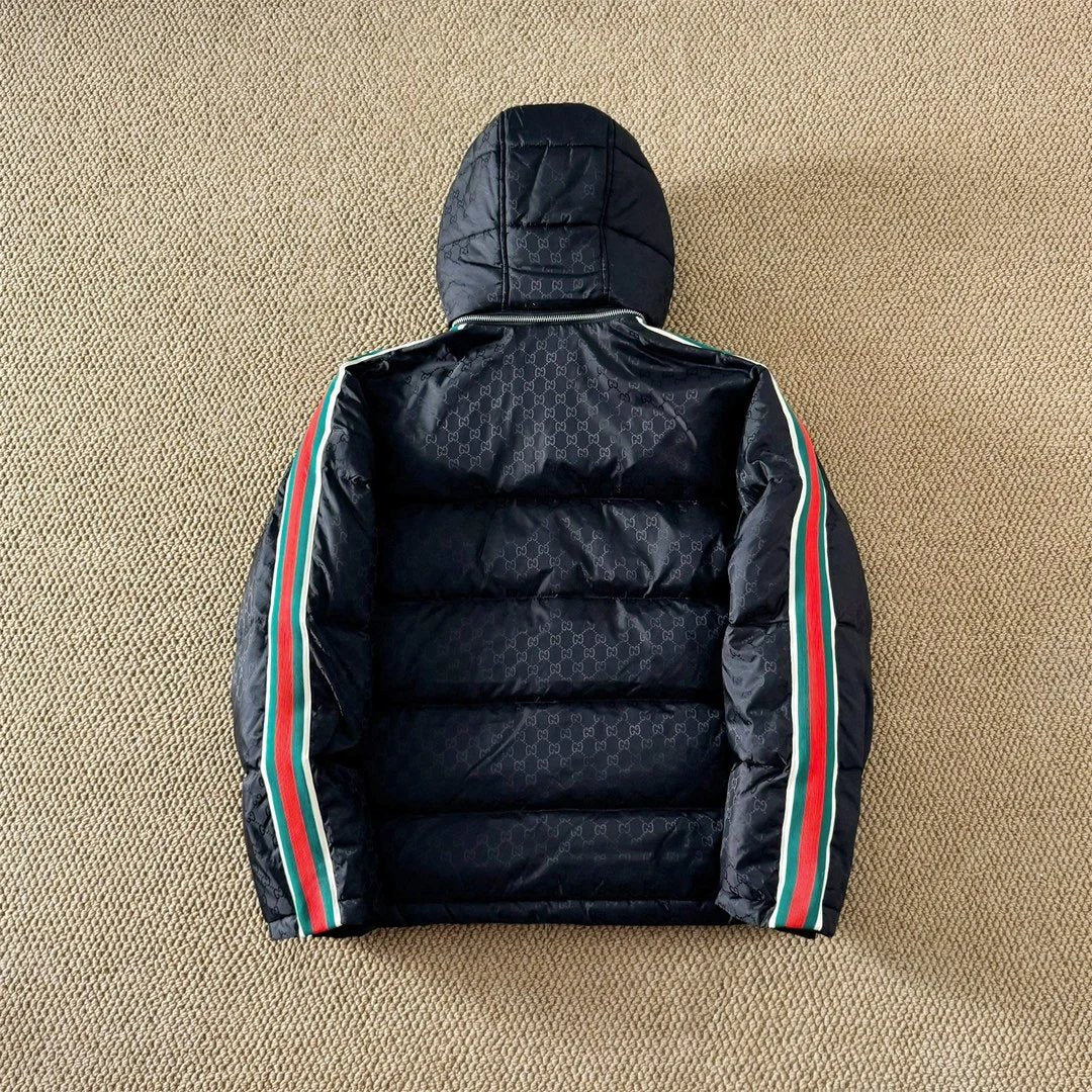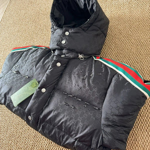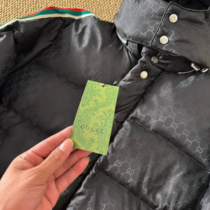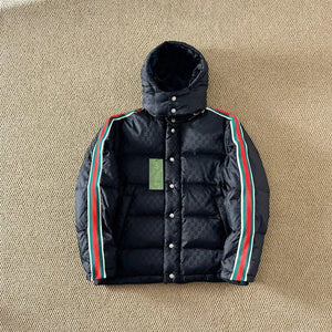 Gucci Down Jacket SS24New Full Print Jacquard Red and Green Webbing Down Jacket with Detachable Hat Unisex Coat