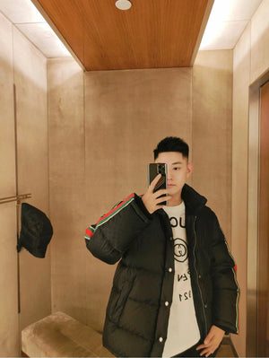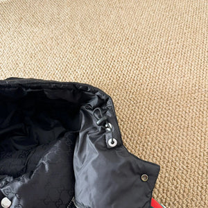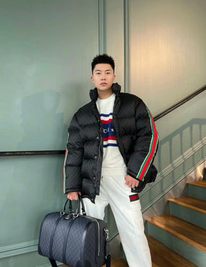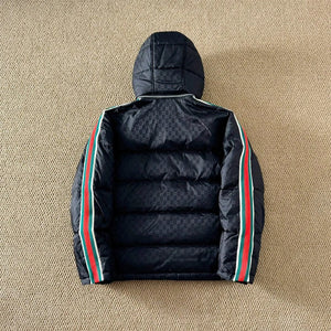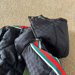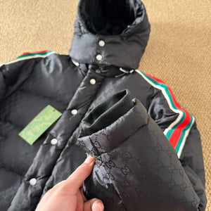 GUCCI Gucci SS24 New Full Print Jacquard Red and Green Webbing Down Jacket Detachable Hood Unisex G Brand Coat