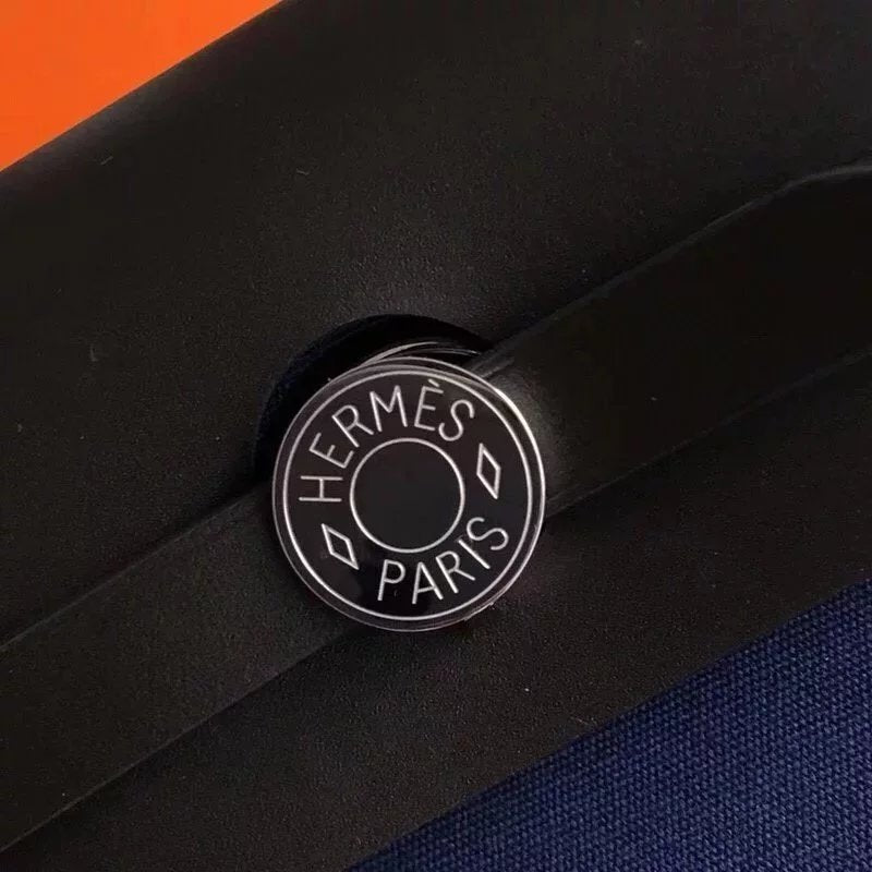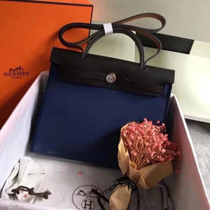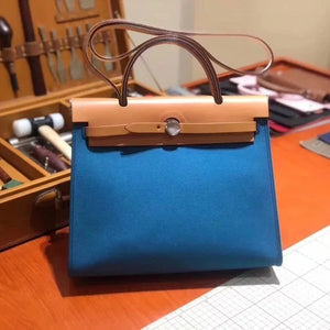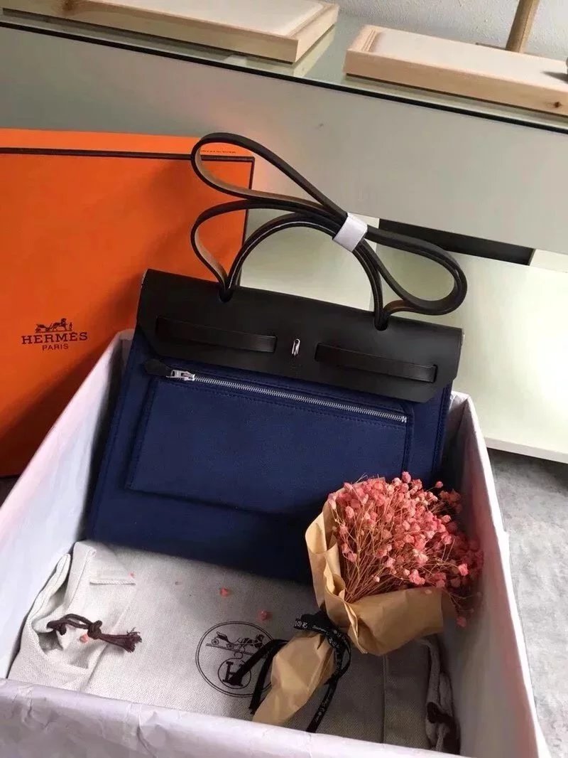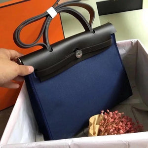 Hermes men's bag Top version 【H Handmade】Canvas Bag herbag31Canvas Stitching Leather One Shoulder Women's Crossbody Handbag Elephant Gray Electric Light Blue