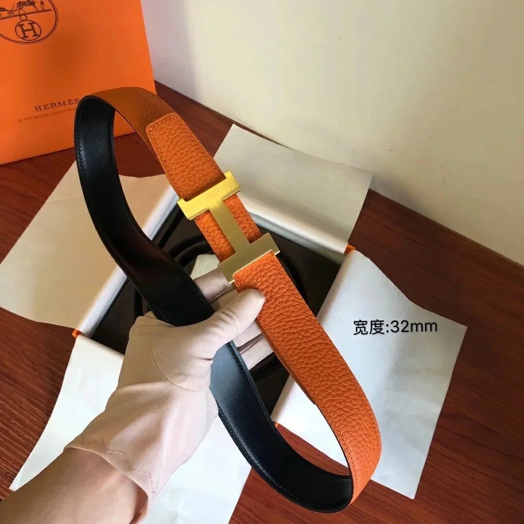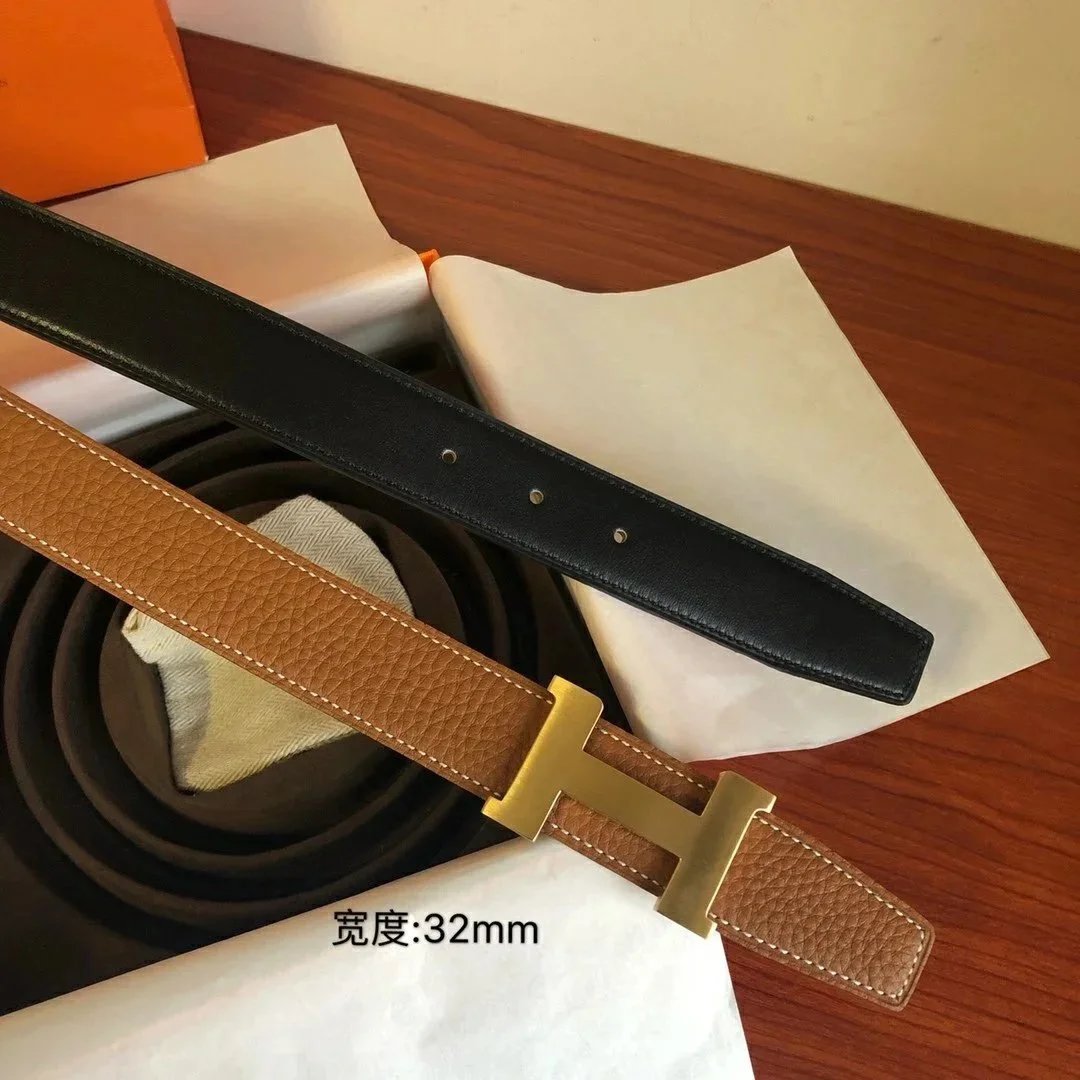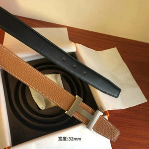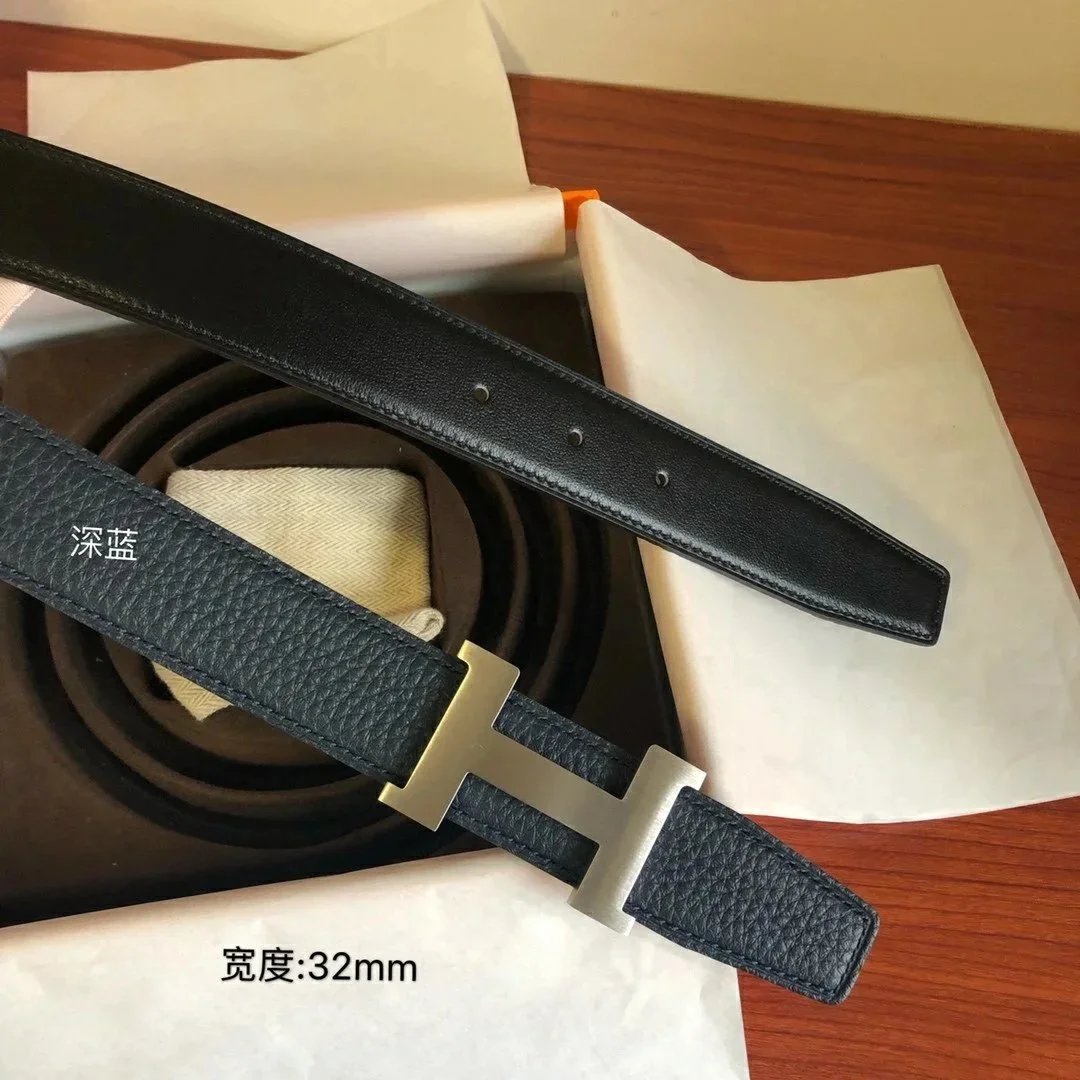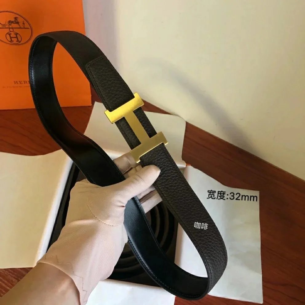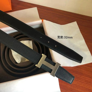 Hermes Belt Top version Men's Leather Belt Genuine Leather Casual Versatile Business Casual Belt Litchi Grain Cowhide Double-Sided Belt3.2cm