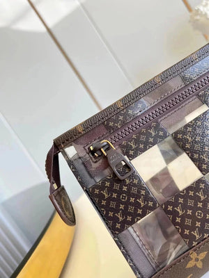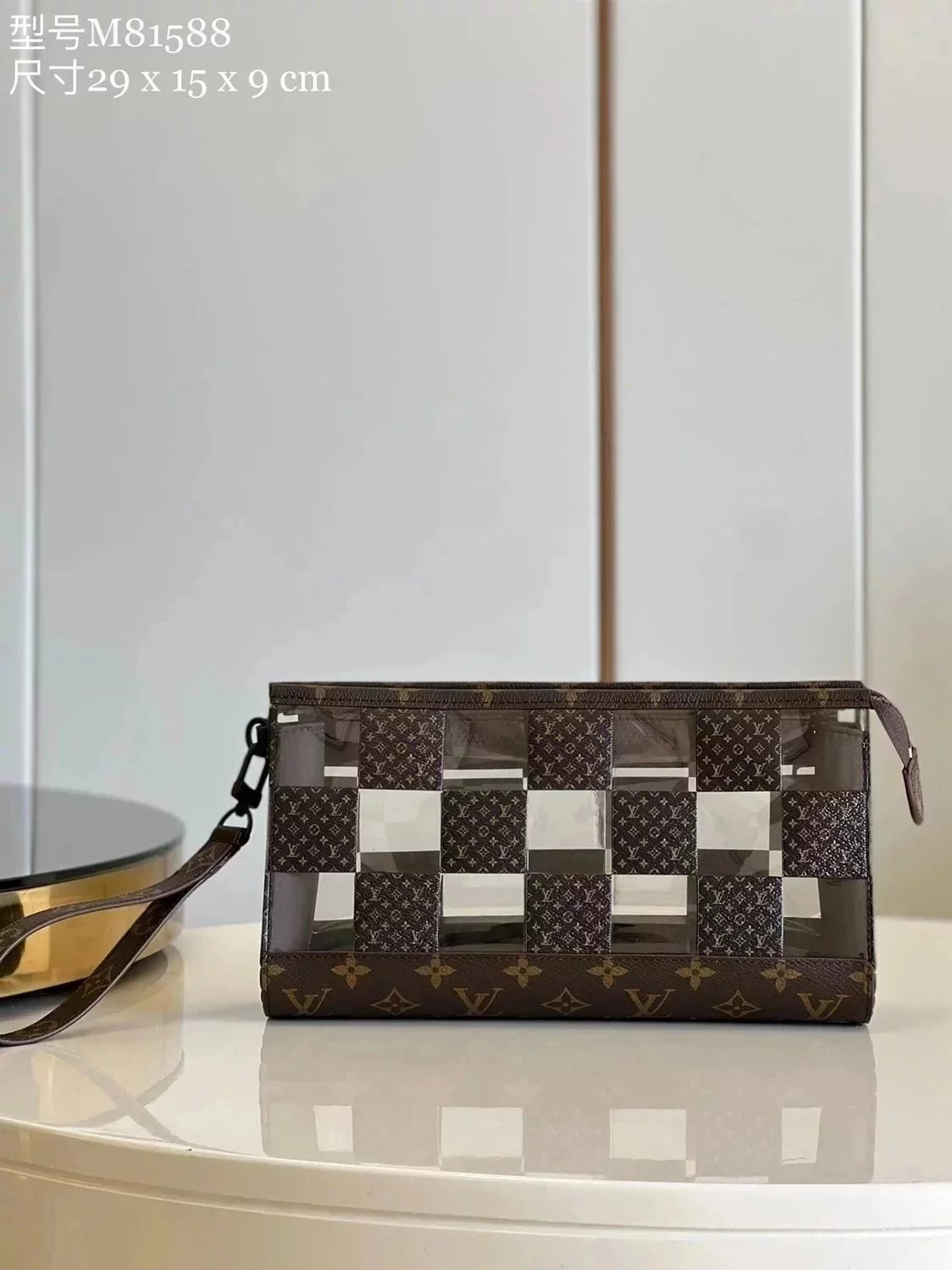 [Exclusive Real Shot M81588] Standing Pouch Clutch Inherits the Triangular Configuration of SAC Tricot Handbag 1934, Creating a Trend Choice for Carrying Daily Needs. Monogram Pattern and Transparent PVC Fiber Piece Together Damier Plaid. Shows the Classic Fusion of Monogram Chess Elements. Size 29X15X9cm Instructions before Purchase