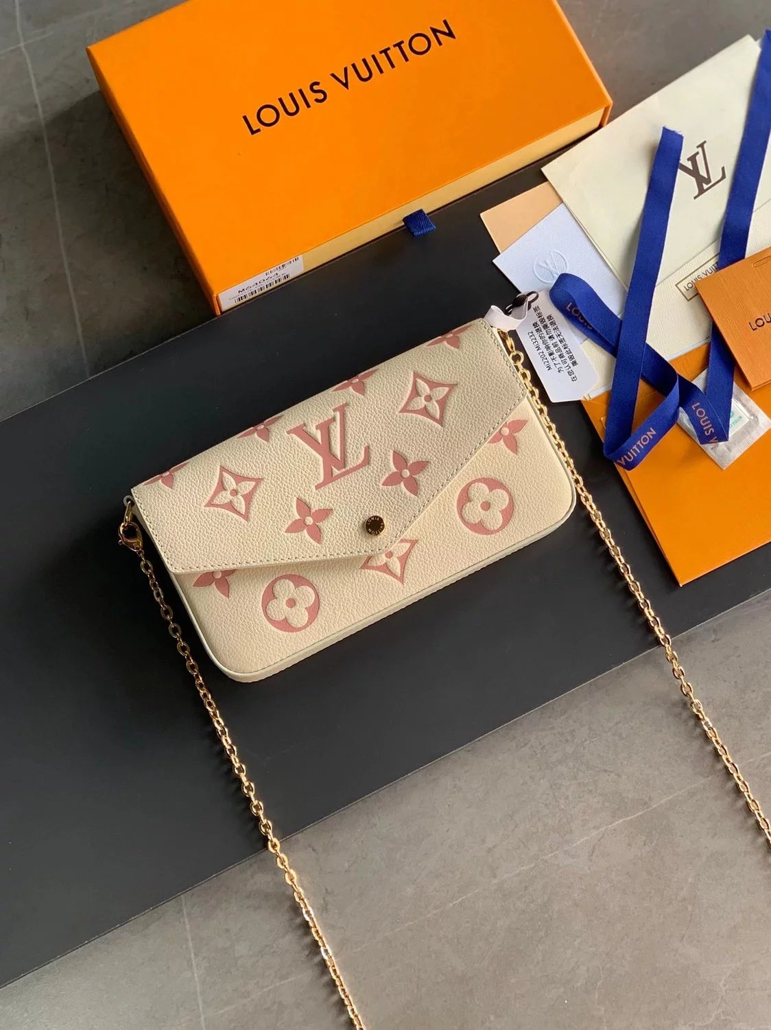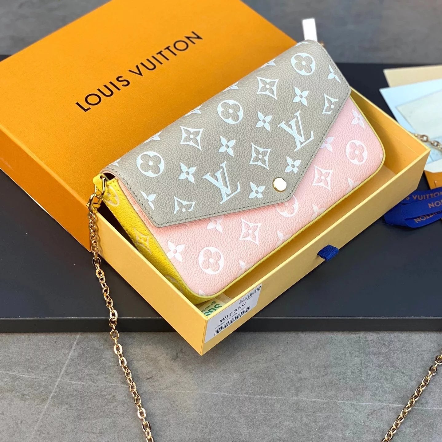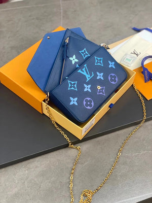 M82349 Silk Screen Blue! Félicie Pochette Chain Bag! The Special Félicie Pochette Chain Bag Renders Monogram Empreinte Soft Grain Leather in Subtle Gradient Colors, with Monogram Embossing on It, with Removable Chain and Removable Pocket. The by the Pool Capsule Series Is Also Available in Ready-to-Wear, Leather Goods and Accessories.