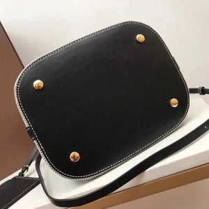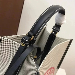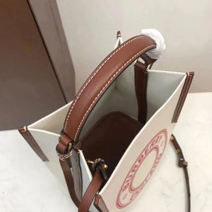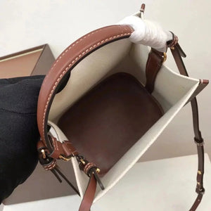 [B Home **Original Order] Equestrian Style Cotton Canvas Bucket Bag, Using Contrast Color Leather Edge Design, Decorative Brand Logo Pattern; the Package Version Is Exquisite, Named from the Shetelan Pony of Elizabeth II; it Can Be Carried by Hand with Top Handle Or with Adjustable Shoulder Strap.