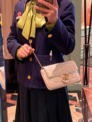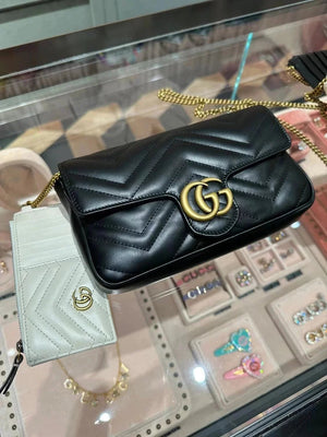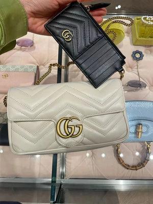 With a Full Set of Original Green Box Packaging GG Marmont Series Decorative Card Holder Mini Chain Wallet. The Double G Accessory Design Infuses Traditional Essence into the Brand's Modern Style, Bringing Meaningful Items to the Wardrobe. This Mini Chain Card Holder Is Equipped with Chain Straps, Made of Iconic Black Matelass V-Leather, and Has Removable White Color Contrast Leather Card Holder inside. Black Matelass V-Leather, Additional White Leather Card Holder, Ancient & Gold Tone Accessories, Suede Texture Moire Fabric and Microfiber Blended Lining, Double G, Interior: 2 One Card Compartment, Removable Zipper Card Holder, exterior: 1 One Back Pocket with Snap Closure. Weight: about 0.44 7,000G.