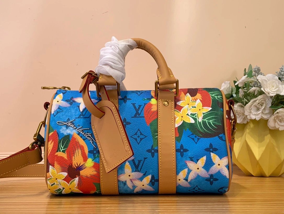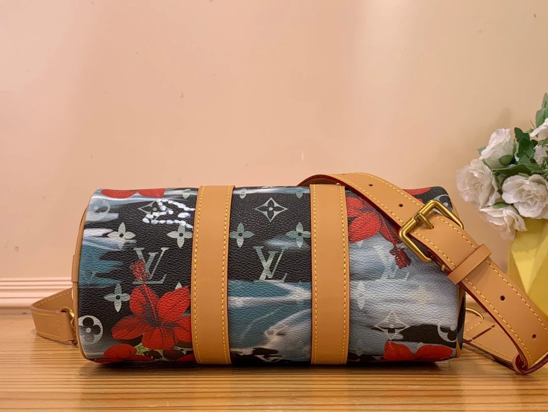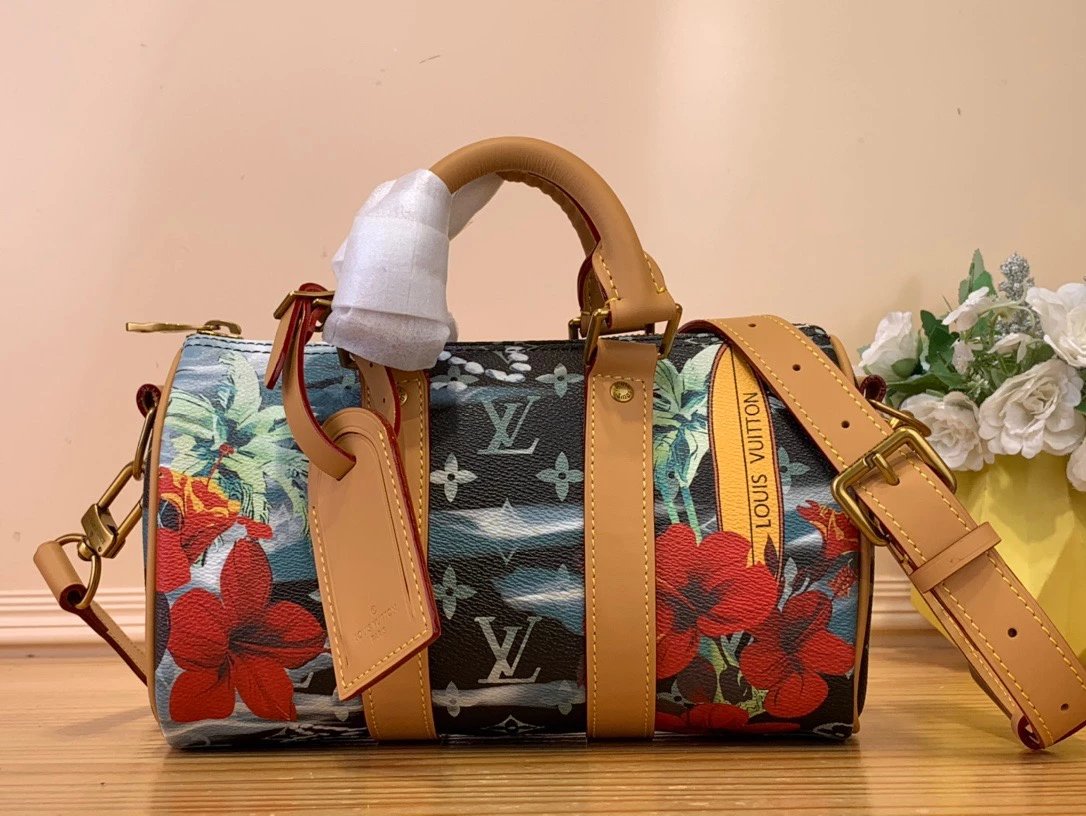 The Small Version of Louis Vuitton's Famous Keepall Travel Bag Is Made of Pharrell Williams's Monogram Surfin' Canvas and Combines a Variety of Summer-Rich Patterns into Delicate Prints. The Design and Tropical Printing of the Bag Inject Retro Style into This Urban Bag, and It Is Also Equipped with Detachable Shoulder Straps and Two Leather Handles, Which Can Be Carried in Various Ways.