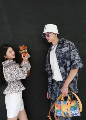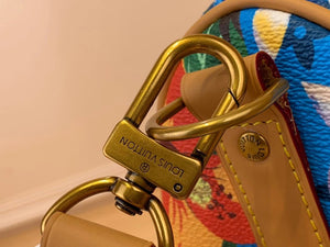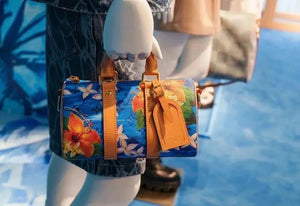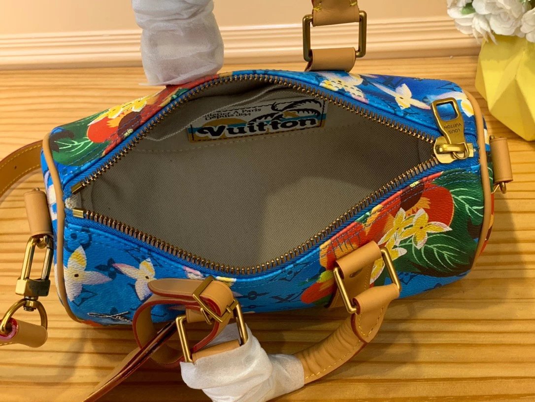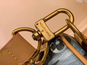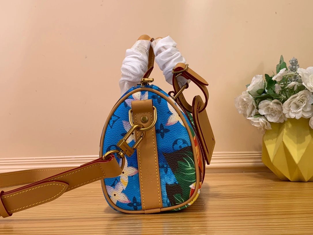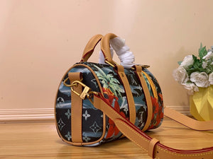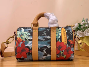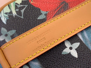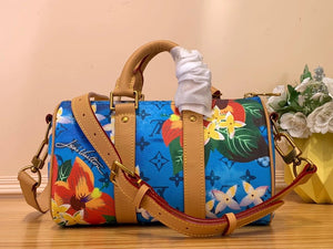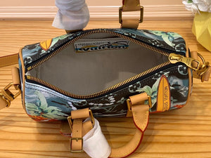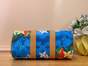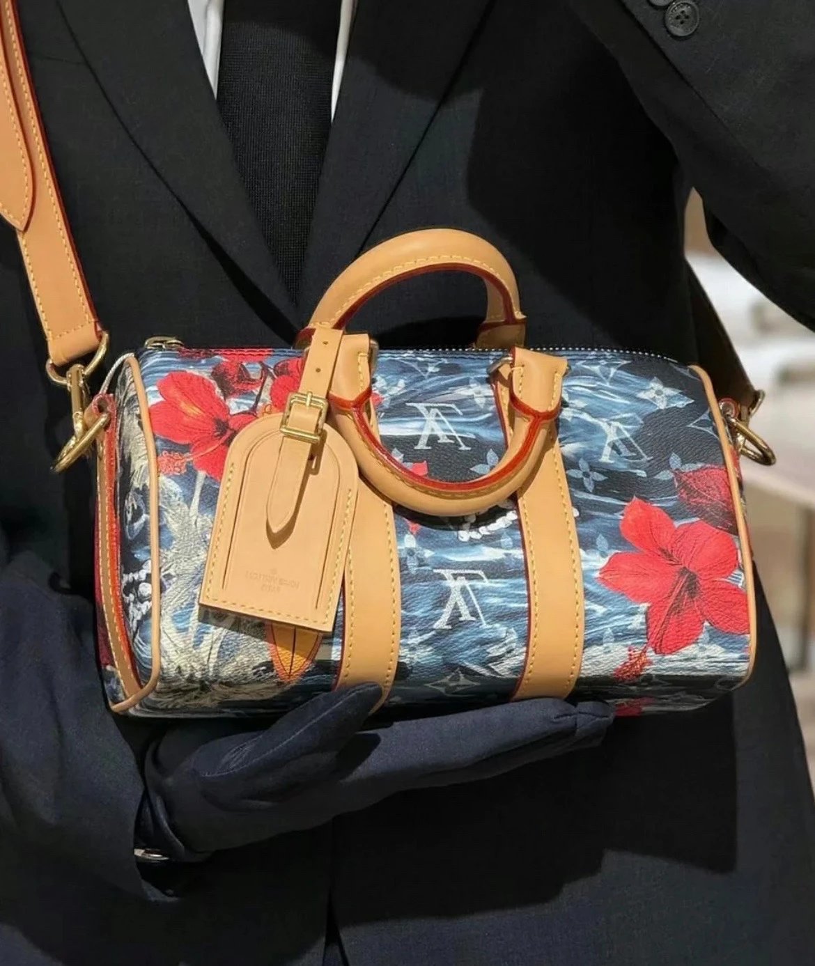 The Small Version of Louis Vuitton's Famous Keepall Travel Bag Is Made of Pharrell Williams's Monogram Surfin' Canvas and Combines a Variety of Summer-Rich Patterns into Delicate Prints. The Design and Tropical Printing of the Bag Inject Retro Style into This Urban Bag, and It Is Also Equipped with Detachable Shoulder Straps and Two Leather Handles, Which Can Be Carried in Various Ways.