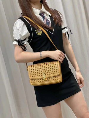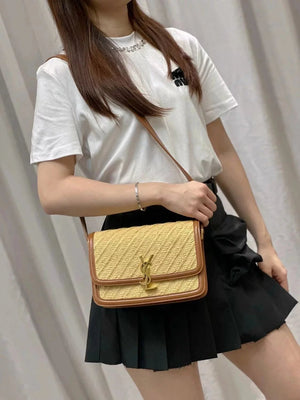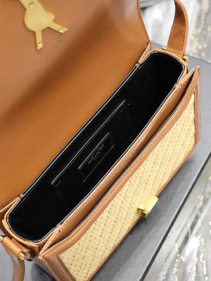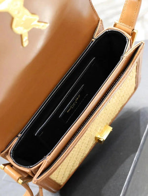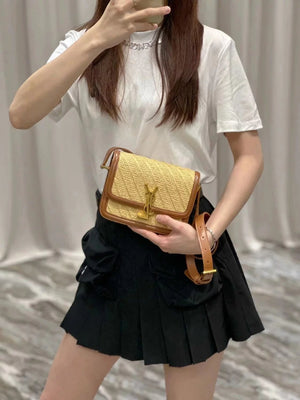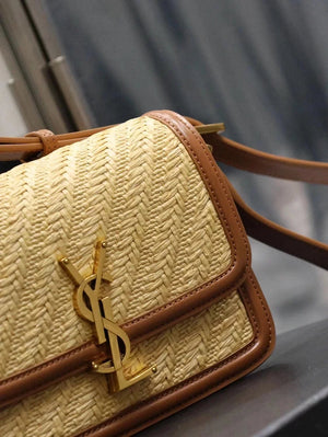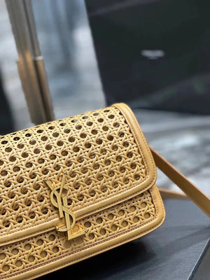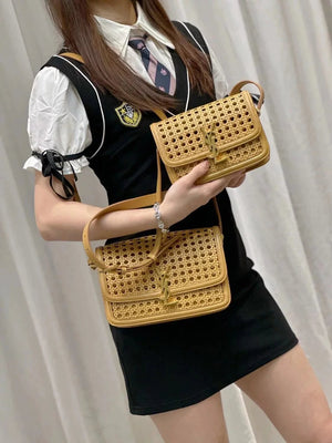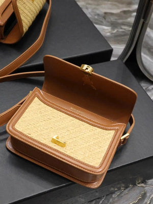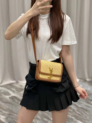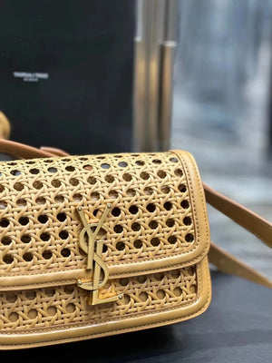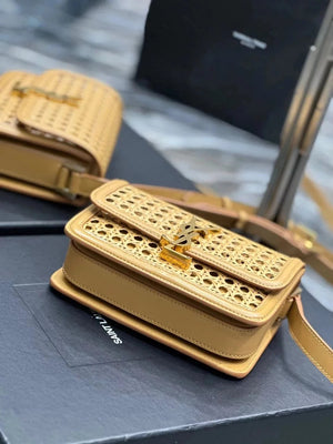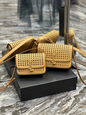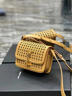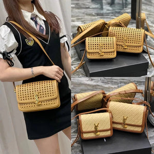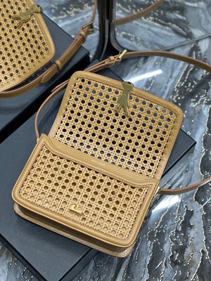 YSL Women's Bag Top version 【Super Quality】2023New woven bag Solferinobox_Apricot Bamboo Woven with Cowhide Gold Buckle Hollow Design Bamboo Woven Bag Raffia Series New Woven Square Bag Flap Messenger Bag Summer New Women's Bag