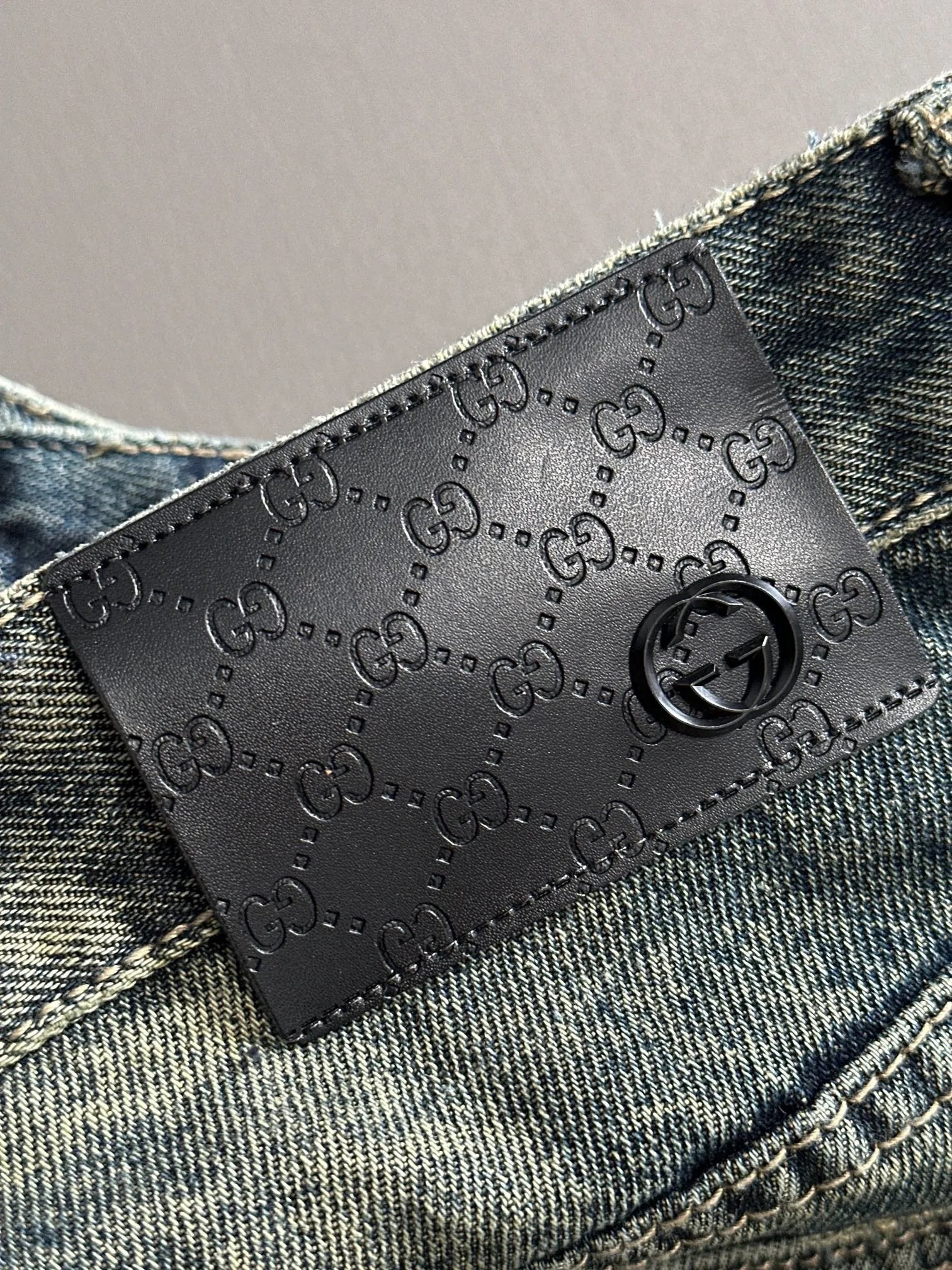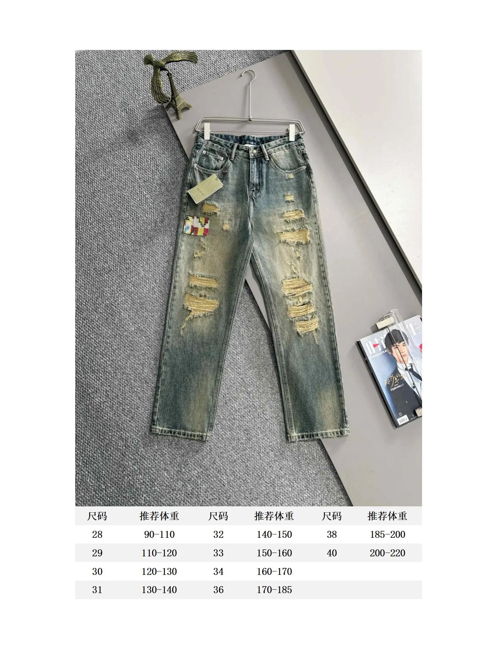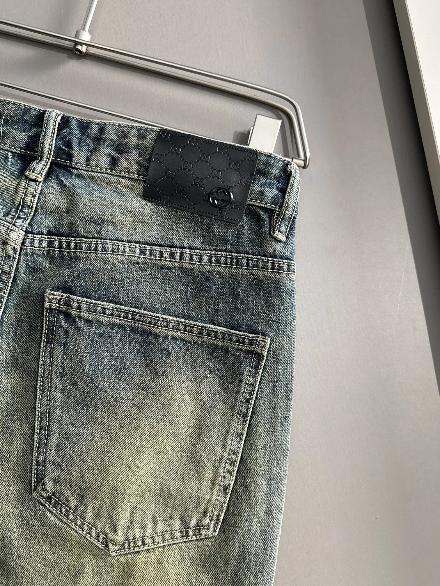 Gucci Jeans Top Version with Holes, No Leaking, Back Waist Leather Label logo Straight Washed Blue Jeans Autumn Winter New Unisex Loose Casual Wide Leg High Waist Pants