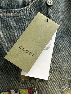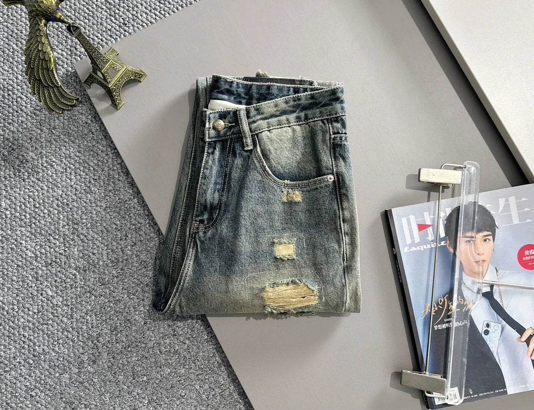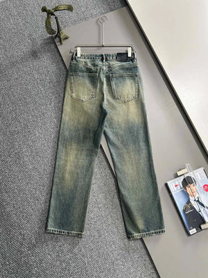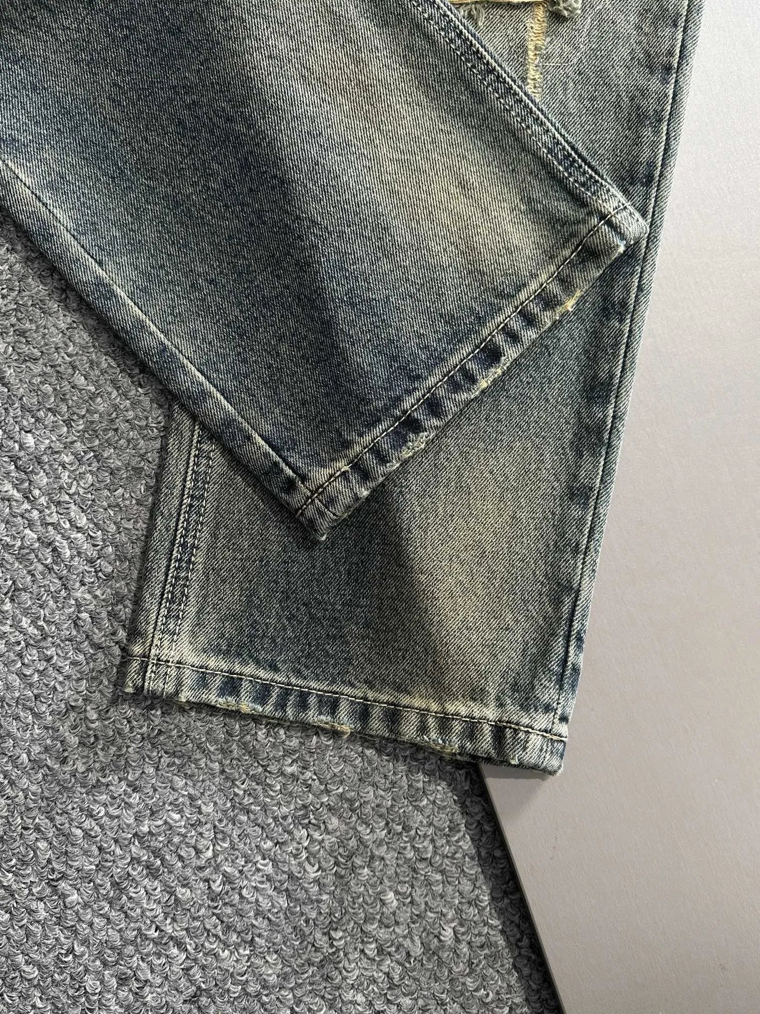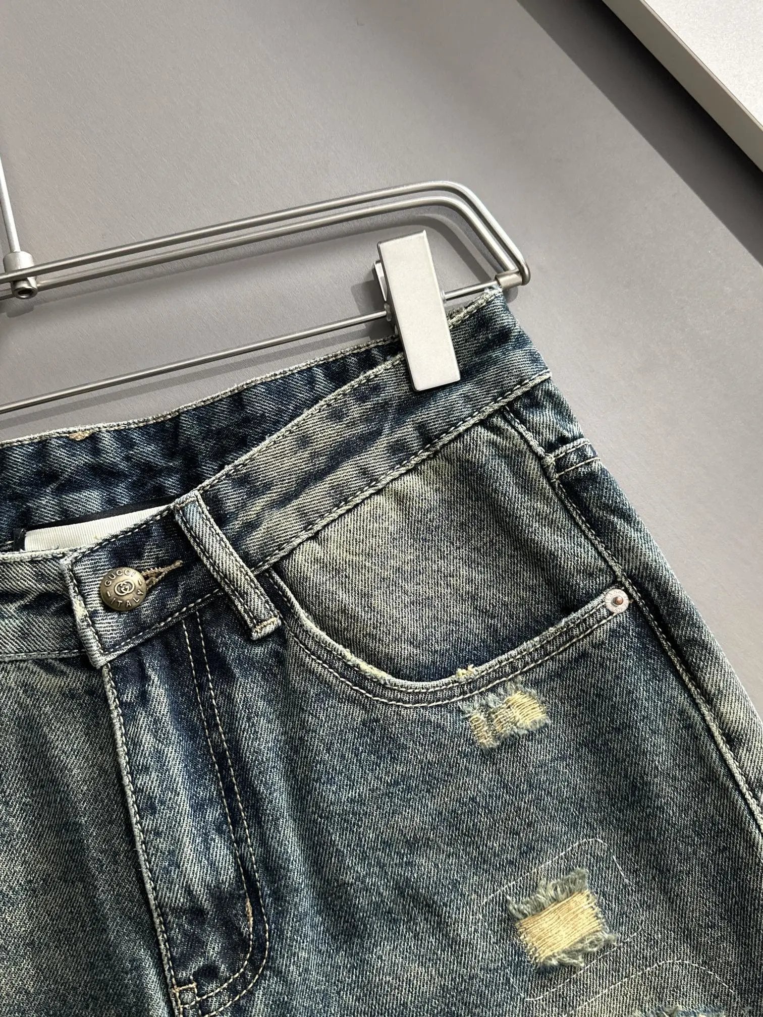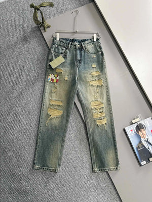 Gucci Jeans Top Version with Holes, No Leaking, Back Waist Leather Label logo Straight Washed Blue Jeans Autumn Winter New Unisex Loose Casual Wide Leg High Waist Pants