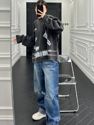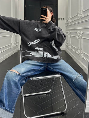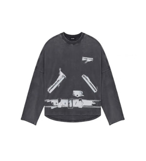 **Version We11done2023 Spring/Summer New Dark Gray Printed Long-Sleeved Top T-shirt for Men and Women