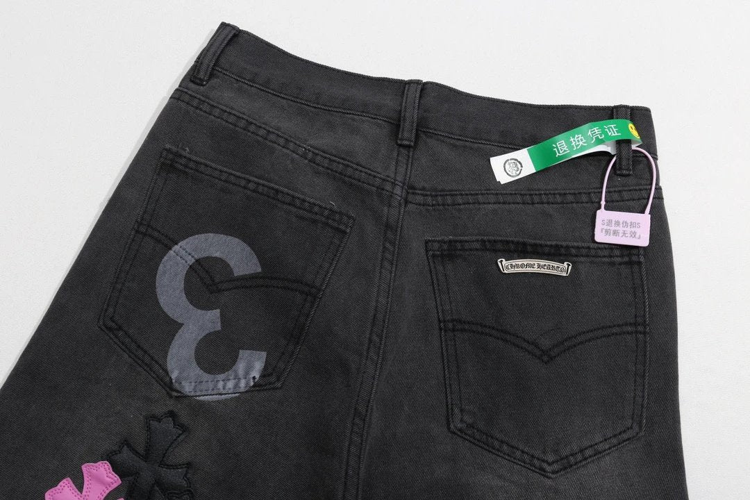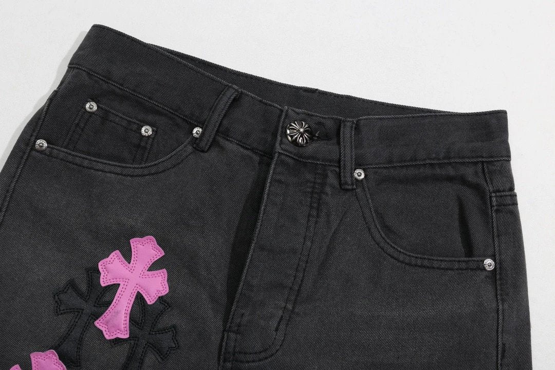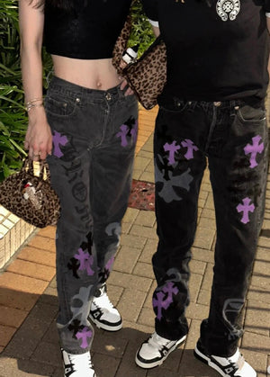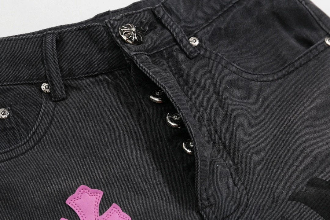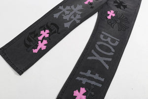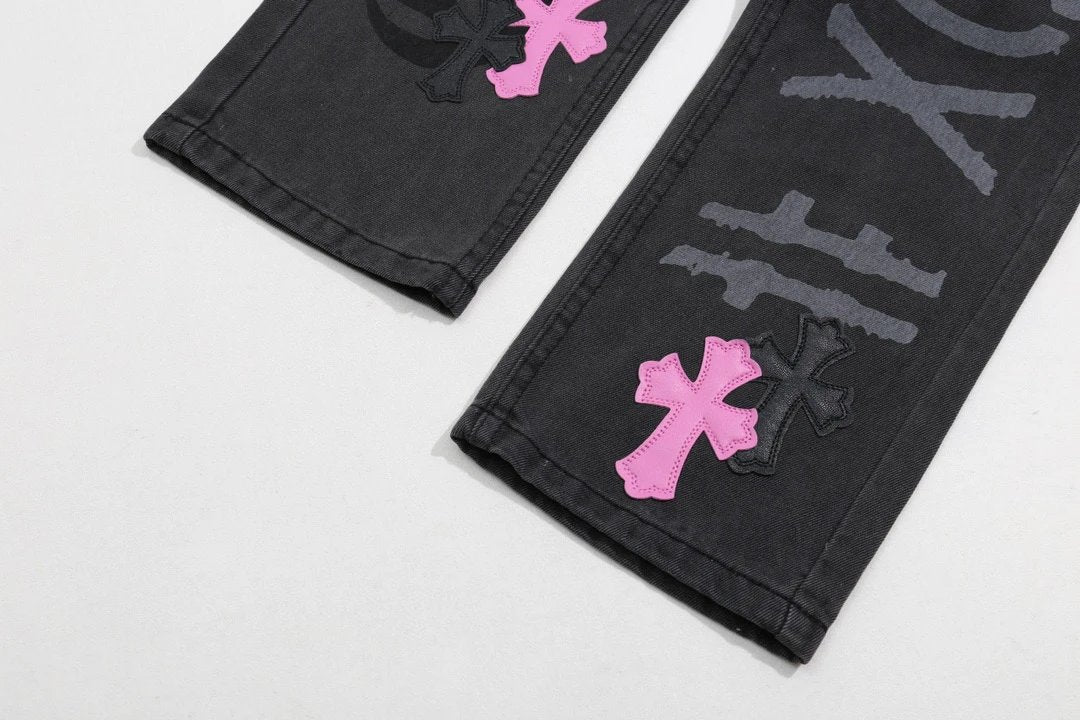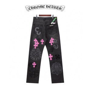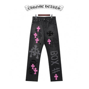Chrome Hearts Jeans Unique Spray-Painted Mixed Purple Leather Cross logo25ss Spring Summer New Straight Loose Jeans Unisex Slim Fit Long Pants