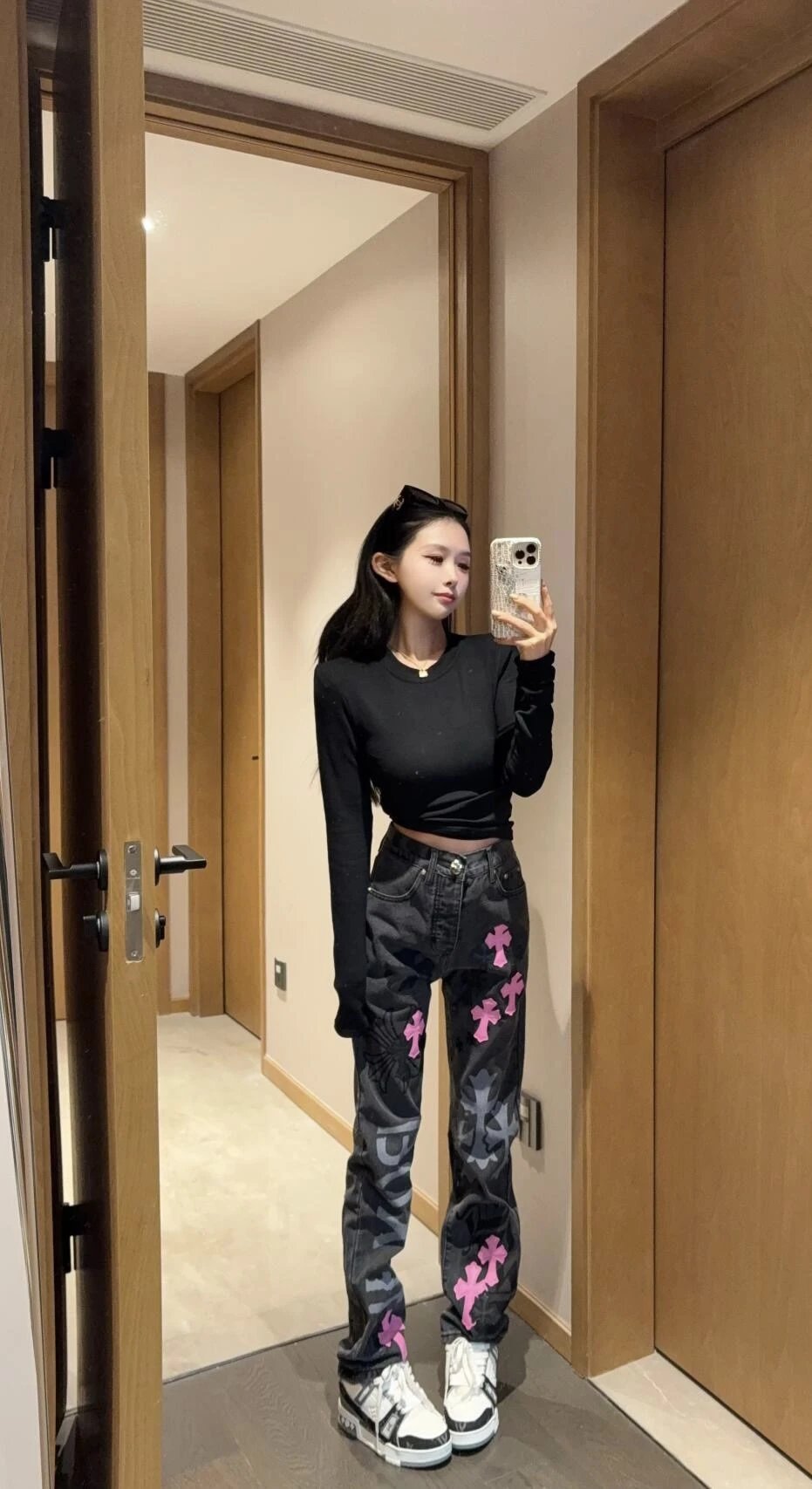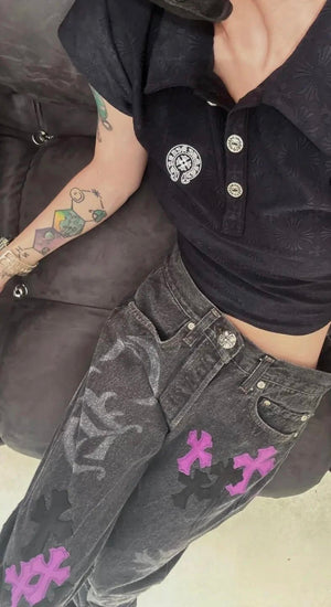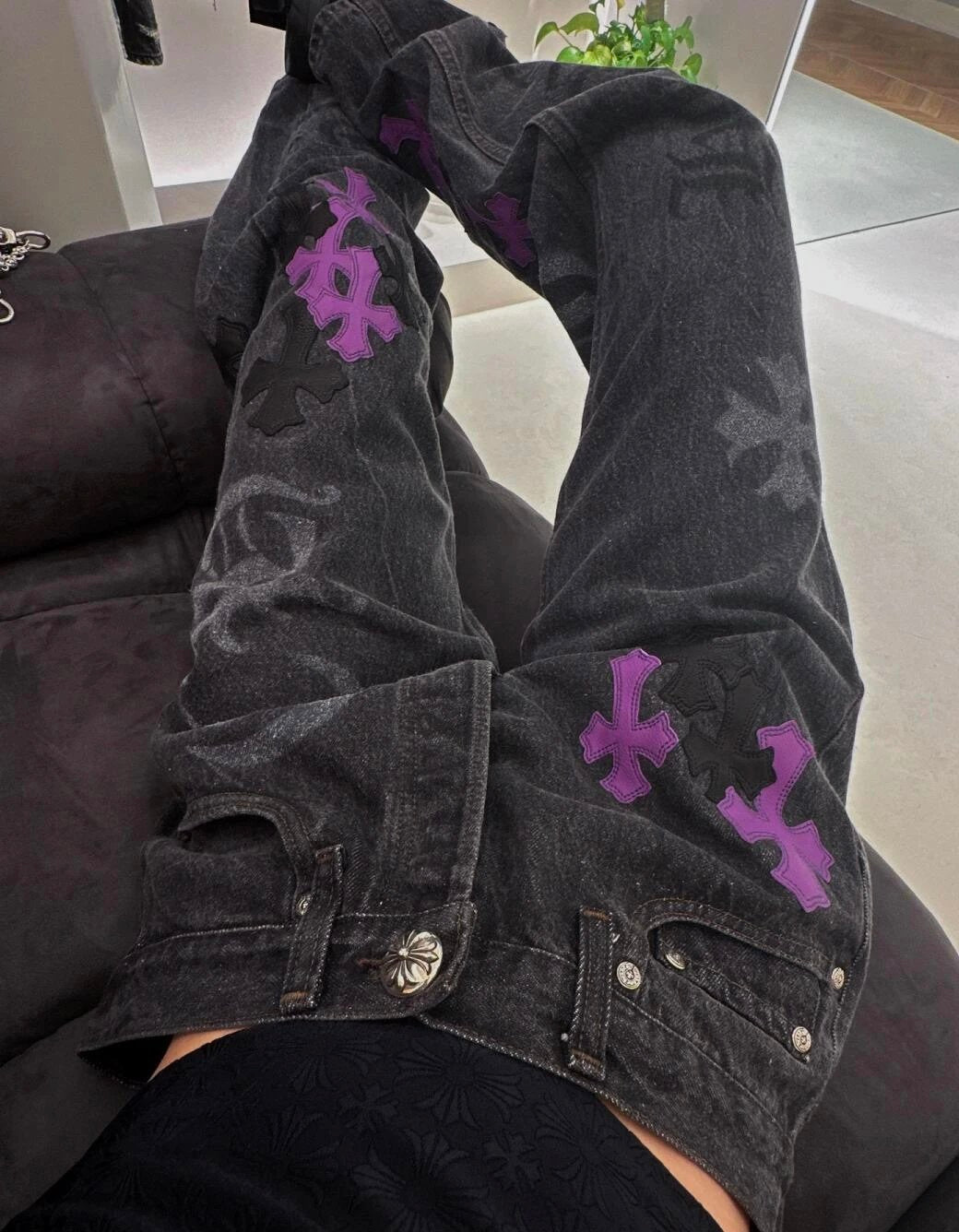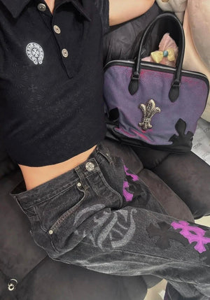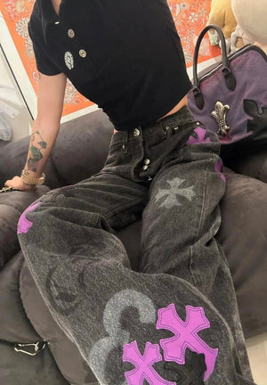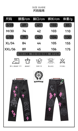 Chrome Hearts Jeans Unique Spray-Painted Mixed Purple Leather Cross logo25ss Spring Summer New Straight Loose Jeans Unisex Slim Fit Long Pants