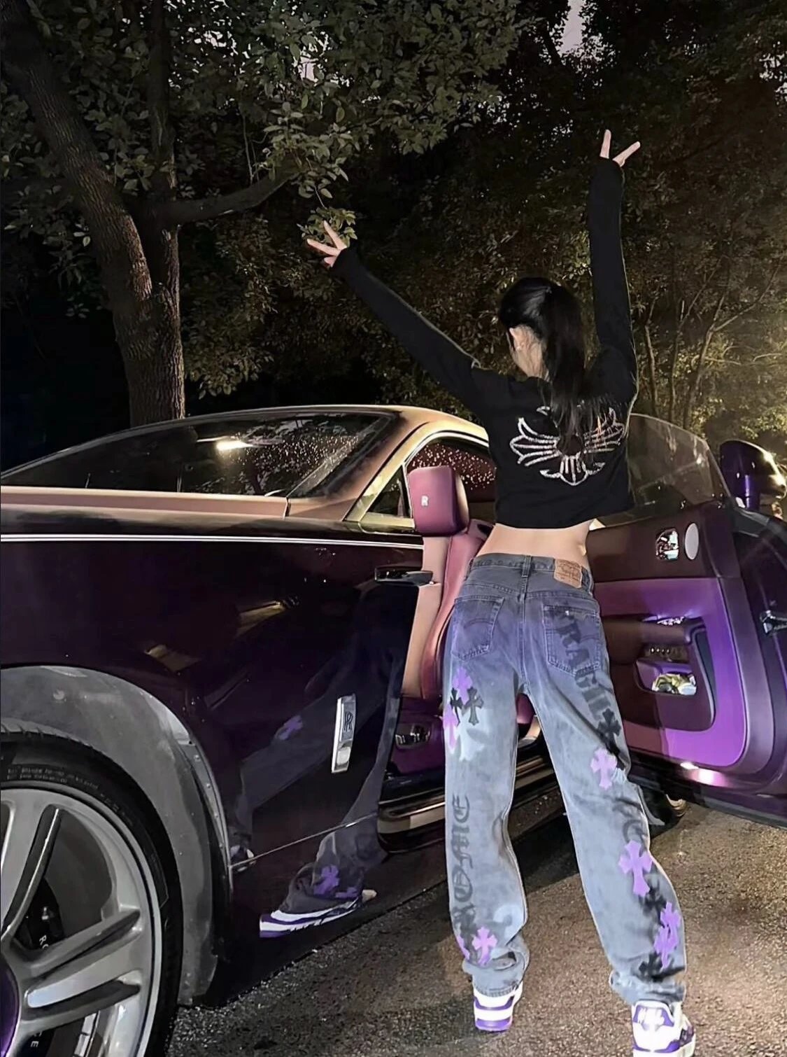 24SS Custom Spray Paint Purple Leather Limited Edition Jeans by Krox Heart