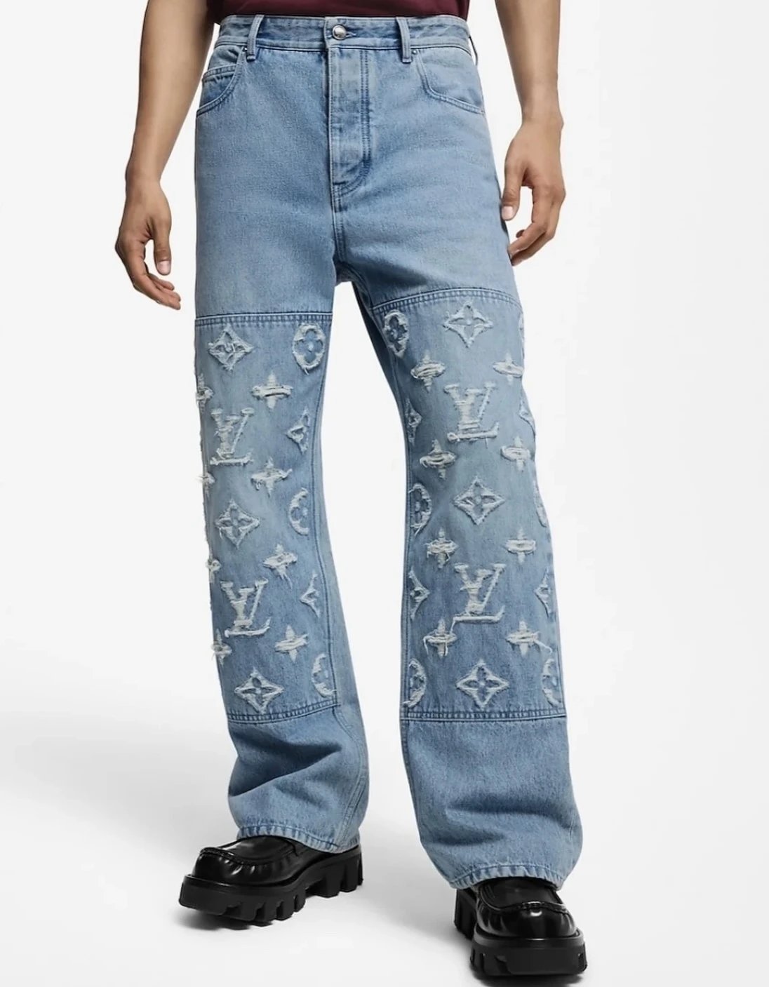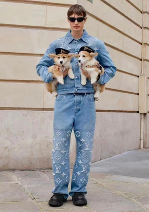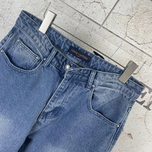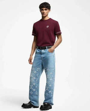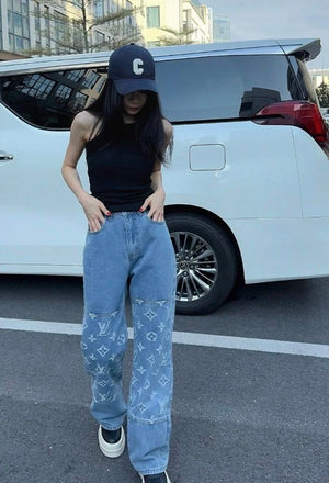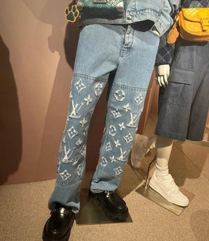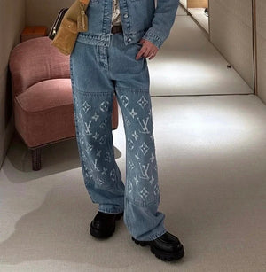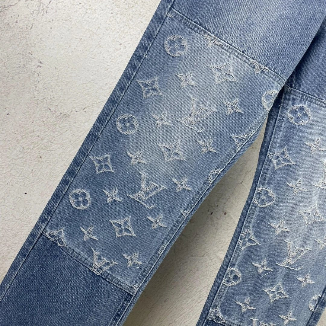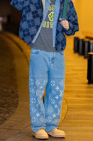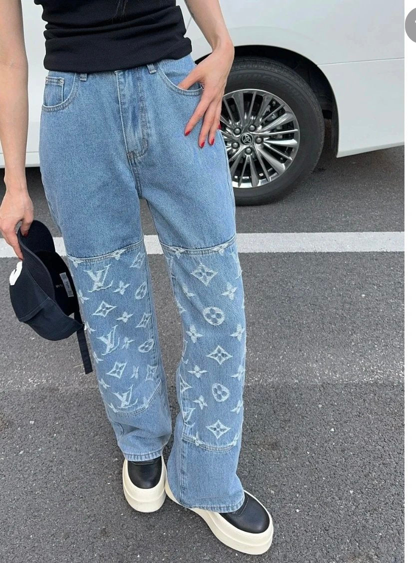Louis Vuitton LV Jeans Vintage Patchwork Jacquard Straight Washed Blue Jeans Autumn Winter New Unisex Loose Casual Wide Leg High Waist Pants