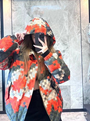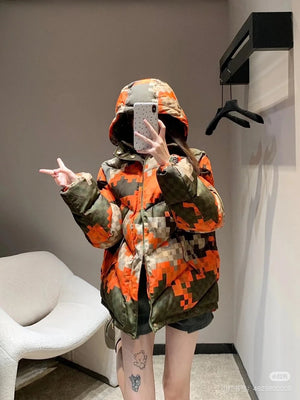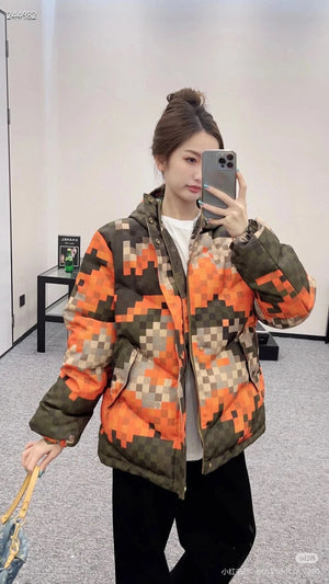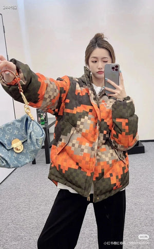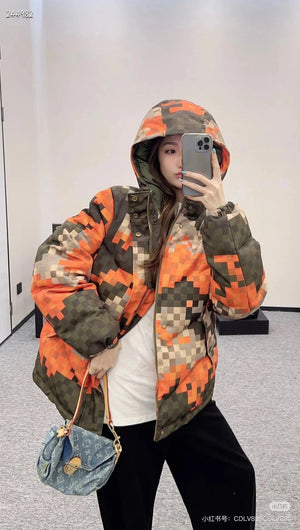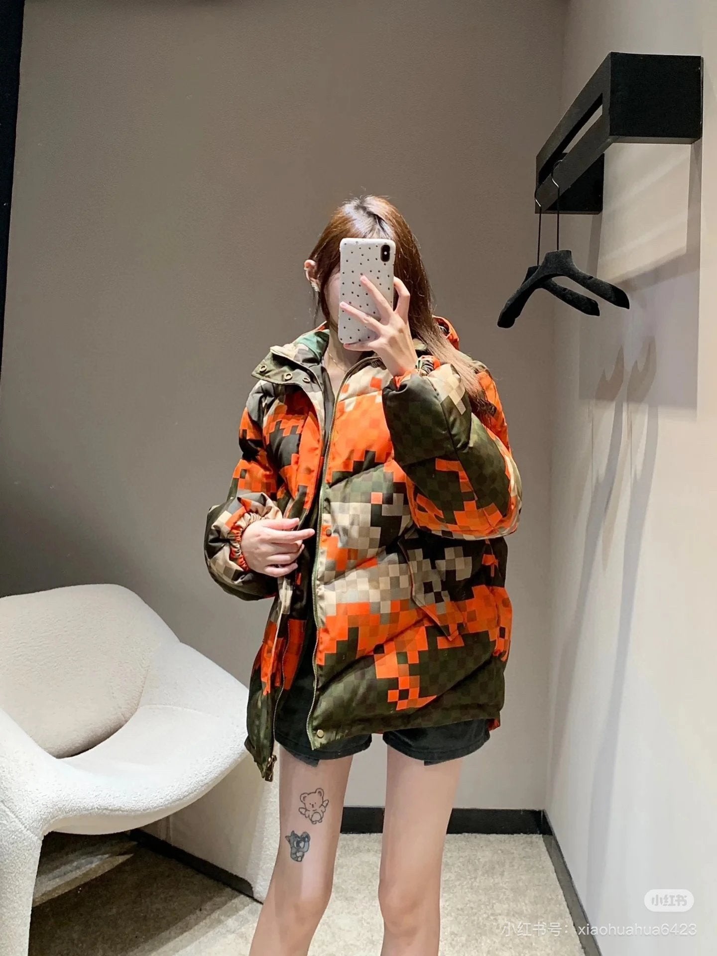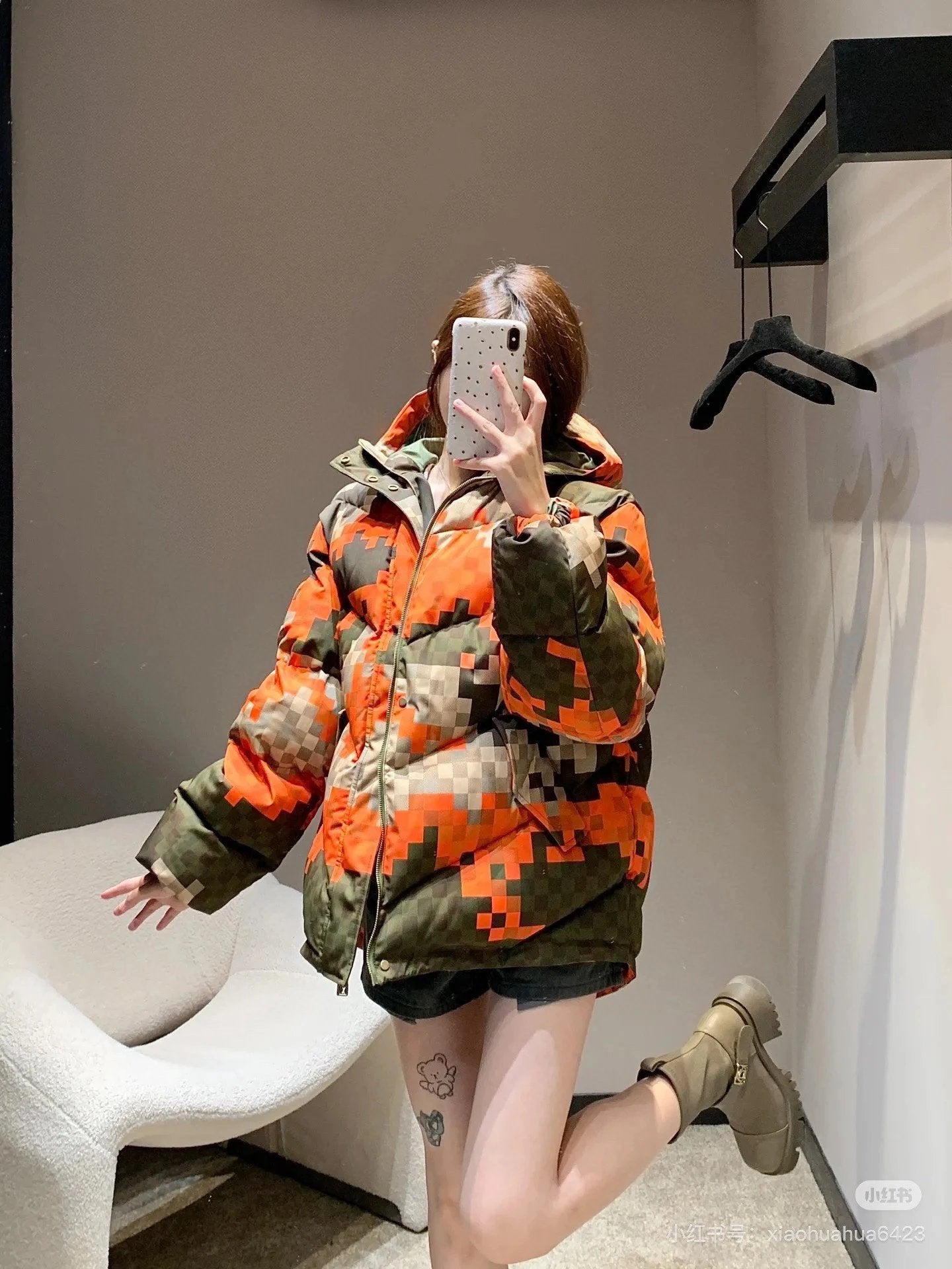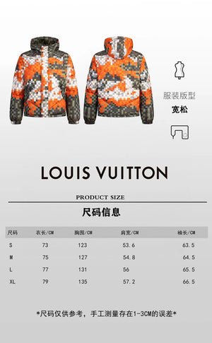Louis Vuitton LV Down Jacket Windproof Waterproof Camouflage Hooded Down Jacket Unisex Fluffy Hooded Long Sleeve Puffer Coat Winter Thickened Warm Loose Versatile Fashionable
